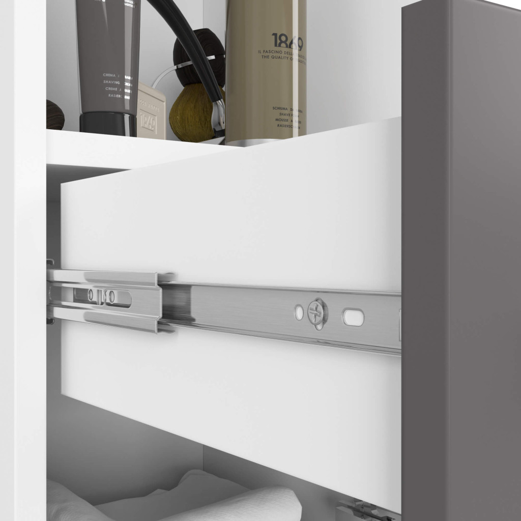 Specificatii tehnice Model: FIN 2D 1SZ 1W Material: PAL laminat Finisaj: Mat Culoare: Alb/Grafit Latime: 30 cm Adancime: 30 cm Inaltime: 140 cm Numar usi: 2 Numar sertare: 1 Numar rafturi: 5 Grosime placa: 16 mm Margine: ABS Functii suplimentare: Posibilitate de montaj suspendat Scurta descriere Dulapul inalt FIN alb/grafit este o alegere practica si eleganta pentru orice baie, indiferent de dimensiune. Ofera spatiu generos de depozitare datorita celor doua usi, sertarului central si rafturilor interioare, fiind ideal pentru prosoape, cosmetice sau produse de curatenie. Designul modern in finisaj mat alb si gri se potriveste perfect atat in bai minimaliste, cat si in interioare clasice. Caracteristici principale Design modern in combinatie de alb si gri grafit Doua usi si un sertar pentru organizare eficienta Rafturi interioare spatioase pentru accesorii de baie Constructie din PAL laminat rezistent la umiditate Margini protejate cu ABS pentru rezistenta suplimentara Manere metalice argintii cu aspect elegant Montaj usor, cu instructiuni incluse Poate fi montat suspendat sau asezat pe podea