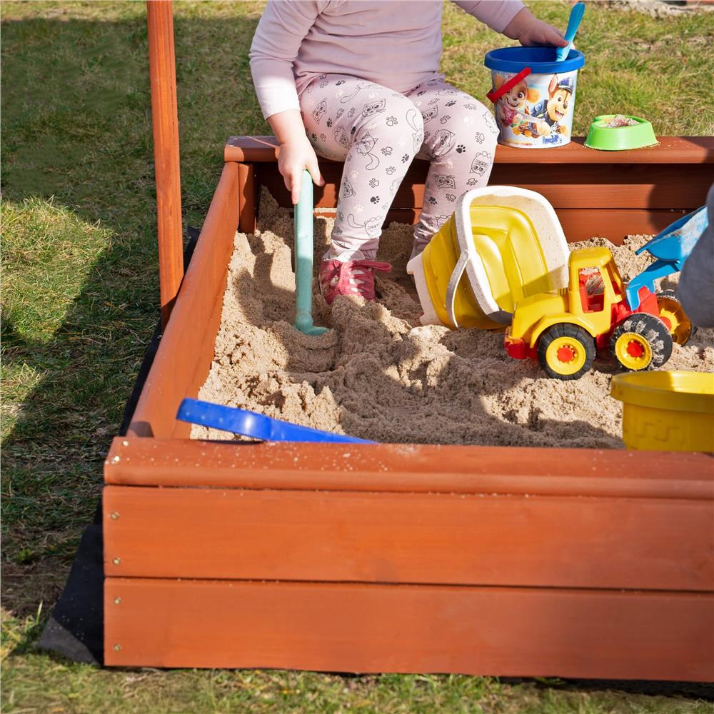 Specificatii tehnice: Tip produs: Lada de nisip cu acoperis si bancute Material: Lemn de conifere + material textil Culoare lemn: Maro (tonuri castaniu) Culoare acoperis: Gri Certificare: CE Potrivit pentru: Copii peste 18 luni Dimensiuni totale: 140 x 140 x 121 cm Inaltime bancuta: 20 cm Inaltime margine fara bancuta: 18 cm Dimensiuni acoperis: 140 x 140 cm Grosime scanduri: 1,8 cm Latime scanduri: aprox. 8,5 cm Latime sezut bancuta: 8,5 cm Capacitate aproximativa: 350 litri Accesorii incluse: Geotextil 1,5 x 1,6 m, set complet de montaj Ambalaj: Pentru montaj propriu, include instructiuni si gauri preforate Scurta descriere: Aceasta lada de nisip robusta din lemn, cu acoperis pliabil si bancute laterale, este solutia ideala pentru joaca in aer liber. Fabricata in Polonia si tratata ecologic, include material textil pentru baza si un acoperis reglabil care protejeaza de soare. Lemnul este vopsit de doua ori si atent finisat pentru siguranta celor mici. Caracteristici principale: Structura solida din lemn masiv tratat cu impregnant ecologic Certificat CE – sigur pentru copii peste 18 luni Bancute laterale comode pentru sezut Acoperis reglabil pe inaltime si inclinare Functie de inchidere prin plierea bancutelor peste nisip Include geotextil pentru baza si kit complet de montaj Design compact si elegant, usor de integrat in gradina Muchii rotunjite pentru siguranta maxima Vopsire dubla pentru rezistenta la uzura si intemperii Capacitate generoasa: 350 litri