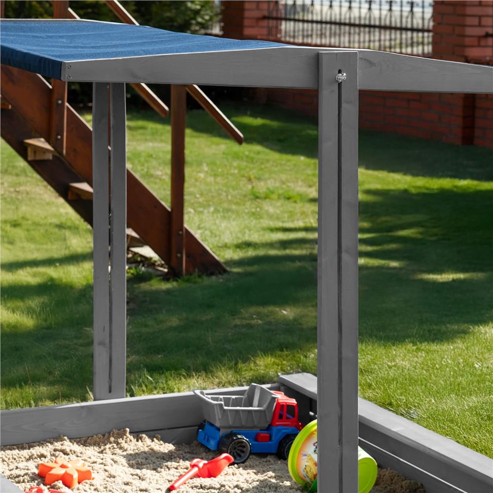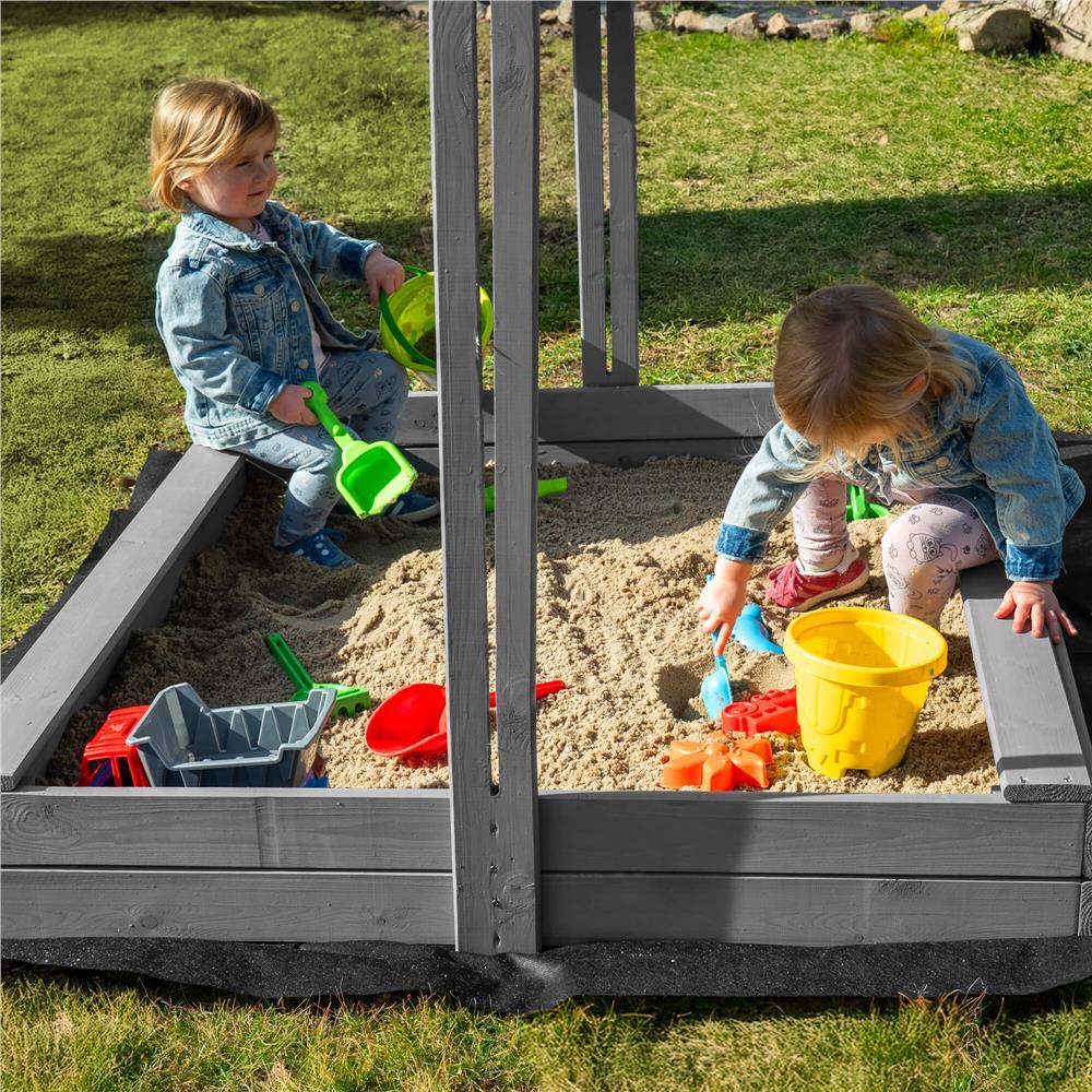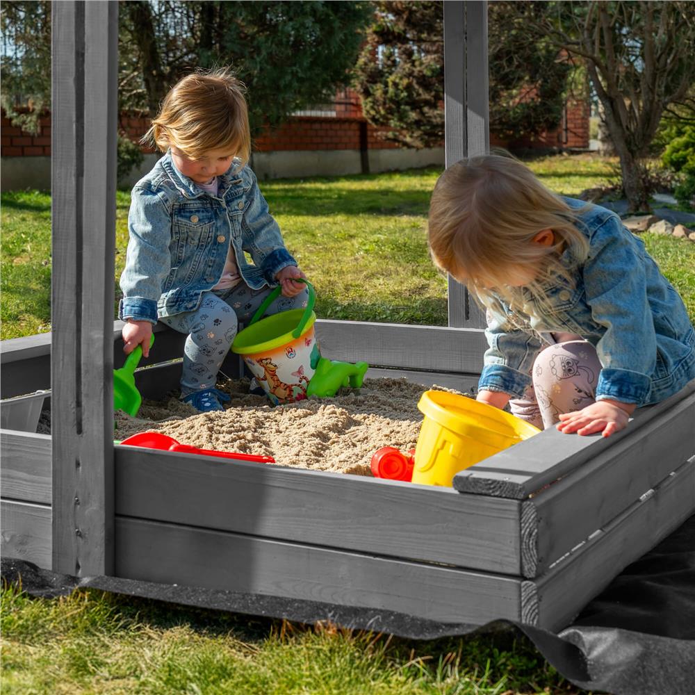 Specificatii tehnice: Tip produs: Lada de nisip cu baldachin si capac Material: Lemn de conifere tratat ecologic Culoare lemn: Gri Culoare acoperis: Albastru inchis Certificare: CE Potrivit pentru: Copii peste 18 luni Dimensiuni exterioare: 120 x 120 x 120 cm Inaltime bancute: 20 cm Dimensiuni baldachin: 120 x 120 cm Grosime scanduri: 1,8 cm Latime scanduri: 8,5 cm Latime sezut: 8,5 cm Dimensiuni geotextil (inclus): 150 x 160 cm Capacitate aproximativa: 240 litri Greutate estimata: ~13-15 kg Accesorii incluse: Geotextil negru, set montaj complet Functii: Acoperis reglabil, inchidere completa, bancute laterale fara spatar Scurta descriere: Aceasta lada de nisip din lemn masiv este alegerea ideala pentru gradina sau curte. Echipata cu baldachin reglabil si bancute laterale, asigura un loc sigur si placut pentru joaca. Poate fi inchisa dupa utilizare pentru a proteja nisipul. Produs fabricat in Polonia, finisat cu grija si certificat CE pentru siguranta copiilor. Caracteristici principale: Lemn tratat ecologic, rezistent la intemperii Acoperis textil ajustabil pentru umbra si protectie Functie de inchidere – capac rabatabil din bancute Include geotextil pentru izolarea solului Marginile sunt rotunjite pentru siguranta copiilor Design compact, usor de integrat in gradina Capacitate de pana la 240 litri de nisip Certificare CE – sigur pentru copii Montaj facil cu gauri preforate Cadou perfect pentru zile de nastere sau vara