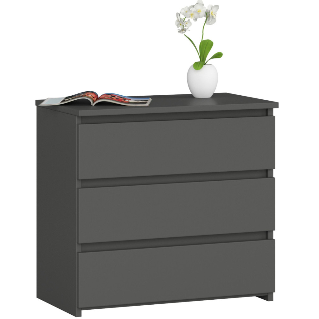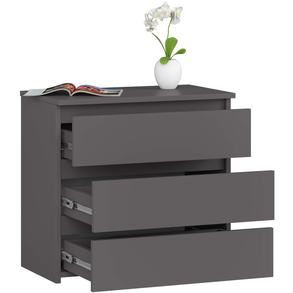 Specificatii tehnice Tip produs: Comoda Model: CL3 3sz Culoare: Grafit gri mat Material: Placa laminata Kronospan 16 mm, rezistenta la uzura Fronturi: Placa laminata, finisaj mat Margini: Protejate cu banda ABS impotriva deteriorarilor Numar sertare: 3 Sine sertare: Metalice, cu glisiere cu bile Dimensiuni: 60 x 35 x 57 cm (L x A x I) Adancime sertar: 30 cm Latime sertar: 51 cm Scurta descriere Comoda in nuanta grafit gri mat imbina aspectul natural al lemnului cu functionalitatea moderna. Textura vizibila, cu fibre si noduri discrete, ofera un design autentic si cald. Cele trei sertare spatioase sunt ideale pentru depozitarea hainelor, lenjeriei sau accesoriilor, iar blatul poate fi folosit pentru o veioza sau decoratiuni. Fabricata din materiale rezistente la uzura, cu margini protejate ABS, comoda este durabila si usor de intretinut. Datorita tonului neutru, se potriveste in orice interior – modern, scandinav sau rustic. Caracteristici principale Design modern si natural Trei sertare spatioase Material rezistent la uzura Kronospan Finisaj mat in nuanta grafit gri Margini protejate cu banda ABS Montaj simplu, instructiuni incluse