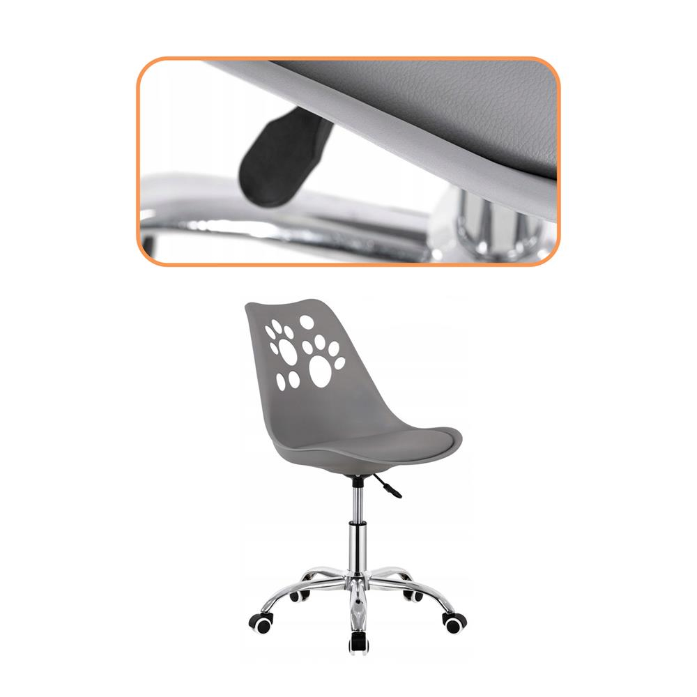 Specificatii tehnice Tip produs: Scaun birou pentru copii Culoare: Gri Dimensiuni totale: 90 h x 48,5 l x 49 a cm (max) / 80 h x 48,5 l x 49 a cm (min) Grosime sezut: 2 cm Inaltime sezut: 42–52 cm Grosime spatar: 0,5 cm Material sezut: Piele ecologica + spuma PU Material spatar/corp: Plastic dur Material baza: Metal cromat Material roti: Plastic dur Diametru baza: 58 cm Diametru roti: 4,5 cm Greutate maxima suportata: 120 kg Scurta descriere Scaunul de birou pentru copii imbina functionalitatea cu un design modern si atractiv. Spatarul cu decupaje decorative in forma de labe de pisica adauga un element jucaus. Stabil si confortabil, este ideal pentru studiu si activitati zilnice. Caracteristici principale Sezut tapitat cu piele ecologica si spuma PU Reglaj pe inaltime pentru adaptare la utilizator Rotire 360° pentru libertate de miscare Baza cromata cu cinci brate stabile Roti rezistente si usor de manevrat Spatar ergonomic pentru sustinere corecta Ideal pentru camera copiilor sau adolescentilor