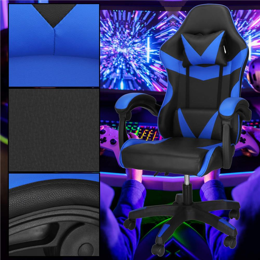Specificatii tehnice    Design:  Ergonomic, rotativ 360°  Dimensiuni totale:  Inaltime 114-123 cm, latime 55 cm, adancime 50 cm  Dimensiuni sezut:  Latime 40-45 cm, adancime 49 cm, grosime 7-11 cm  Inaltime sezut fata de sol:  38-45 cm  Inaltime spatar:  76 cm  Dimensiuni perna tetiera:  24x18 cm, grosime 9 cm  Dimensiuni perna lombara:  31x17 cm, grosime 8 cm  Material:  Plastic, metal, piele ecologica, umplutura spuma  Culoare:  Negru/albastru  Greutate maxima admisa:  120 kg  Baza:  5 brate cu role, diametru role 4,5 cm  Functii:  Reglare inaltime, reglare inclinare spatar, rotire 360°, suport lombar, tetiera detasabila   Scurta descriere   Scaun ergonomic pentru gaming si birou, conceput pentru confort si sustinere optima in timpul jocurilor sau al lucrului. Dispune de reglaj pe inaltime, inclinare a spatarului si doua perne detasabile pentru zona cervicala si lombara. Baza stabila cu 5 brate si role rezistente asigura mobilitate si durabilitate.   Caracteristici principale    	 Design ergonomic pentru sustinerea posturii  	 Reglaj inaltime si inclinare spatar  	 Rotire 360° pentru mobilitate sporita  	 Sezut confortabil cu umplutura groasa din spuma  	 Material usor de curatat  	 Baza solida cu role rezistente  	 Potrivit pentru gaming si birou