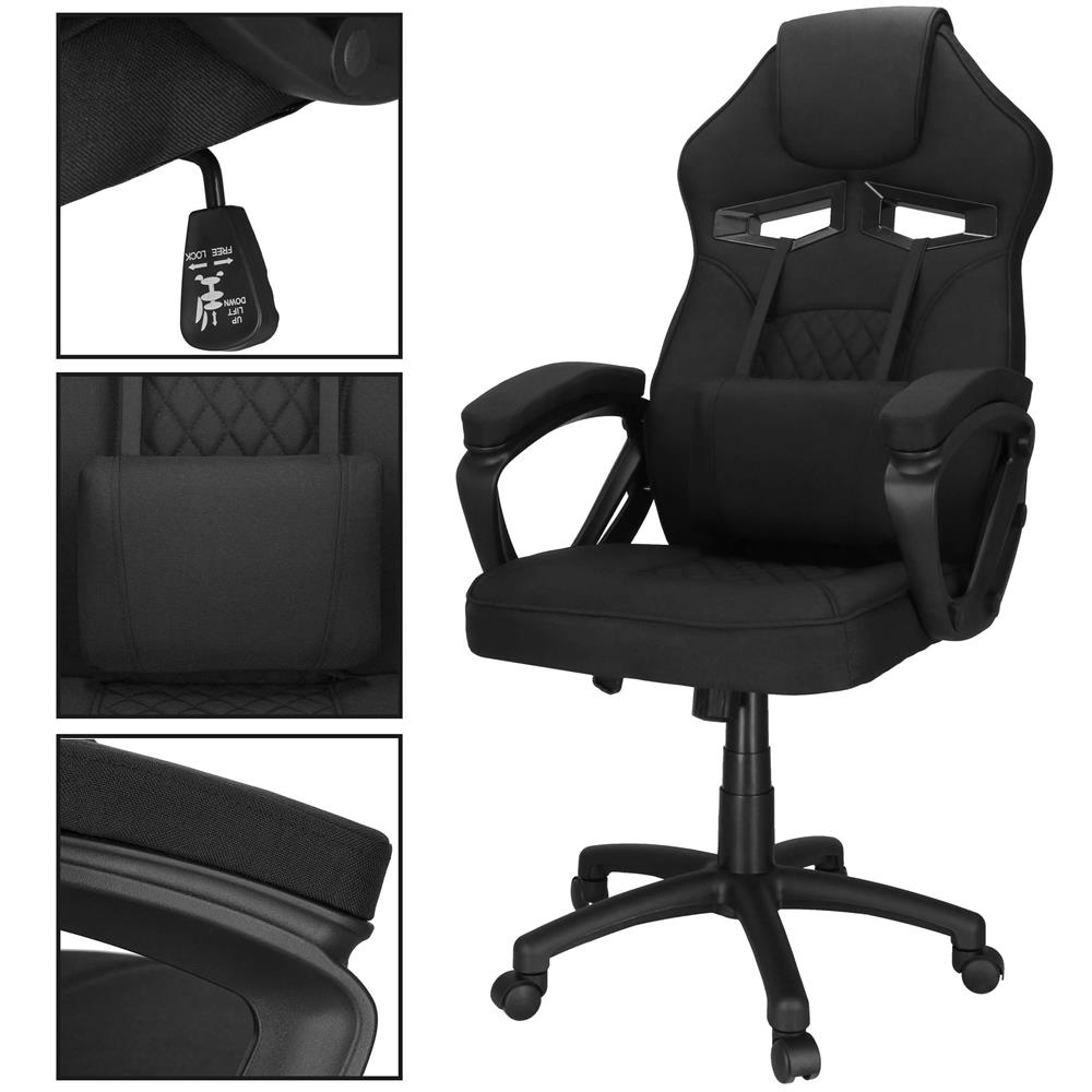 Specificatii tehnice: Culoare: Negru Material tapiterie: Tesatura HDF Material umplutura: Spuma elastica HR Material baza: Polimer durabil Montaj: Produs pentru asamblare individuala (include instructiuni) Roti: Da, incluse Perna lombara: Inclusa Capacitate maxima: 150 kg Dimensiuni: – Inaltime totala: max. 125 cm / min. 116 cm – Latime totala: 59 cm – Adancime totala: 52 cm – Inaltime sezut: max. 45 cm / min. 36 cm – Latime sezut: 52 cm – Adancime sezut: 48 cm – Grosime sezut: 7–8 cm – Inaltime spatar: 73 cm – Latime spatar: 52 cm – Lungime brate: 39 cm – Inaltime brate fata de sezut: 20 cm – Dimensiuni tetiera: 22x23 cm (grosime 2 cm) – Dimensiuni perna lombara: 29x20x7 cm – Diametru baza: 60 cm – Diametru roti: 4,5 cm Informatii suplimentare: – Perna lombara detasabila cu fermoar pentru curatare sau inlocuire umplutura – Baza stabila cu 5 brate si roti pivotante 360° – Reglaj pe inaltime – Functie de balans pentru confort suplimentar Scurta descriere: Scaunul de birou ergonomic ofera confort sporit in timpul lucrului datorita formei anatomice si pernei lombare integrate. Tesatura respirabila si spuma HR asigura sustinere optima chiar si la utilizare indelungata. Cu baza solida si functie de balans, este alegerea ideala pentru birou sau spatiul de lucru de acasa. Caracteristici principale: Design ergonomic pentru sustinerea spatelui Functie de balans si reglaj pe inaltime Perna lombara detasabila si tetiera integrata Materiale rezistente si usor de curatat Baza stabila cu 5 roti pivotante 360°