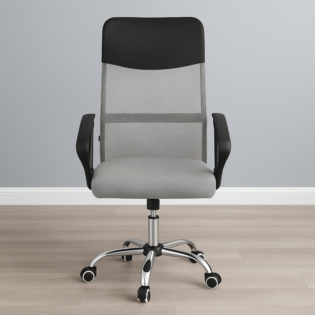Specificatii tehnice Culoare: gri deschis, negru Material: metal, plastic, textil tip mesh, ecopiele Rotativ 360°: da Reglaj inaltime:  da Greutate maxima suportata: 120 kg Dimensiuni totale: 58x60x117 cm Dimensiuni reglabile: inaltime totala 107-117 cm Dimensiuni sezut: 47x50 cm, grosime 6 cm Dimensiuni spatar: 46x66 cm, grosime 1,7 cm Baza: 5 brate, diametru 59 cm, roti 4,5 cm Scurta descriere Scaunul de birou ergonomic combina designul modern cu functionalitatea. Sezutul tapitat si spatarul din material tip mesh si ecopiele ofera confort si sustinere, iar reglajul pe inaltime si rotirea 360° il fac ideal pentru utilizare zilnica acasa sau la birou. Caracteristici principale Design modern si ergonomic Sezut tapitat cu umplutura Rotire 360° Baza metalica stabila cromata Sustinere pana la 120 kg Potrivit pentru birou, casa sau studio moale Spatar din material tip mesh si ecopiele Reglaj pe inaltime