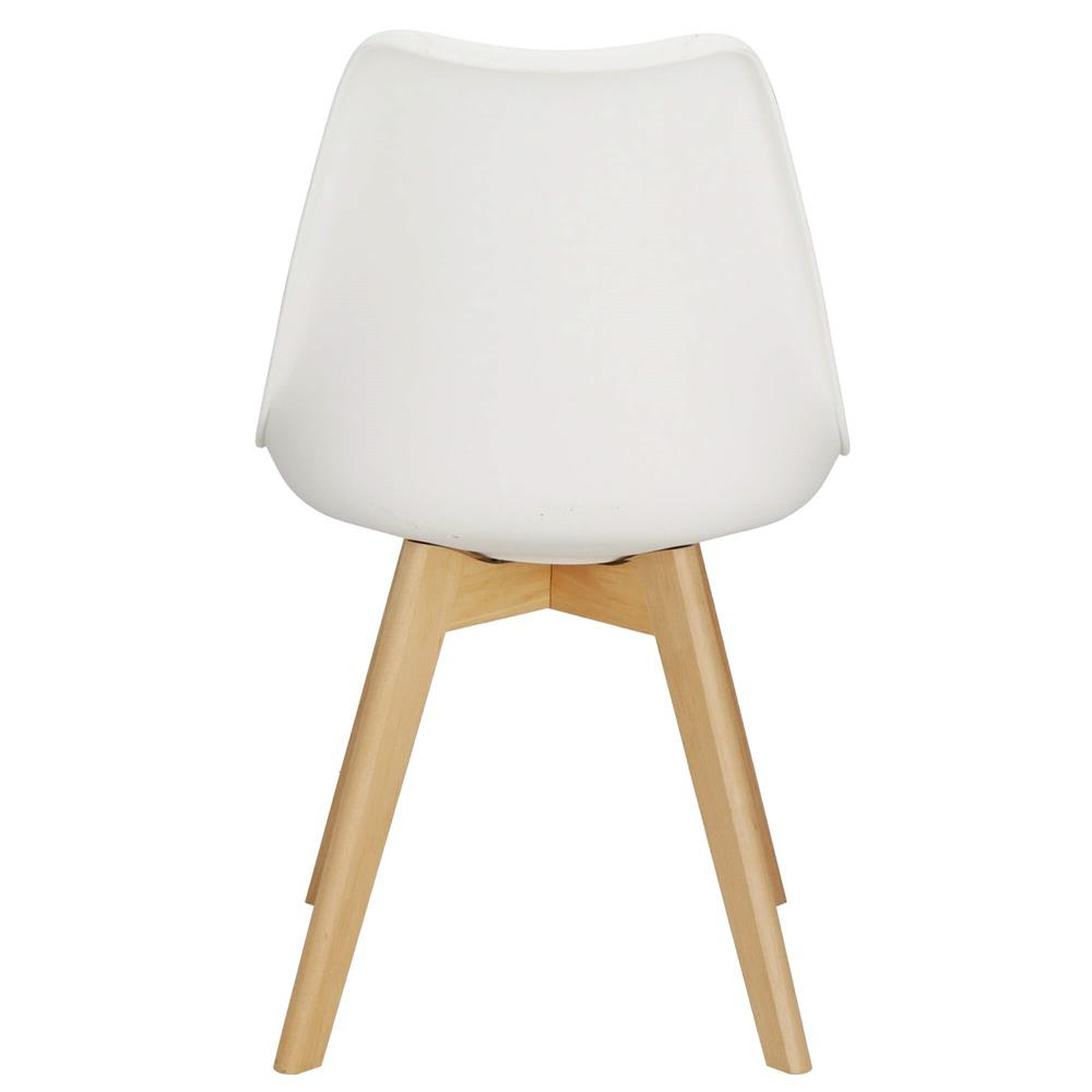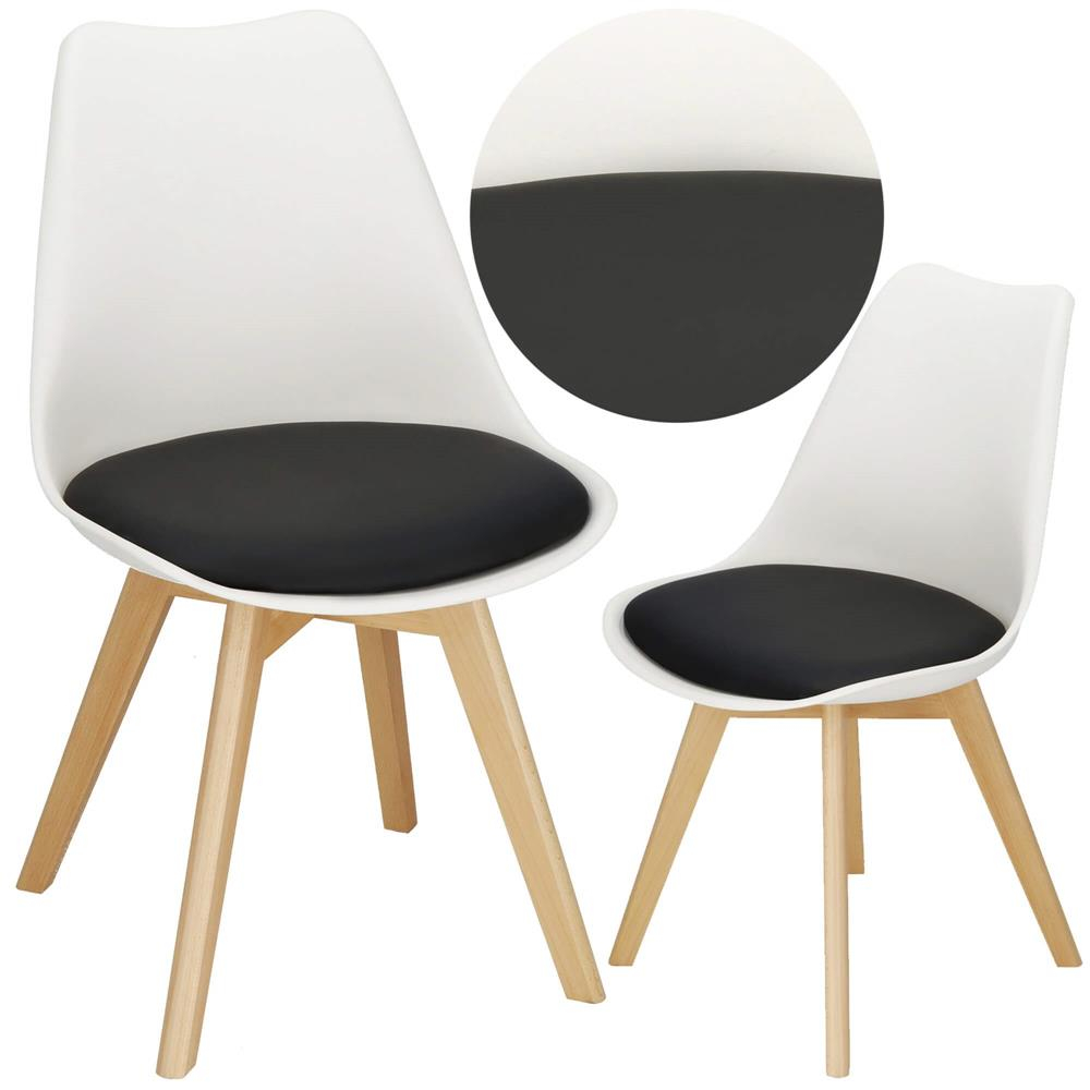 Date de baza:  	 Material: PP / lemn / piele ecologica   	 Culoare: alb / negru / maro  	 Capacitate maxima de incarcare: 125 kg  	 Informatii suplimentare: tapitat, perna moale pe scaun  	 Toate componentele si instrumentele de asamblare sunt incluse  	 Huse din pasla pentru partea inferioara a picioarelor incluse (x4)  	 Dimensiuni:  	 Inaltime totala: aproximativ 80 cm  	 Inaltimea spatarului: aprox. 38 cm  	 Latimea spatarului in cel mai larg punct: 46 cm  	 Latimea spatarului in cel mai ingust punct: cm: 46 cm 31 cm  	 Latimea scaunului: 48 cm  	 Latimea pernei: 44,5 cm  	 Adancimea scaunului: 42 cm  	 Adancimea pernei: 37 cm  	 Inaltimea de la sol la scaun: 43,5 cm  	 Distanta dintre picioare in latime: 36 cm  	 Distanta dintre picioare in adancime: 34 cm  	 Diametrul picioarelor: 36,5 mm  	 Grosimea pernei tapitate: 1 cm  	 Grosimea scaunului: 1 cm: 2 cm   Scaunul este alegerea perfecta pentru orice camera, living sau bucatarie! Culorile discrete si elegante ale scaunului combinate cu picioarele din lemn creeaza un intreg coerent. Datorita universalitatii sale, scaunul se combina perfect cu restul accesoriilor.   	 Design scandinav modern  	 Perna moale, tapitata pe scaun  	 Culori discrete combinate cu lemn atemporal  	 Forma ergonomica  	 Calitate inalta a manoperei  	 Detalii extrem de rafinate  	 Usor de curatat  	 Merge perfect cu restul accesoriilor  	 Utilizare universala : dormitor, bucatarie, living, sufragerie   Scaunele scandinave nu sunt doar elegante in design, ci au si o abordare practica a confortului . Echipate cu o perna moale pentru scaun , ofera nu numai estetica, ci si un confort exceptional de utilizare. Aceasta trasatura subtila face din scaunele scandinave un loc preferat pentru a se aseza, combinand eleganta cu placerea utilizarii.  Scaunul este realizat din cele mai potrivite materiale care sunt perfecte pentru living sau bucatarie. In primul rand, scaunul este foarte usor de curatat , puteti scapa cu usurinta de murdaria mai dificila. Forma ergonomica este responsabila pentru confortul in timpul utilizarii, de exemplu la un birou cand lucrezi de la distanta.  Scaunele scandinave sunt chintesenta simplitatii si elegantei care se potrivesc perfect in orice interior . Lemnul lor deschis si designul ergonomic le fac sa se potriveasca perfect pentru bucatarie, sufragerie, dormitor , bar sau restaurant. Nu este doar mobilier, este o alegere care combina stilul cu functionalitatea , dand fiecarui spatiu un caracter unic .  Exista capete din plastic pe partea inferioara a picioarelor , care protejeaza lemnul de contactul cu podeaua. Nu trebuie sa va faceti griji ca va umeziti picioarele, ceea ce le poate dauna.