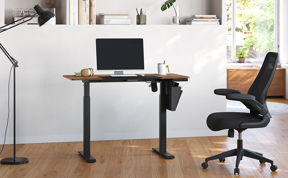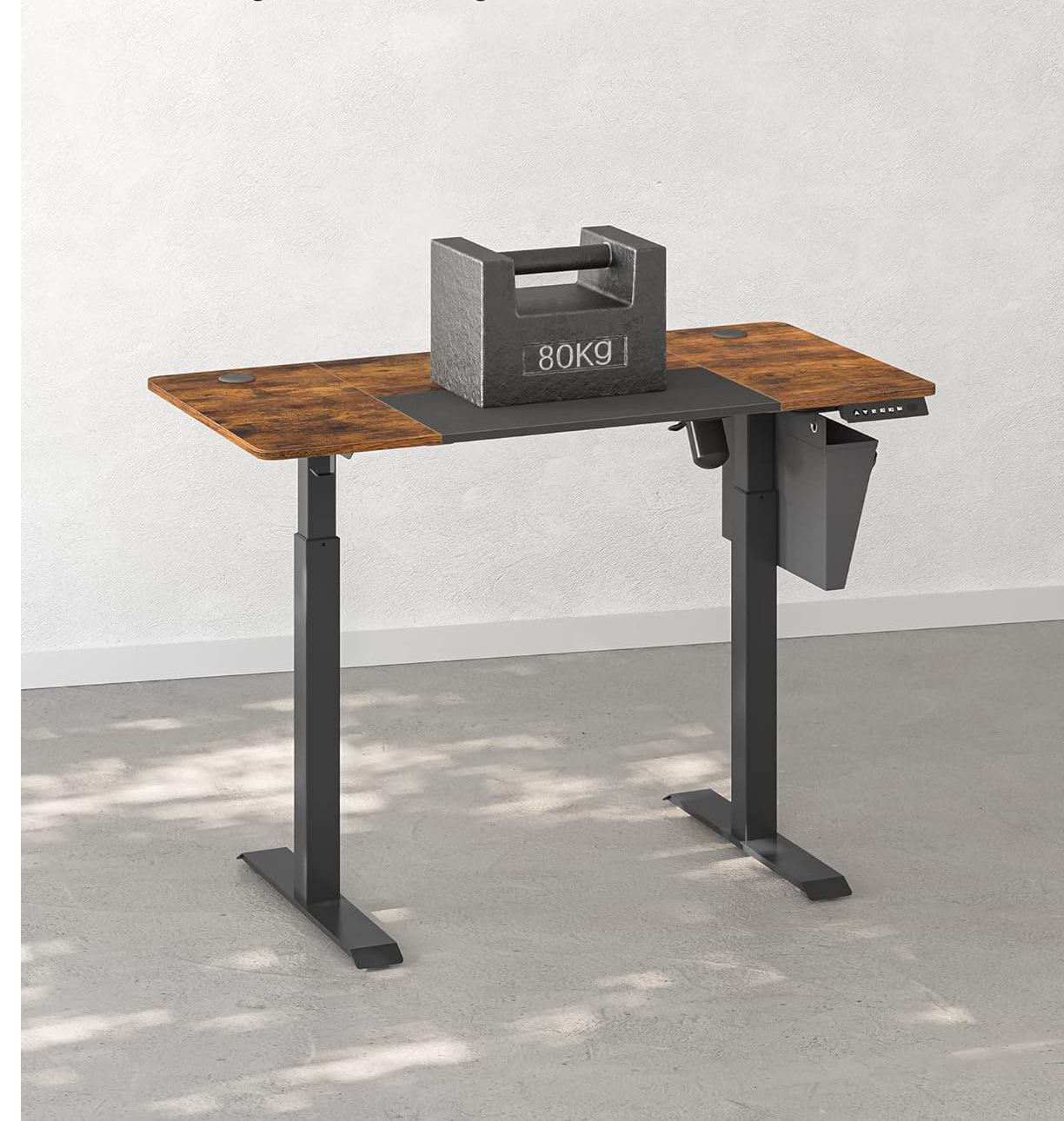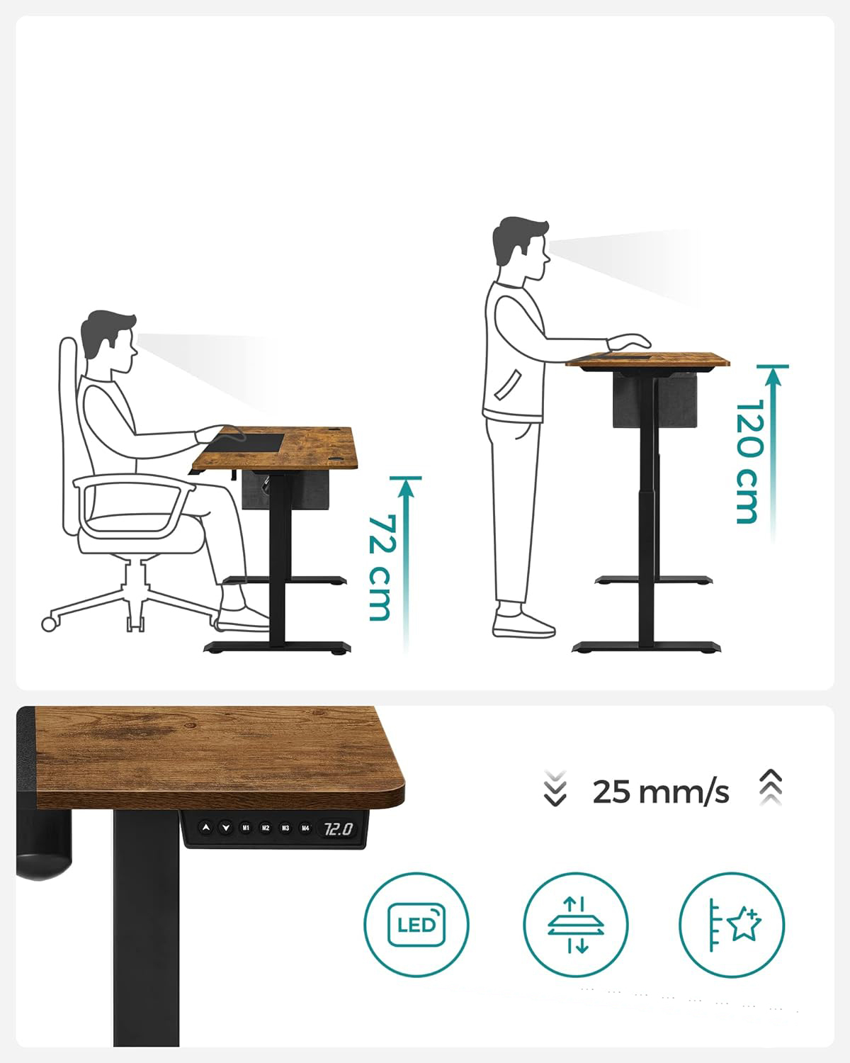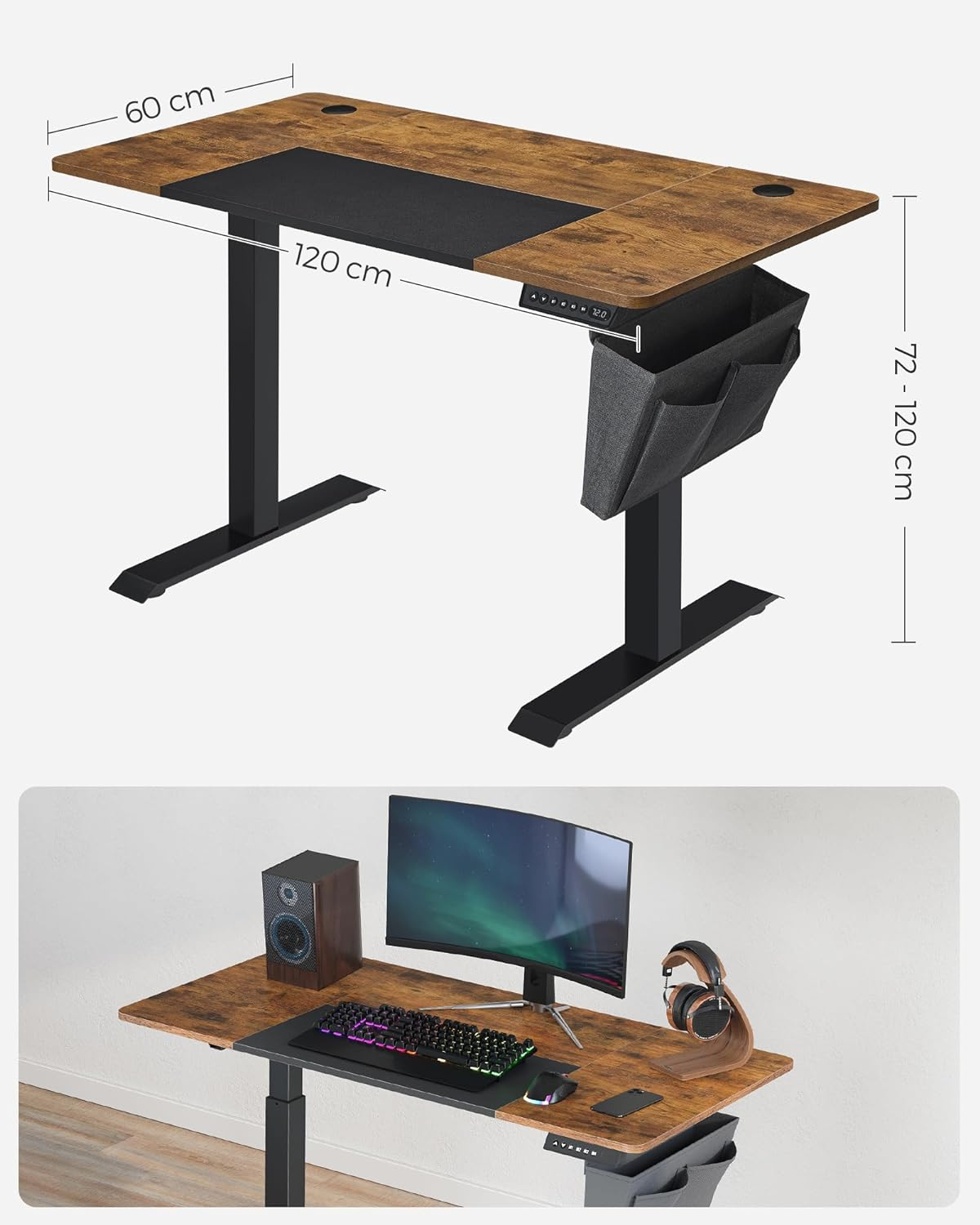 Detalii produs: Culoare: Vintage maro-negru Material: Placi aglomerate din lemn, otel, tesatura netesuta Dimensiuni: 120 x 60 x (72-120) cm. Grosimea blatului mesei: 1,5 cm. Greutate: 25,5 kg. Max. Capacitate de incarcare: 80 kg Despre acest articol Puteti regla inaltimea biroului electric intre 72 si 120 cm si puteti stoca 4 inaltimi preferate. Exista, de asemenea, un sistem de protectie la clatinare.Buzunar textil pe partea stanga sau dreapta pentru carti, reviste si multe altele, 3 carlige pentru casti si genti, 2 prize pentru o buna gestionare a cablurilor.Placa imbinata in maro vintage si negru de baza confera acestui suport de birou mai mult stil, iar textura asemanatoare tesaturii din zona neagra de baza a blatului ofera o senzatie de confort.Piesele marcate si instructiunile ilustrate usor de urmat asigura o asamblare fara efort. Astfel, puteti gasi un stil de lucru flexibil in cel mai scurt timp!Acest birou electric cu cadru solid din otel care poate sustine pana la 80 kg; un blat de masa linistit cu un zgomot de functionare mai mic de 50 dB.