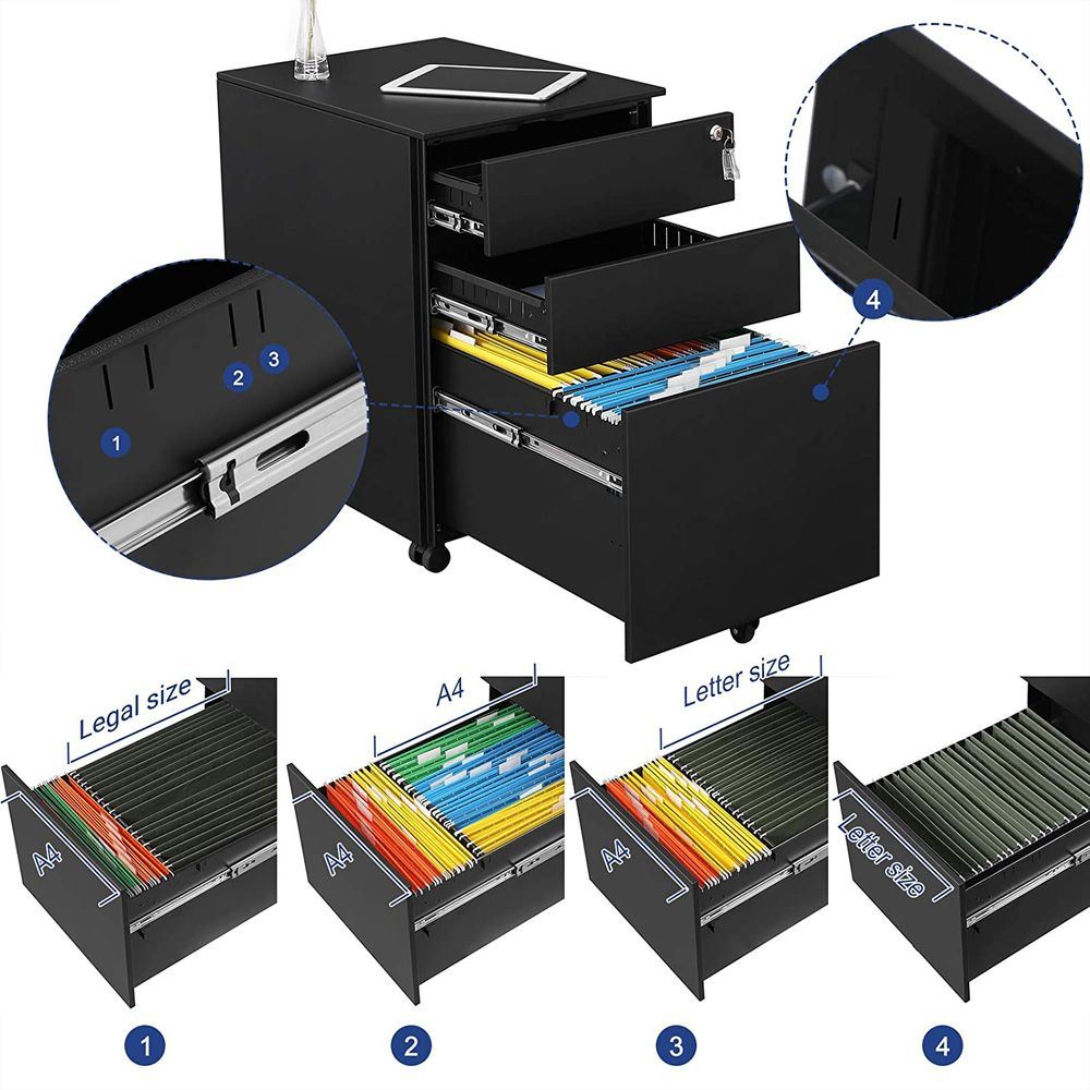 Cu acest dulap va puteti depune acum actele in cele 3 sertare si puteti depozita rechizite in organizator. In plus, datorita incuietorilor, nu va trebui sa va faceti griji pentru obiectele dvs. de valoare. Caracteristici:   	 Culoare: Negru  	 Material: Otel  	 Dimensiuni: 39 x 52 x 60 cm (L x l x i)  	 Capacitate maxima de incarcare statica a celor 2 sertare de sus: 15 kg  	 Capacitatea maxima de incarcare statica a sertarului inferior: 20 kg   Note:   	 Va rugam sa nu depasiti aceasta greutate maxima per sertar.  	 Copiilor le este interzis sa se urce pe produs sau sa se joace cu acesta pentru a evita ranirea cauzata de rasturnarea.     Despre acest articol  Toate intr-un singur loc:  Acest dulap (52 x 39 x 60 cm) ofera mult spatiu de depozitare, dar ocupa foarte putin spatiu. Puteti stoca fisiere in diferite formate (format A4, letter sau legal) in cele 3 sertare. Fara probleme de durabilitate:  Fabricat din otel, aceast dulap este foarte rezistent. Cele 2 sertare superioare suporta pana la 15 kg fiecare. Sertarul de jos mare suporta pana la 20 kg. Cu ghidajele cu extensie completa premium, sertarele pot fi scoase cu usurinta chiar si sub sarcini grele. Dulapul de dosar este echipat cu 5 roti pentru a putea fi mutat cu usurinta oriunde. Desing minimalist:  Spre deosebire de dulapurile mai vechi, acesta este proiectata fara maner, oferindu-i un aspect modern si minimalist. Sertarele pot fi extrase fara probleme din lateral datorita glisierelor de inalta calitate. Incuietoarea de calitate securizeaza sertarul de sus pentru a va pastra documentele secrete de ochii curiosilor. Deja pre-asamblat:  Acest dulap de birou vine pre-asamblat, astfel incat sa nu va petreceti intreaga dupa-amiaza de duminica cu o asamblare complicata. Tot ce trebuie sa faceti este sa insurubati rolele.