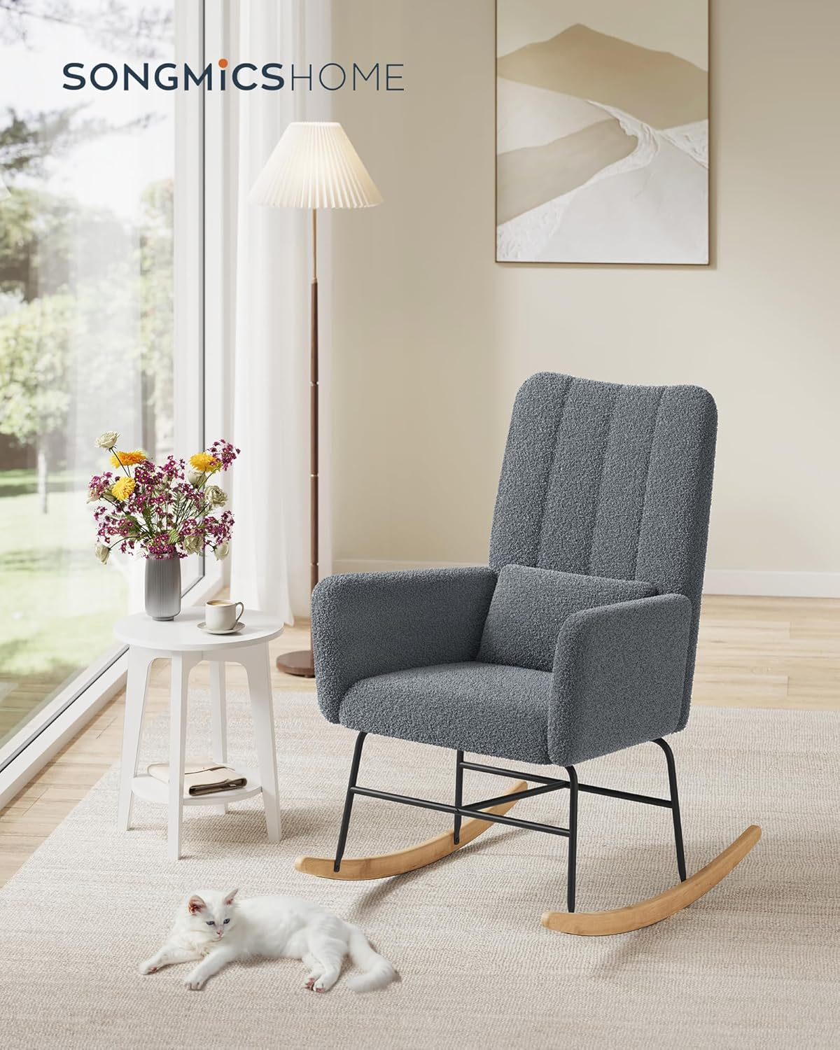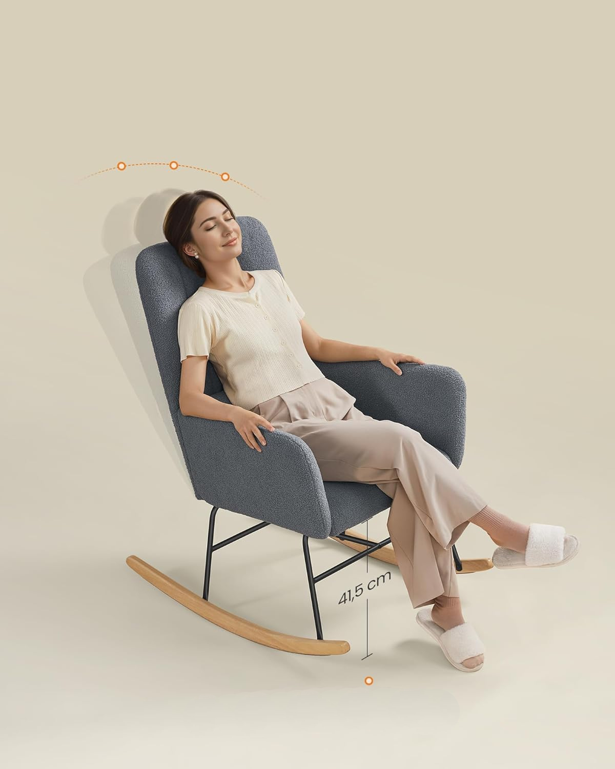 Specificatii tehnice    Brand:  SONGMICS  Model:  LYY500G01  Material cadru:  Otel aliat  Material picioare:  Lemn de cauciuc  Material sezut:  Fleece cu umplutura groasa  Culoare:  Gri   Capacitate de incarcare:  136 kg  Unghi balansare:  105°  Spatar:  Fix, design solid  Caracteristica speciala:  Protectii la picioare impotriva zgarieturilor   Scurta descriere   Fotoliul balansoar SONGMICS aduce relaxare si confort in orice incapere. Conceput cu un cadru solid din otel si picioare din lemn de cauciuc, sustine pana la 136 kg. Suprafata din fleece moale si bratele confortabile asigura o experienta placuta la citit, odihna sau relaxare. Cu un unghi de balans de 105°, se integreaza perfect in dormitor, living sau birou.   Caracteristici principale    	 Fotoliu balansoar modern cu design elegant  	 Suprafata moale din fleece si umplutura groasa  	 Brate confortabile pentru sprijin suplimentar  	 Structura solida: cadru otel + picioare lemn de cauciuc  	 Unghi de balansare 105° pentru relaxare  	 Capacitate de sustinere pana la 136 kg  	 Protectii la picioare pentru a evita zgarieturile  	 Potrivit pentru dormitor, living sau birou  	 Montaj simplu cu piese marcate si instructiuni clare