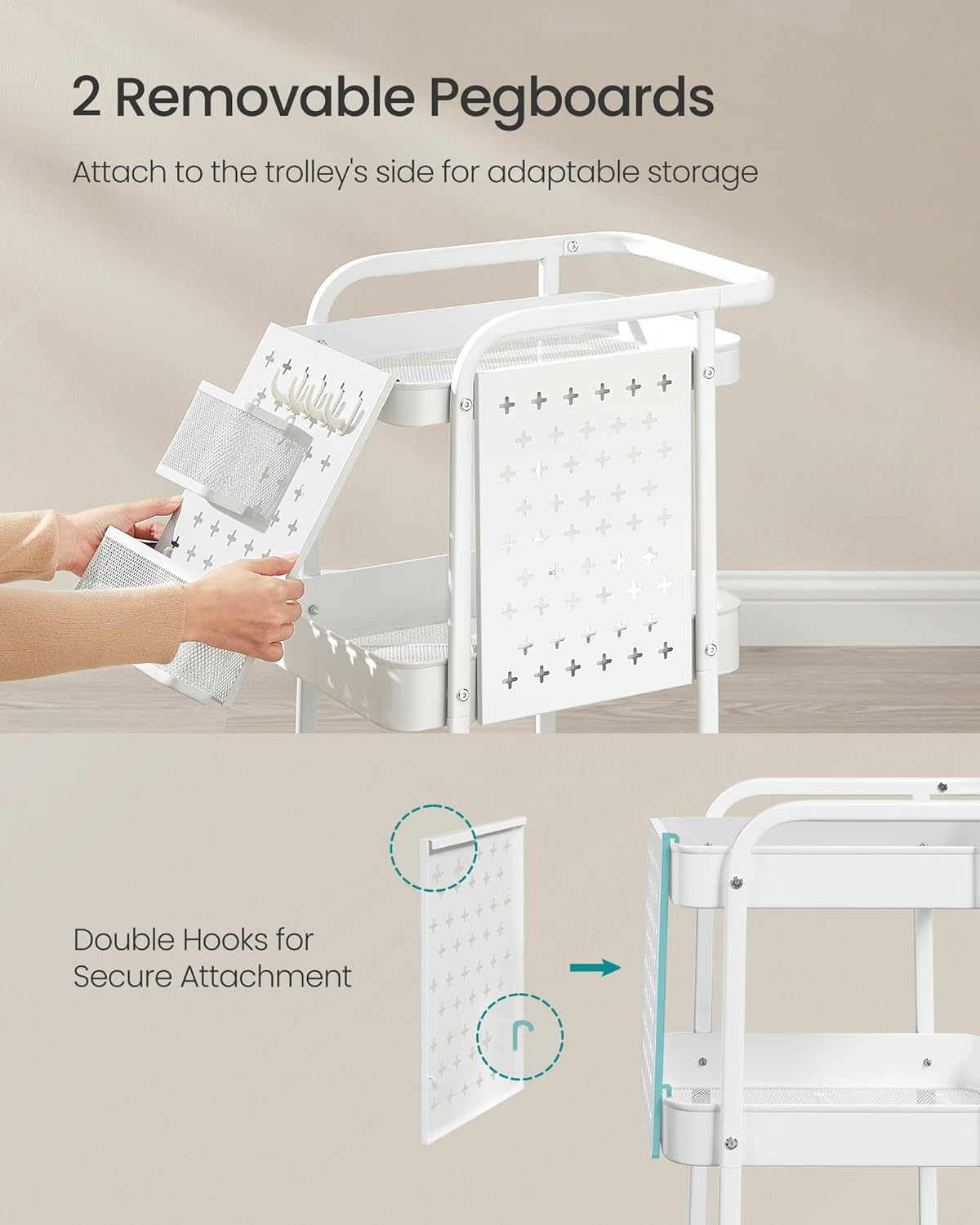 Specificatii: Culoare: Alb Material: Otel Dimensiunea produsului: 32.3 x 43.3 x 73.9 cm Max. Capacitate de incarcare statica pe nivel: 10 kg Max. Capacitate de incarcare statica totala: 30 kg Note: Va rugam sa nu depasiti capacitatea de greutate de 30 kg. Aveti grija cand va deplasati pe suprafete neuniforme pentru a evita rasturnarea. Asamblati produsul urmand instructiunile, evitand dezasamblarea violenta. Nu depozitati si nu agatati obiecte supraponderale pentru a preveni rasturnarea produsului.   Despre acest articol Puternic si durabil: Fabricat din otel premium, acest carucior de depozitare are 3 rafturi cu plasa metalica, fiecare sustinand pana la 10 kg. Constructia sa robusta asigura durabilitate indelungata pentru nevoile dvs. diverse de depozitare. Carlige de agatare: Echipat cu 2 suporturi metalice de agatat si 4 carlige, acest carucior utilitar va ajuta sa va pastrati uneltele si alte obiecte mici organizate si la indemana, perfect pentru mentinerea unui spatiu ordonat.2 panouri detasabile de prindere pot fi atasate la orice parte a caruciorului rulant. Suporturile de agatat si carligele pot fi, de asemenea, repozitionate liber pe pegboards, oferind o solutie de depozitare personalizabila. Utilizare versatila: Utilizati acest carucior de depozitare ca un carucior de arta, carucior de baie, carucior de bucatarie, carucior de artizanat, carucior de serviciu, raft de depozitare sau carucior de unelte. Ideal pentru utilizare in diverse spatii. Mobilitate usoara: Cu patru roti pivotante la 360 °, dintre care doua au frane, acest carucior de depozitare se poate deplasa usor si se poate bloca in loc atunci cand este necesar. Manerul superior va permite sa mutati unitatea de depozitare oriunde aveti nevoie de ea.