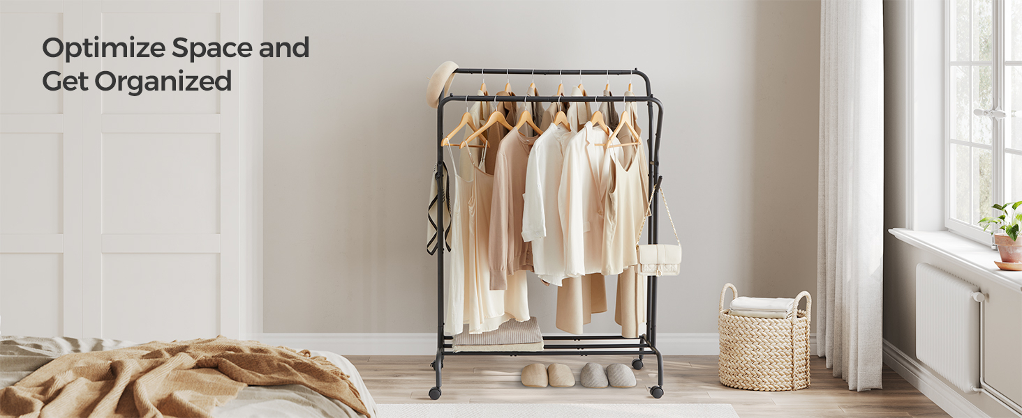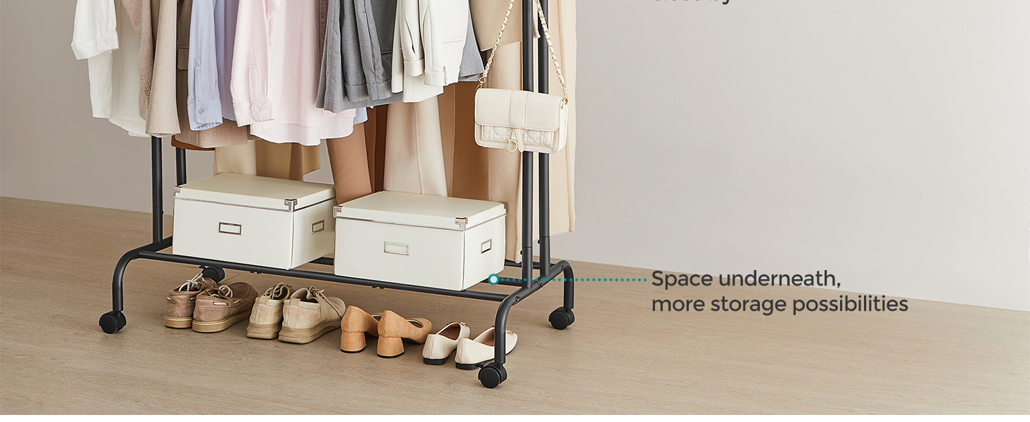 Culoare: Negru Material: Otel aliat, metal Dimensiunile produsului: 52,5D x 103,5W x 155H centimetri Despre acest articol Depozitare versatila: Cu o sina inalta si o sina joasa pentru agatarea hainelor de diferite lungimi, carlige pe ambele parti pentru genti si palarii si un raft de jos pentru cutii si pantofi, acest suport pentru haine pastreaza toate lucrurile esentiale intr-un singur loc Uscare rapida si acces usor: Distanta de 42 cm dintre cele 2 sine pentru agatat haine permite aerului sa curga cu usurinta, promovand uscarea rapida. Ofera o zona mare de agatat pentru a preveni hainele aglomerate si dezordonate, facandu-le mai usor de accesat Usor de mutat si blocat: Glisati fara efort sina dubla pentru haine in orice camera din casa datorita celor 4 roti pivotante. 2 dintre roti sunt blocabile, asa ca puteti pastra si rack-ul intr-un singur loc Stable si puternic: Cu suruburi care fixeaza tuburile de otel cu grosimea de 25,4 mm, acest suport pentru haine are un cadru stabil care poate sustine pana la 100 kg. Fiecare sina are un max. capacitate de incarcare statica de 30 kg; fiecare carlig pana la 5 kg; iar raftul de jos poate sustine pana la 20 kg Asamblare usoara: Structura sa simpla, piesele numerotate si instructiunile ilustrate usor de citit fac ca instalarea acestei sine de haine rezistente sa fie o usoara