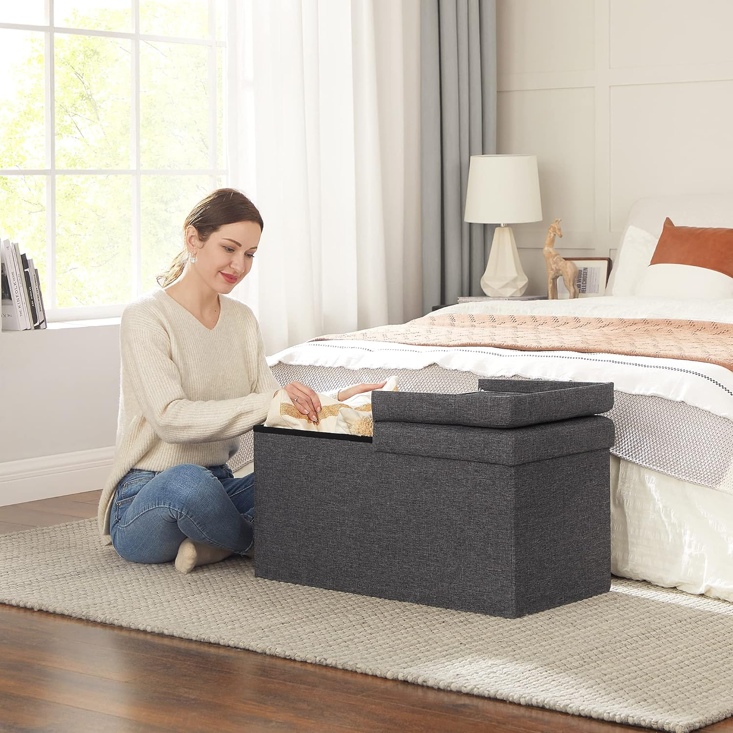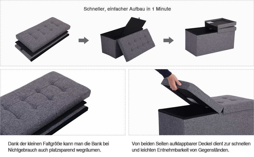 Dimensiunile produsului: 76 x 38 x 38 cm; Greutatea maxima recomandata: 300 de kilograme Material: MDF Despre acest articol Banca pliabila cu capac rabatabil - Capacul este rabatabil din ambele parti, convenabil si rapid pentru a scoate sau a introduce articole fara a scoate intregul capac. Cand nu este folosit, il puteti plia si depozita pentru a economisi spatiu.Spatiu mare de depozitare – scaunul cu interior de 80 L ofera suficient spatiu pentru depozitarea oglinzilor, perne, paturi, haine, reviste etc.Capacitate mare de incarcare si confort excelent al scaunului – Capacitate de incarcare statica: 300 kg, 2 persoane se aseaza lejer pe el, tapiteria din faux-in gri inchis asigura o senzatie buna de asezare si se potriveste perfect cu toate stilurile de casa.Solida si durabila - Banca din panouri MDF (clasa E1) asigura o stabilitate ridicata, ca piesa de mobilier indispensabila, serveste perfect ca banca pentru pantofi, suport pentru picioare sau canapea extensibila.Usor de asamblat si versatil - asamblare rapida in 1. Min. Datorita celor 3 parti simple, ideale pentru living, dormitor, vestiar sau hol.