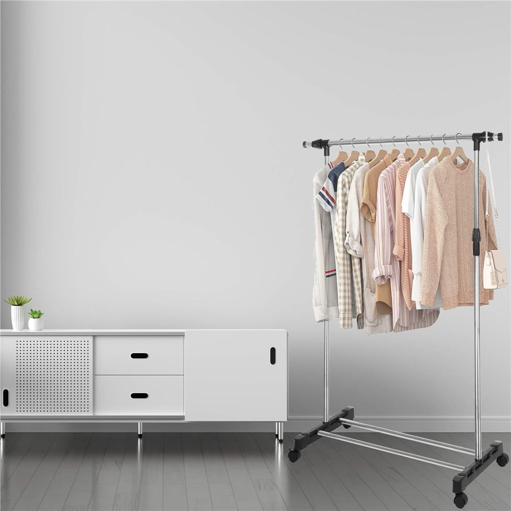 Material: aluminiu + plastic  	 Culoare: argintiu + negru  	 Sarcina maxima: 15 kg (distribuit uniform)  	 Numar de roti de baza: 4 (blocabile)  	 Numar de tuburi suspendate: 1  	 Numar de tuburi la baza: 2  	 Marimea:  	 Inaltime totala: 94 - 160 cm  	 Lungime totala: 150 - 85 cm  	 Latime totala: 45 cm   Datorita structurii sale telescopice, cuierul nostru ofera flexibilitatea de a se adapta nevoilor dumneavoastra. Inaltimea reglabila ( de la 160 la 94 cm ) si lungimea ( de la 150 la 85 cm ) permit o utilizare optima a spatiului disponibil din garderoba sau camera dumneavoastra.   	 Durabilitate exceptionala – 15 kg  	 Mobilitate si usurinta in miscare - 4 roti  	 Structura telescopica - inaltimea si latimea reglabila  	 Design practic - tub superior pentru umerase, tuburi inferioare pentru pantofi  	 Asamblare usoara si rapida  	 Utilizare universala - il poti folosi pentru a usca rufele   Datorita celor patru roti amplasate pe baza, cuierul nostru este extrem de usor de mutat. In plus, capacitatea de a bloca rotile garanteaza stabilitate si utilizare in siguranta, chiar si pe suprafete neuniforme.Cu un tub pentru agatat hainele si doua tuburi la baza pe care le poti folosi pentru a pune pantofii, cuierul nostru ofera suficient spatiu pentru a depozita haine de diferite dimensiuni si lungimi. In plus, designul simplu si elegant permite umerasului sa se integreze perfect in orice interior.