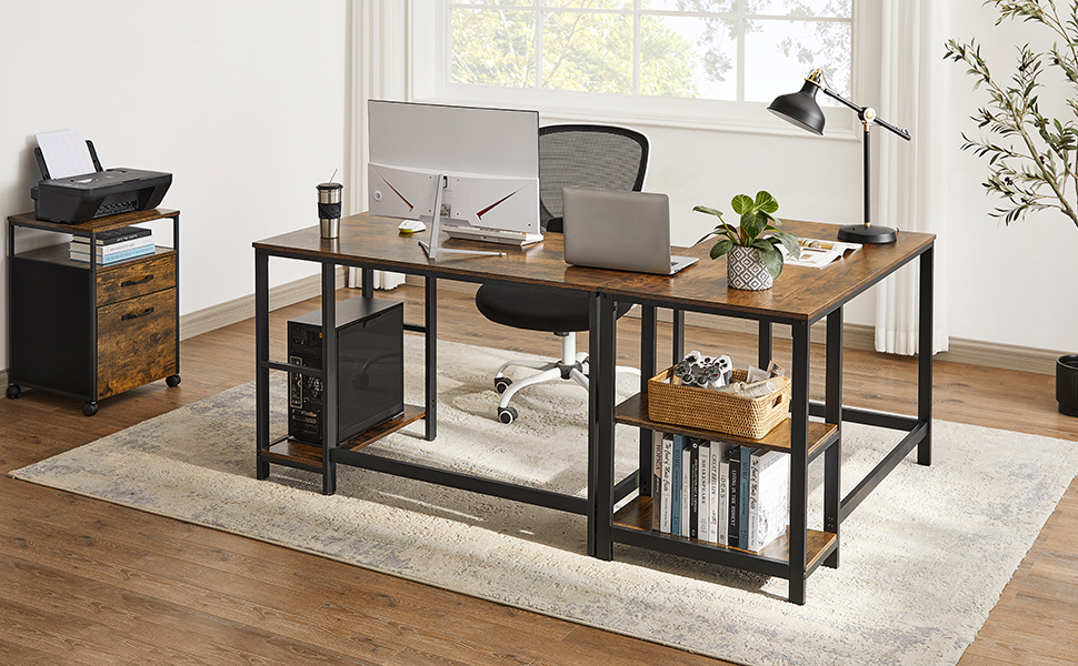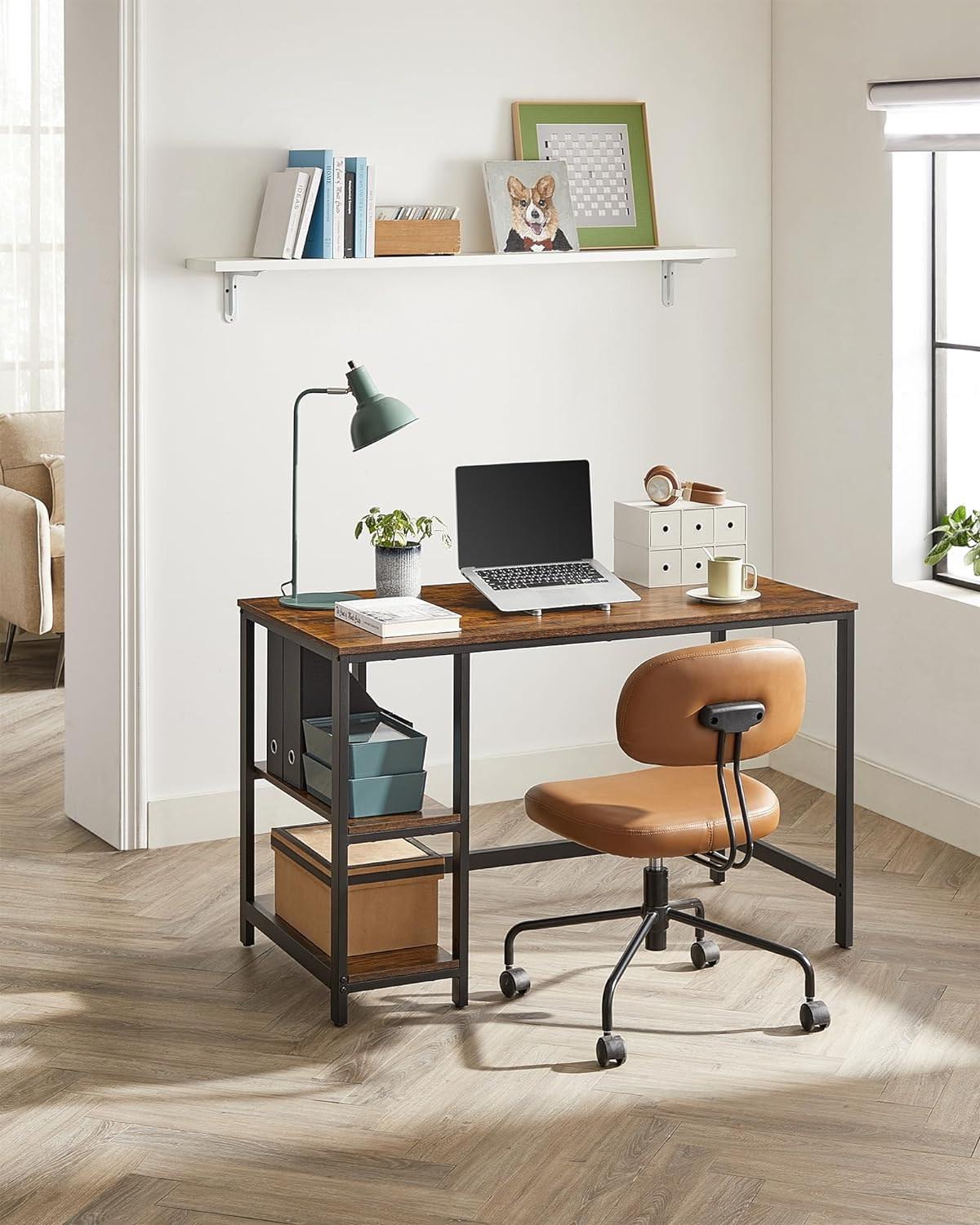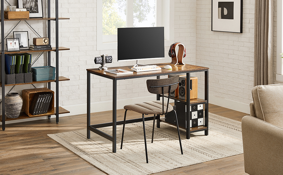 Marca: VASAGLE  	 Dimensiuni produs: 60D x 120L x 75H cm  	 Culoare: maro rustic + negru  	 Stil: industrial  	 Material de baza: Otel aliat    Despre acest articol Rafturi de depozitare flexibile: 2 rafturi de depozitare, dintre care unul este detasabil, pot fi instalate in dreapta sau in stanga, dupa cum aveti nevoie. In plus, puteti indeparta raftul din mijloc pentru a va potrivi turnul de calculator sau il puteti pastra pentru a depozita carti, fisiere sau alte obiecte utilizate frecvent.Spatiu mare pe birou: Cu un birou de 60D x 120W cm, acest birou de calculator gazduieste 2 monitoare de calculator, o tastatura si alte elemente esentiale pentru birou, oferindu-va in acelasi timp suficient spatiu de lucru, mentinandu-va productiv atunci cand lucrati de acasa.Robust si durabil: Cadrul robust din otel si placile aglomerate de calitate fac ca acest birou de birou sa fie stabil si durabil. Asa ca nu ezitati sa puneti pe el tot ceea ce aveti nevoie pentru munca, studiu sau recreere, acest birou poate face fata!Picioare reglabile practice: Picioarele reglabile mentin biroul de scris stabil pe podele usor inegale si va protejeaza podeaua de zgarieturi. Nu mai exista clatinari enervante care sa va deranjeze atunci cand sunteti cufundat in munca sau studiu.Usor de asamblat: Instructiuni detaliate si piese clar etichetate sunt furnizate pentru a va ajuta sa montati acest birou de scris cu rafturi usor si rapid, economisindu-va timpul, efortul, precum si energia.