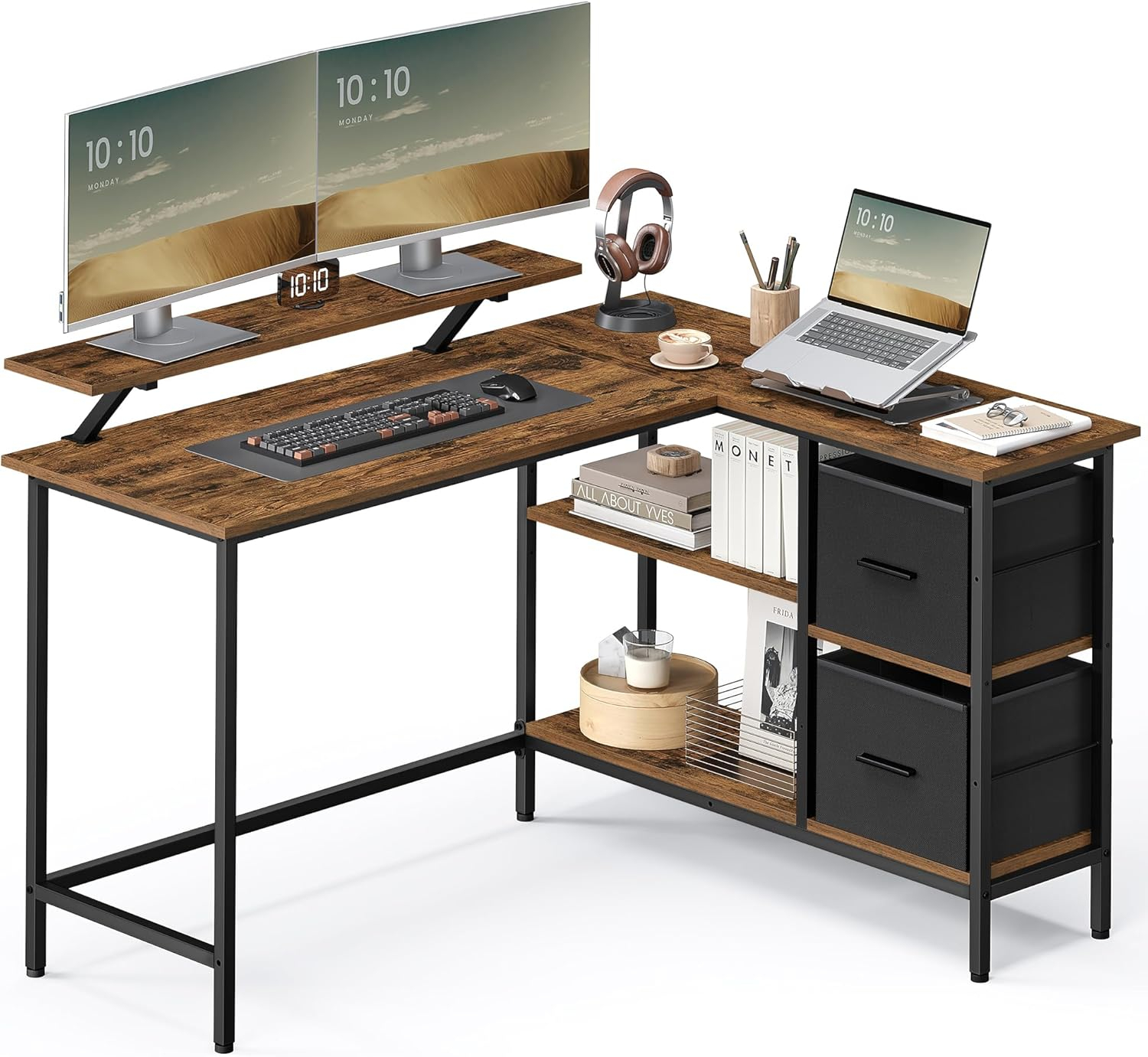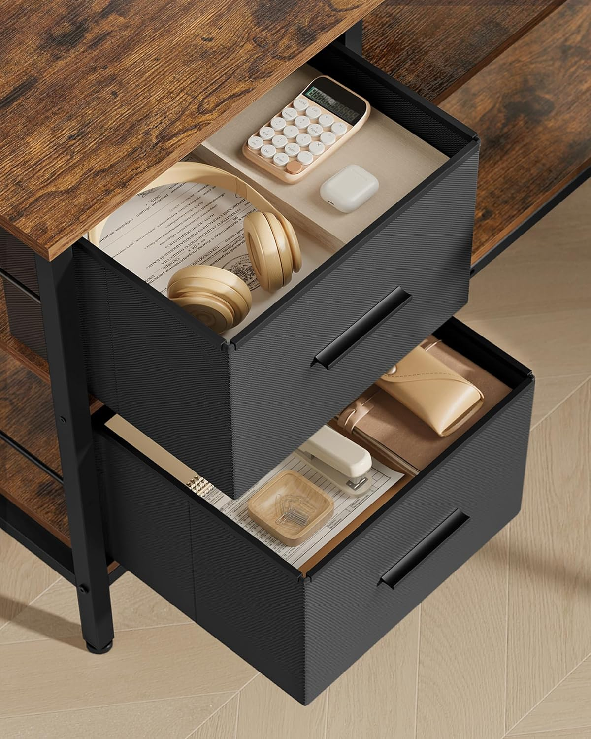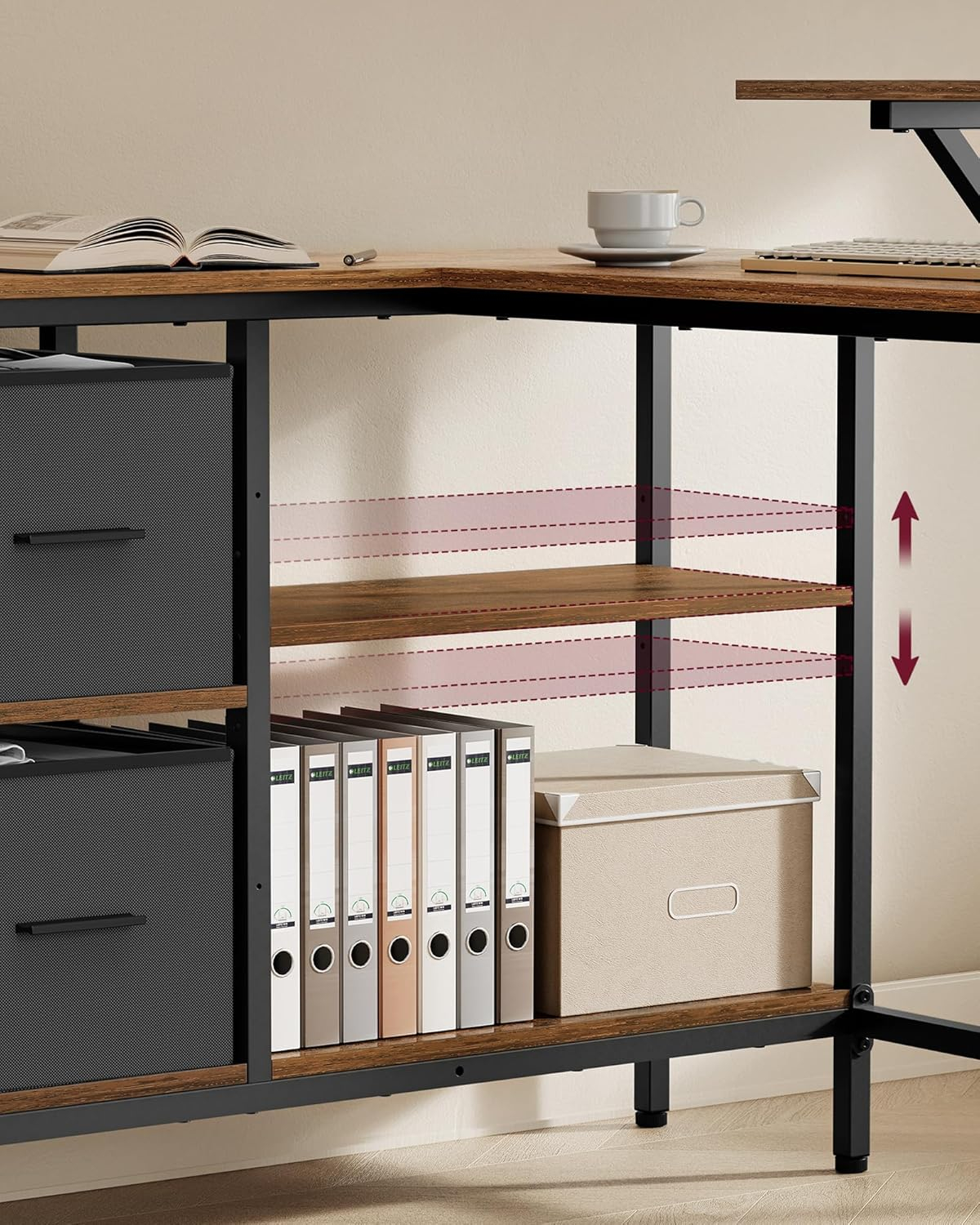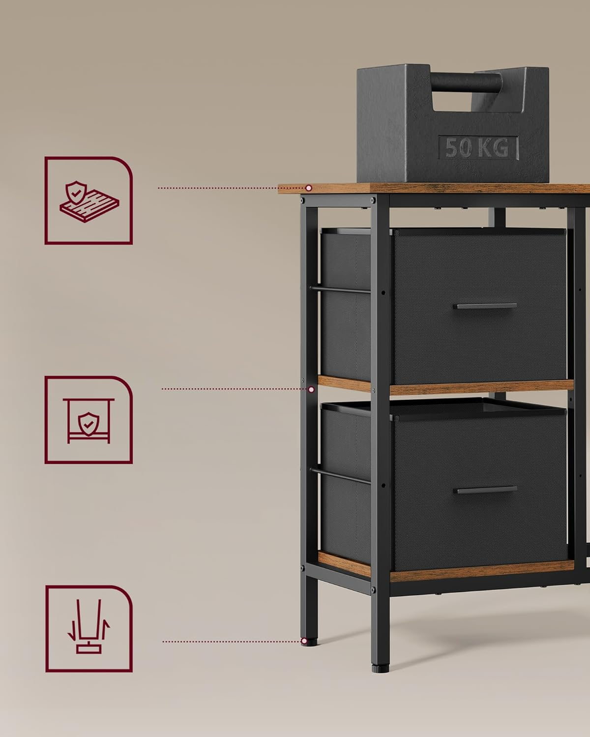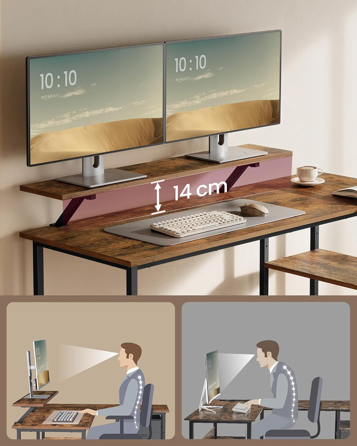 Detalii produs:- Culoare: maro vintage.- Material: placi aglomerate, otel, tesatura textil, tesatura din bumbac poliesteric- Dimensiuni: 135 cm x 105 cm 105 x 135 x 89,5 cm (P x l x i)- Greutate: 22,3 kg.- Sarcina maxima: sarcina statica a blatului mesei: 50 kg.- Sarcina maxima: Sarcina statica a suportului pentru monitor: 20 kg.Pachetul include:1 x birou in forma de L1 x set de accesorii1 x manual de utilizare    Reversibil si versatil:  Acest birou in forma de L, are un design reversibil care va permite sa instalati sertarele la stanga sau la dreapta, astfel incat sa se potriveasca perfect in birou, dormitor sau camera de zi Mult spatiu de depozitare:  Dispunand de 2 sertare spatioase, acest birou de colt ofera suficient spatiu pentru fisiere si elemente esentiale de birou. Raftul din mijloc este reglabil la 3 inaltimi pentru a va satisface nevoile de depozitare Stabil si rigid:  Construit cu cadru din otel si bare transversale ranforsate, acest birou pentru calculator suporta pana la 50 kg pe blat si 20 kg pe suportul pentru monitor. Lucrati cu incredere! Atentie la detalii:  Picioarele reglabile asigura stabilitatea chiar si pe podele usor inegale si va protejeaza podelele de zgarieturi. Nu mai palpaiti de fiecare data cand tastati pe tastatura Asamblare usoara:  Proiectat pentru o asamblare fara probleme, acest birou vine cu o structura simpla, piese numerotate si instructiuni clare, care simplifica procesul de asamblare pentru confortul dvs.
