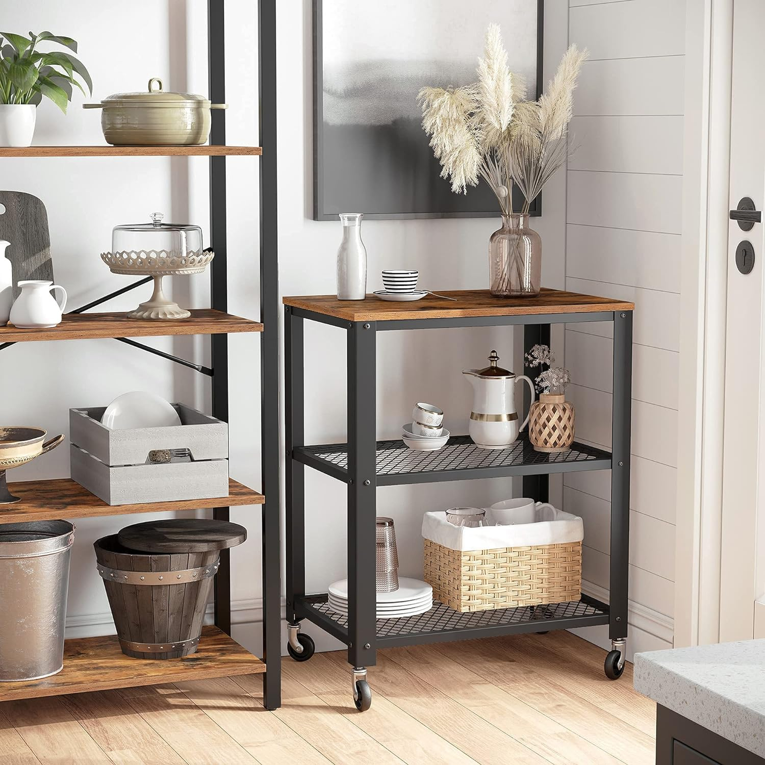 Dimensiunile produsului: 40D x 60W x 77.5H cm  	 Tip: raft Raft cu etaje  	 Material: cadru Placi aglomerate, cadru metalic  	 Marca: VASAGLE  	 Culoare: Maro Rustic + Negru    Despre acest articol Durabil si stabil: Placi aglomerate ecologice de calitate E1 cu granulatie de lemn; rezistent la apa si uzura, durabil pentru a dura mult timp; cadrul metalic gros il face robust pentru a tine carti, reviste si laptop.Aspect clasic: stilul industrial cu constructie simpla creeaza un aspect atractiv si modern; se potriveste bine gustului tau personal si decorului interior.Capacitate de depozitare spatioasa: caruciorul utilitar cu 3 niveluri ofera spatiu mare de depozitare economisind in acelasi timp spatiul pe podea; solutie excelenta de depozitare pentru o bucatarie mica.Totul pentru confortul dvs.: roti pentru a va ajuta sa rulati caruciorul oriunde aveti nevoie; daca doriti ca caruciorul sa ramana intr-un singur loc tot timpul, pur si simplu atasati picioarele reglabile.Cos versatil: Pastrati totul, de la carte la articolele de bucatarie organizate si la indemana, perfect pentru bucatarie, sufragerie si dormitor.