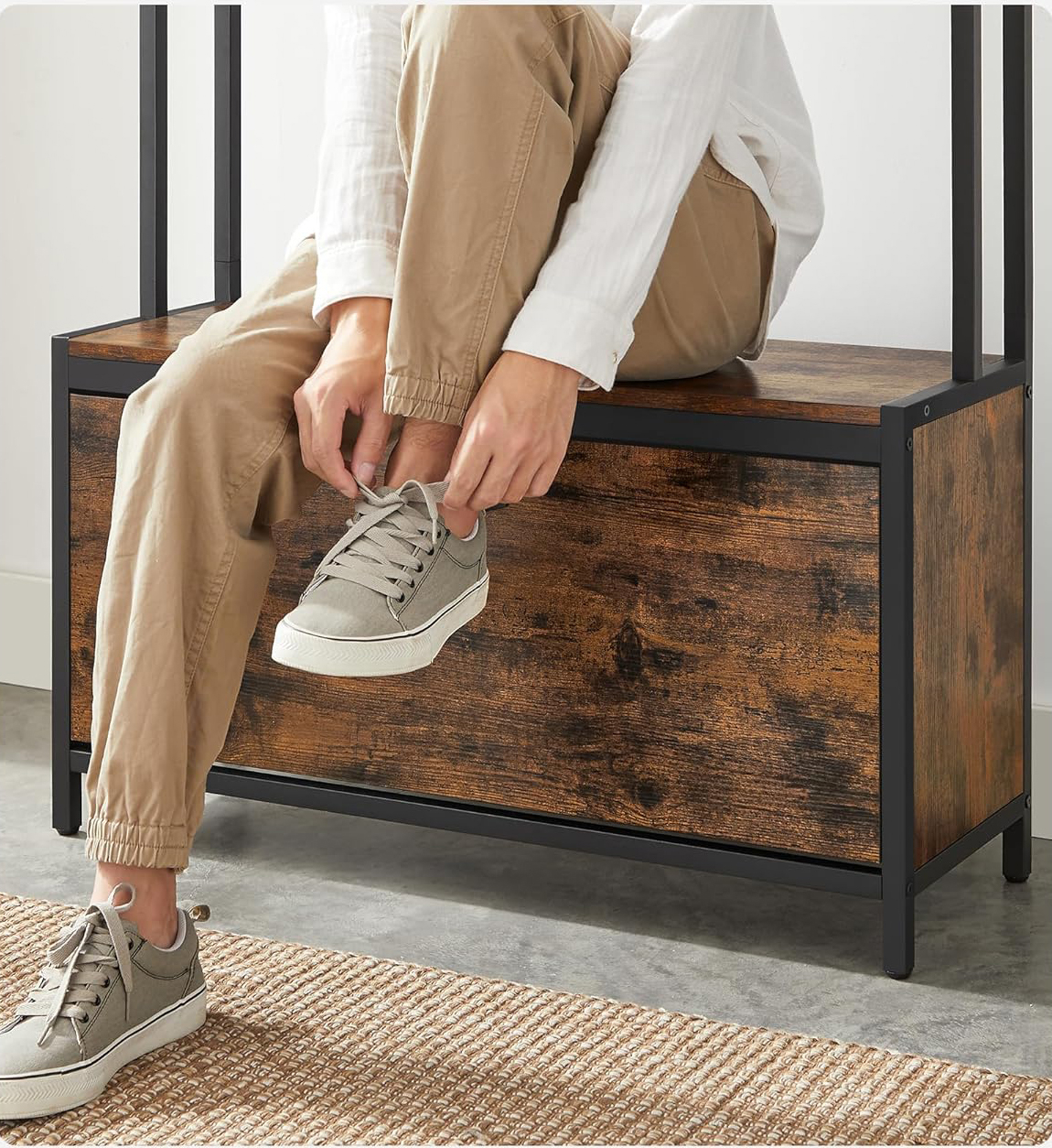 Specificatii:   	 Culoare: Alb  	 Material: Placi aglomerate MDF, cadru otel  	 Dimensiunea produsului: 30 x 85 x 180 cm (D x W x H)  	 Greutatea produsului: 12,6 kg  	 Max. Capacitate de incarcare statica per raft: 10 kg    Despre acest articol Cu 9 carlige, un dulap pentru pantofi, o banca lata de 85 cm si un raft superior, acest dulap de hol va permite sa va atarnati paltoanele, sa va organizati pantofii, sa va asezati pentru a va schimba pantofii si sa va expuneti bibelourile preferate.Compartimentul flip adanc de 30 cm are un separator reglabil in 3 pozitii pentru a va gazdui pantofii, papuci, adidasi si tocuri inalte; ascundeti-va pantofii in spatele usii flip si protejati-i de praf. Realizat din otel, placi aglomerate si intarit cu bare in V pe spate, acest dulap de hol este stabil si sustine pana la 100 kg pe banca, astfel incat sa puteti sta pe el cu mintea linistita. Panourile rustice maro se potrivesc bine cu cadrul din otel negru, dand acestui cuier o nota industriala si adaugand un caracter unic holului dvs.Ce primiti: Un dulap de hol 4 in 1 care combina un cuier, o banca, un suport pentru pantofi si un raft de depozitare pentru a profita la maximum de spatiul de la intrare, precum si instructiuni usor de urmat si piese etichetate pentru a va ajuta sa-l asamblati fara efort.