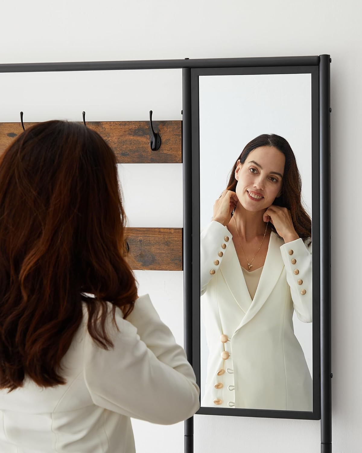 Culoare: Maro rustic+negru  	 Marca: VASAGLE  	 Dimensiune: 35 x 98 x 180 cm  	 Adancimea articolului: 35.0 cm  	 Dimensiunile articolului: L x l x i 35 x 98 x 180 cm    Despre acest articol Ranger 4 in 1: Acest cuier de intrare multifunctional are 7 carlige, o banca lunga de 98 cm, 2 rafturi si 1 oglinda. Puneti tot ce aveti nevoie inainte de a iesi pe usa - haine, genti, palarii si pantofi - pe acest cuier 4 in 1.Oglinda de 80 x 30 cm poate fi montata la stanga sau la dreapta, in functie de nevoile dvs. astfel incat sa va puteti verifica inainte de a iesi din casa pentru a va incepe ziua minunata. Raftul central poate fi reglat cu 4 cm in sus sau in jos pentru a acomoda balerini, flip-flops, adidasi sau cizme; rafturile cu plasa densa sunt perfecte pentru pantofii cu toc inalt si ii impiedica sa ramana blocati.Cu un cadru din otel si panouri din placi aglomerate, aceasta piesa de mobilier pentru intrare este solida si poate sustine pana la 100 kg pe banca; cele 4 picioare reglabile o mentin in echilibru. Va puteti aseza, relaxa si schimba pantofii cu incredere!