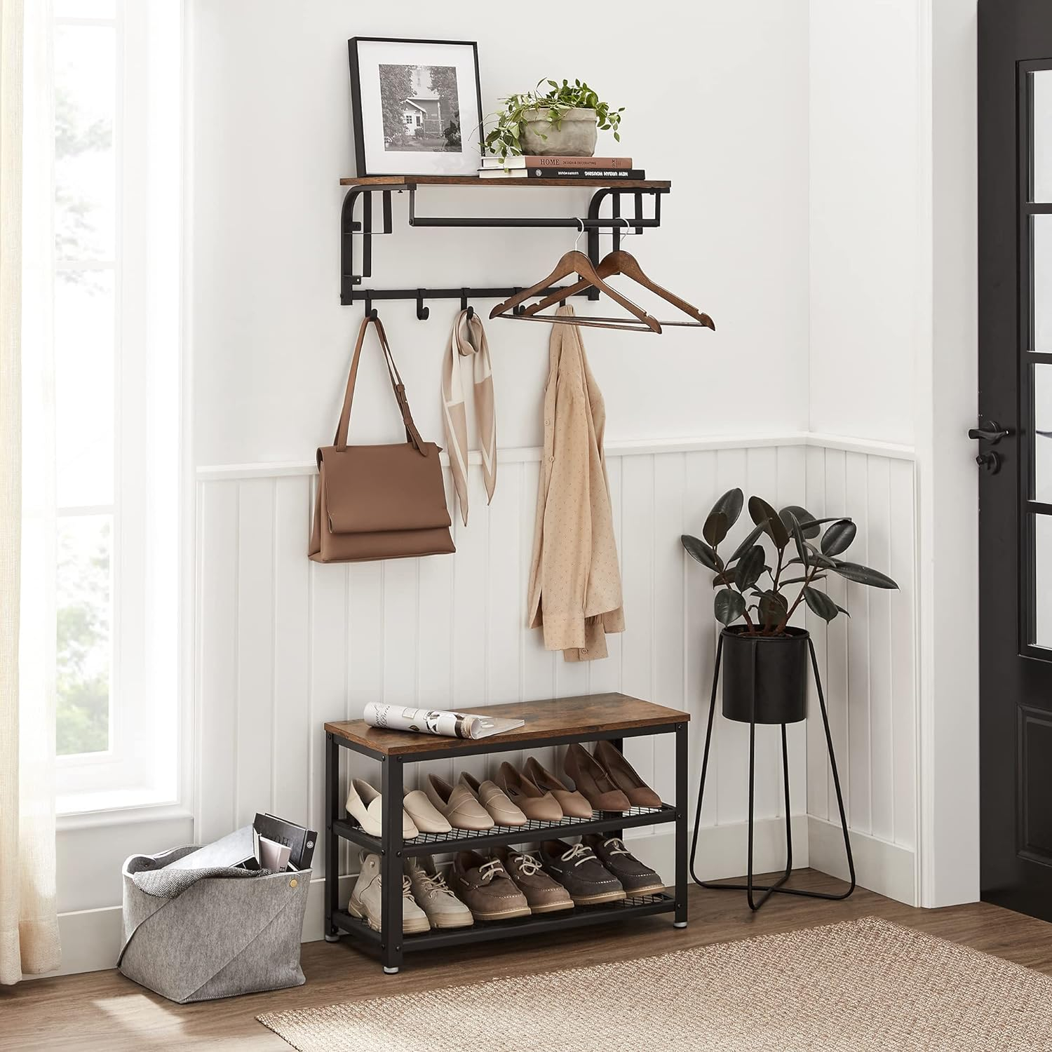 Culoare maro rustic + negruCaracteristica speciala PliabilaTipul de rafturi Raft suspendatMaterial: Placi aglomerate, otelDimensiunea produsului: 66 x 30 x 27 cm (L x l x i)Greutatea produsului: 3,3 kgMax. Capacitate de incarcare statica a raftului: 15 kgMax. Capacitatea de incarcare statica a fiecarui carlig: 3 kgMax. Capacitatea de incarcare statica a sinei de agatat: 10 kg Continutul pachetului: 1 x Raft pentru haine montat pe perete1 x Geanta pentru accesorii1 x Instructiuni Note VASAGLE: Pentru instalare sunt necesare surubelnita, nivel cu bula de aer, burghiu electric si ciocan.Va rugam sa montati acest articol pe un perete solid. Daca doriti sa il montati pe gips-carton, obtineti mai intai suruburile corecte de la un magazin de hardware. Despre acest articol Utilizati pe deplin spatiul de perete: Raftul pentru haine montat pe perete transforma un perete gol intr-un spatiu util pentru a va pastra hainele, gentile, umbrelele si cheile organizate si la indemanaDesign trei in unu: Vine cu un raft mare (66 x 30 cm), o sina de agatat si 5 carlige pentru a va satisface diversele nevoi cu un spatiu minim; utilizati ca raft de afisare, cuier de haineFabricat pentru a dura: Cadrul din otel asigura un suport robust si stabil; suruburi si bolturi de expansiune imbunatatite pentru o mai mare fermitate; raftul rezista pana la 15 kg, fiecare carlig 3 kg si sina de agatat 10 kgVersatil si decorativ: Combina raftul rustic cu rama neagra, adaugand un aspect industrial chic spatiului dvs.; se potriveste in intrarea, holul sau dormitorul dvs.Ce primiti:: Un cuier de perete realizat din placi aglomerate si otel, cu instructiuni clare pentru o asamblare usoara. Asadar, rasfatati-va cu aceasta piesa de mobilier practica din colectia noastra DAINTREE si scapati de haosul din holul dvs.