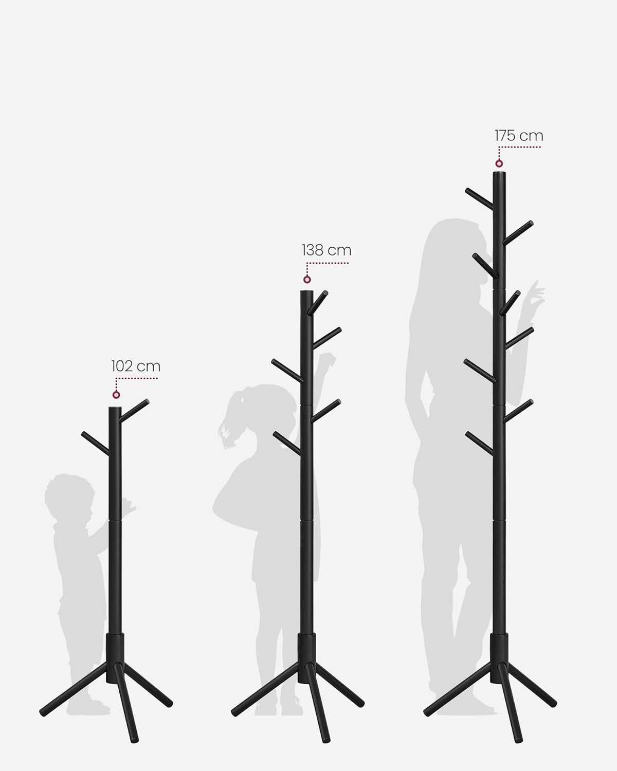 Specificatii tehnice    Brand:  VASAGLE  Model:  RCR004B01  Tip produs:  Cuier de podea  Material:  Lemn masiv  Dimensiuni:  47x47x175 cm  Capacitate maxima statica:  15 kg  Capacitate per carlig:  1.5 kg  Numar carlige:  8  Montaj:  Pe podea  Stil:  Simplu, reglabil  Finisaj:  Vopsit  Culoare:  Negru  Inaltime reglabila:  3 trepte  Instructiuni intretinere:  Evitati expunerea directa la soare si contactul cu obiecte ascutite  Accesorii incluse:  Manual de utilizare   Scurta descriere:   Cuierul VASAGLE imbina designul simplu cu functionalitatea intr-un corp din lemn masiv, vopsit negru. Ofera 3 niveluri de inaltime in functie de nevoi – ideal pentru copii sau adulti – si o baza trepied stabila. Cele 8 carlige sunt perfecte pentru haine, genti sau esarfe, iar dimensiunile compacte il fac potrivit si pentru holuri inguste sau dormitoare.   Caracteristici principale:    	 Structura durabila din lemn masiv  	 3 niveluri reglabile de inaltime  	 Baza trepied stabila si echilibrata  	 8 carlige practice pentru haine si accesorii  	 Design compact, ideal pentru spatii mici  	 Asamblare usoara fara unelte necesare  	 Potrivit pentru hol, birou, dormitor sau camera copiilor