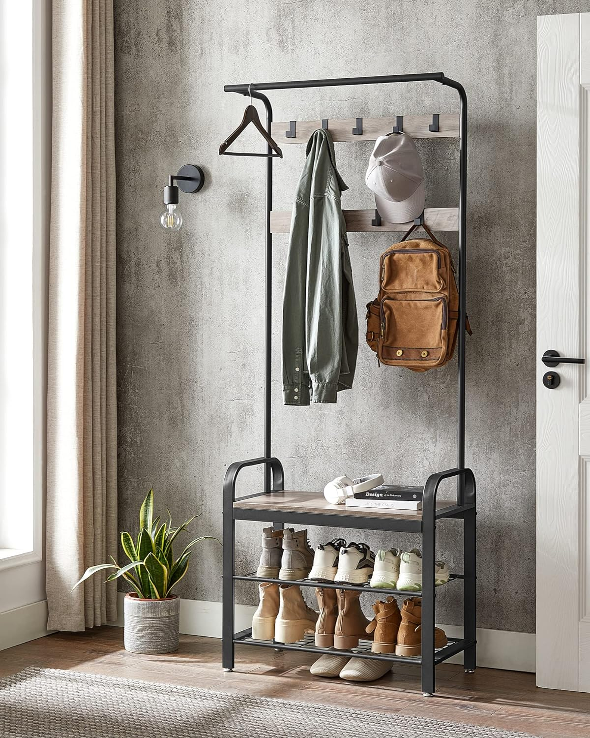 SPECIFICATII   	 Culoare: Gri, Negru  	 Material: Placi aglomerate, otel  	 Dimensiunea produsului: 72 x 33,7 x 183 cm (L x l x i)  	 Greutatea produsului: 9,8 kg  	 Capacitatea de incarcare statica a fiecarui carlig: 3 kg  	 Capacitatea de incarcare statica a scaunului: 80 kg    Design perfect: Cadrul puternic din otel negru si raftul masiv in tonuri de gri sunt combinatia eleganta de stiluri care confera acestui raft atractiv un caracter individual, o durabilitate remarcabila si o capacitate de incarcare ridicata de pana la 3 kg pentru fiecare carlig si 80 kg pentru raftul din lemn prelucrat.Acest cuier pentru palarii si paltoane nu numai ca are 9 carlige solide si o bara pentru haine in partea superioara, dar ofera si doua rafturi din sarma metalica pentru pantofii dvs. si o banca solida pe care va puteti aseza confortabil in timp ce va incaltati.Nu va faceti griji cu privire la asamblare:Datorita instructiunilor usor de urmat, este nevoie de putin efort pentru a asambla acest suport de haine si pantofi de 72 x 33,7 x 183 cm pentru holul dvs.