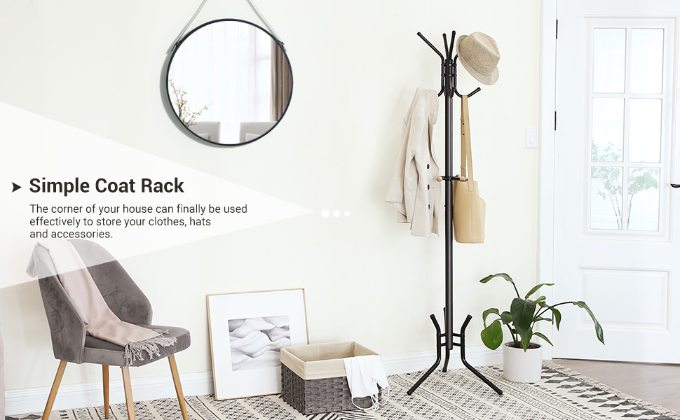 Parametri:   	 Inaltime: 176 cm  	 Distanta dintre picioare: 49 cm  	 Material: teava de otel  	 Culoarea neagra  	 Dimensiuni pachet: 80 x 27,5 x 6 cm  	 Greutate neta: 2,1 kg   Cu structura sa stabila, aspectul frumos si dimensiunile mici, este solutia ideala pentru orice camera. Toate capetele celor trei picioare sunt invelite cu tuburi de plastic pentru a evita zgarierea suprafetelor. Toate cele 4 carlige de sus sunt fixate cu tampoane din plastic pentru a evita deteriorarea hainelor in timpul utilizarii. Fiecare picior are un diametru de 22 mm pentru a asigura o stabilitate maxima.Utilizand un finisaj obtinut prin metoda de coacere la cuptor, acest produs este 100 % rezistent la apa si la rugina. Curatarea este simpla, cu o carpa umeda si o stergere rapida.O multime de carlige: Va puteti agata hainele, palariile si cravatele in partea de sus, iar gentile pe cele 4 carlige din mijloc.Asamblare simpla: Usor de demontat si asamblat, poate fi usor de mutat.  Puteti pune acest articol in camera dvs. de zi si in dormitor etc.