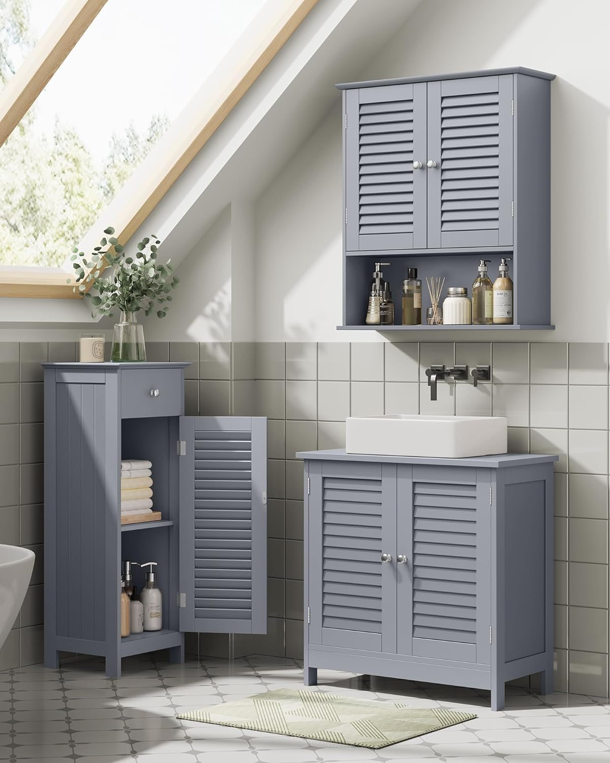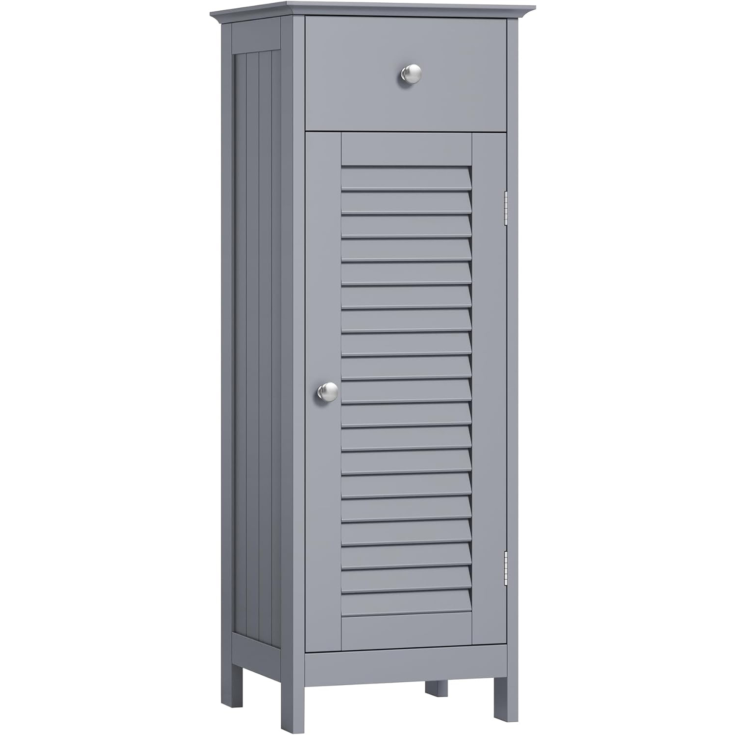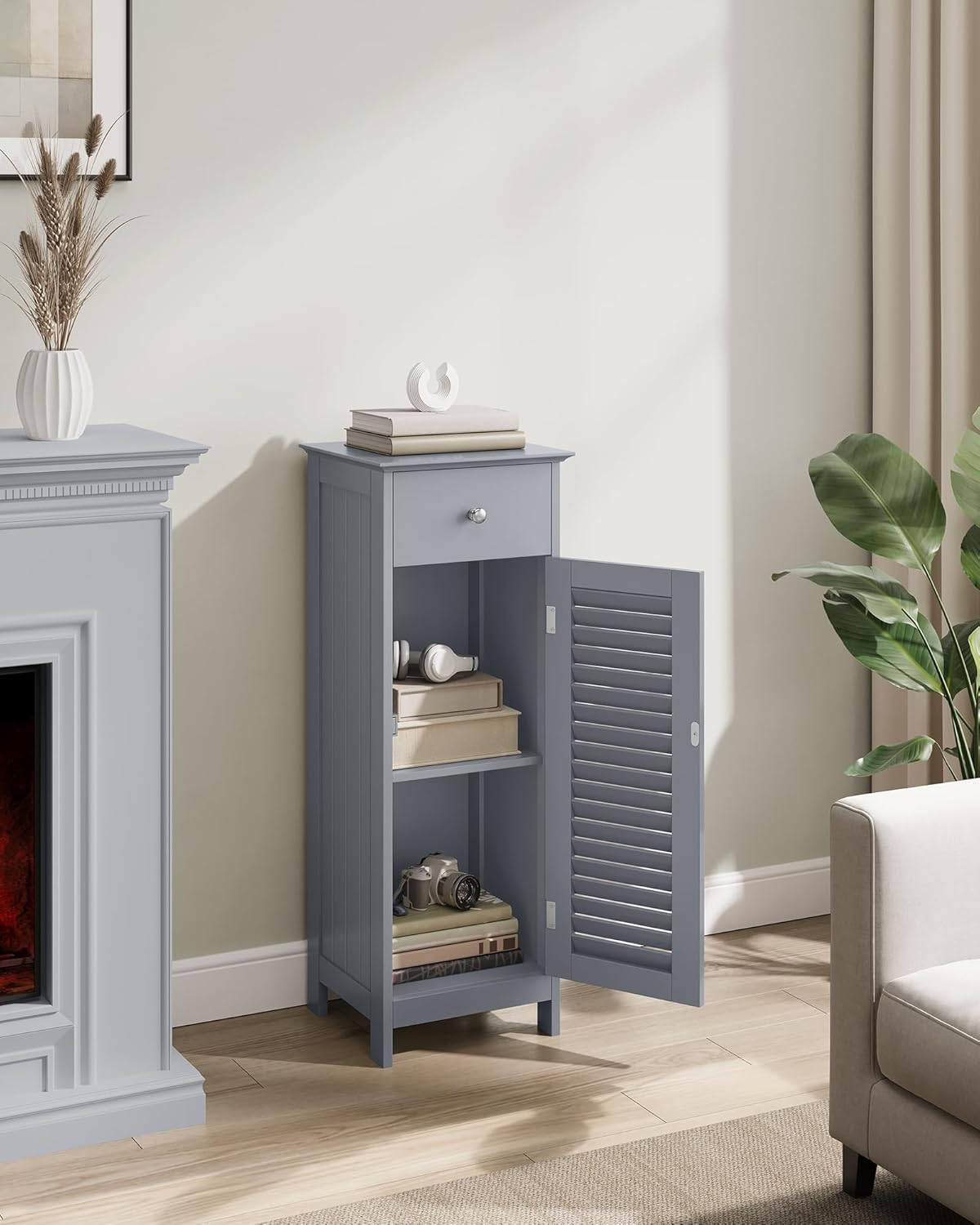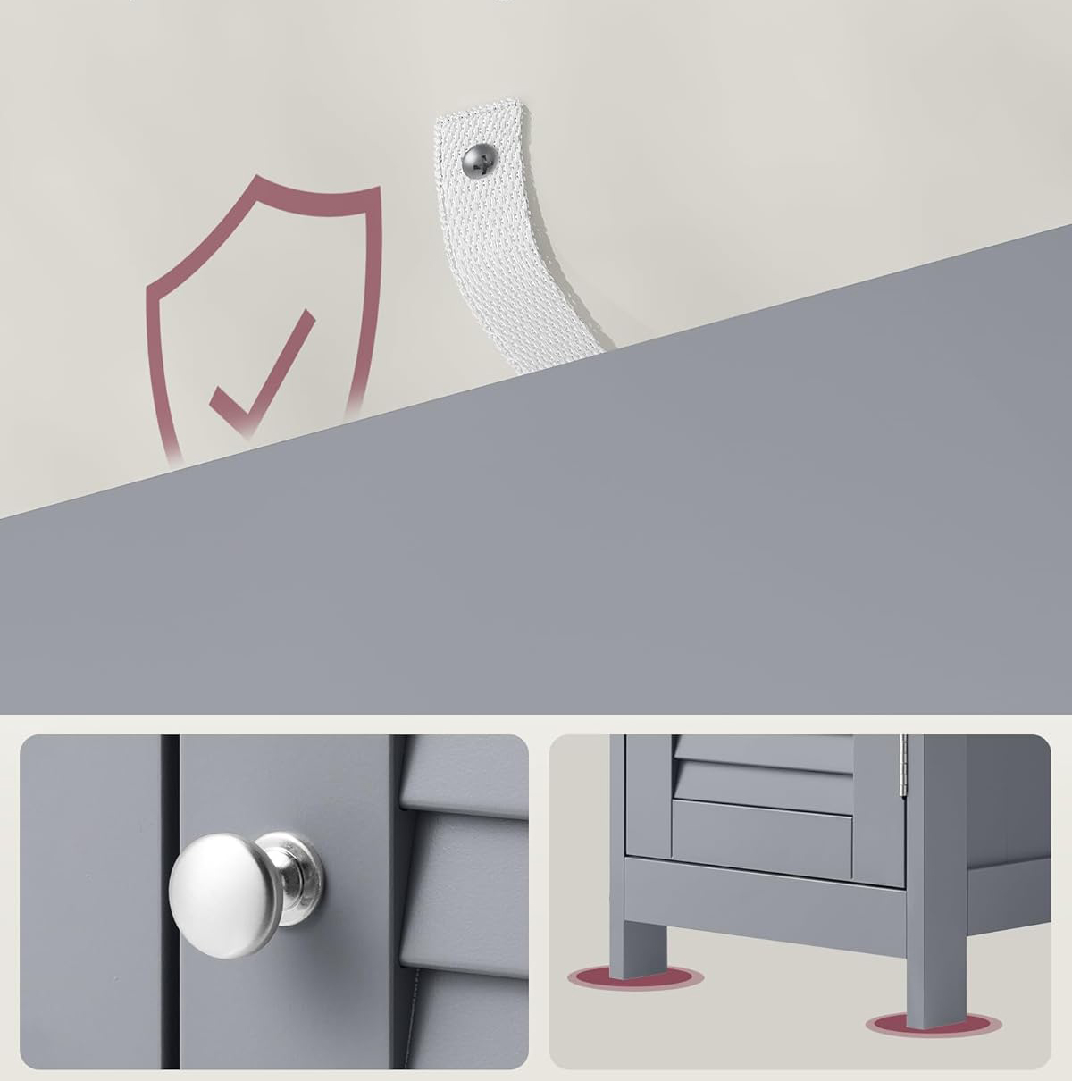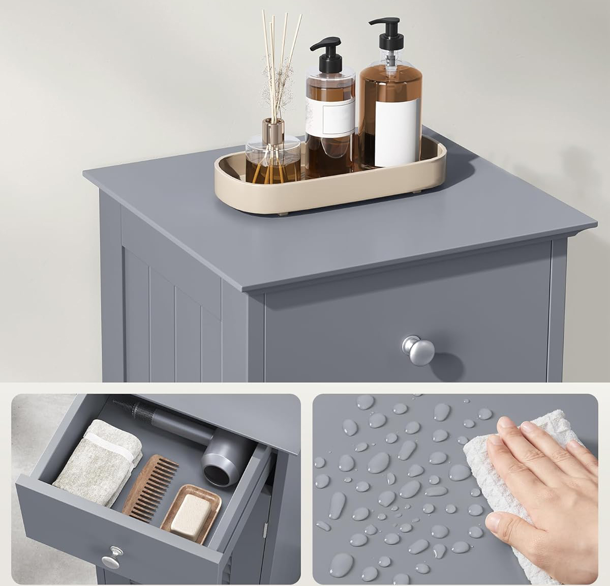 Specificatii: Culoare: Gri Material: MDF (placi din fibre de densitate medie) Dimensiunea produsului: 30 x 32 x 87 cm Dimensiunea interioara a sertarului: 23,5 x 22,5 x 9 cm Fiecare dimensiune a compartimentului din dulapul de jos: 26 x 26 x 30,5 cm Despre acest articol Amestecul armonios de linii curate, o culoare gri si o usa cu obloane minimaliste creeaza un dulap de baie in stil scandinav care emana un aer de eleganta. Suprafata acestui dulap de baie poate fi curatata cu usurinta cu o carpa moale. Panourile solide din MDF ofera acestui mobilier de baie o durata de viata lunga.Masurand doar 30 x 32 x 87 cm, aceasta unitate de depozitare pentru baie subtire are un sertar si doua compartimente in spatele usii, oferind mult spatiu de depozitare in timp ce ocupa spatiu minim pe podea.Acest dulap de podea poate fi atasat in siguranta de perete cu kitul anti-rasturnare inclus, oferind un mediu de viata mai sigur pentru familia ta.Acest dulap de depozitare se potriveste perfect intr-o varietate de camere, fie ca este vorba de baie, sufragerie sau dormitor, oferind spatiu suplimentar de stocare oriunde este necesar.