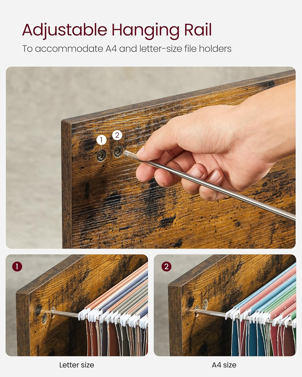 Specificatii:   	 Culoare: Maro rustic, Negru  	 Material: PAL, maner metalic  	 Dimensiunea produsului: 40 x 80 x 66 cm (D x W x H)  	 Max. Capacitate de incarcare statica: 40 kg   Note:   	 Copiii nu au voie sa se catere sau sa se joace pe produs din motive de siguranta.     Despre acest articol Cat timp ati pierdut cautand documente ratacite in dezordine?  Iata solutia - un dulap de arhivare lateral cu 3 sertare si 2 compartimente - pentru a va ajuta sa restabiliti o zona de lucru ordonata.3 sertare cu sine de agatat in sertarul inferior pentru diverse articole de papetarie in format A4 sau Letter, 2 compartimente cu un raft reglabil pe latimea hartiei si carti la indemana, plus un birou mare. Perfect pentru o imprimanta! Ca un carucior rulant:  5 roti de calitate cu 2 frane ofera mobilitate usoara dintr-un loc in altul - in jurul biroului sau studiului dvs. de acasa, chiar si atunci cand este complet incarcat - ceea ce il transforma intr-un carucior rulant pentru a va accesa hartiile in orice moment. Usor de instalat:  Cu instructiuni usor de urmat si piese numerotate, aveti acest dulap cu role setat inainte de a va da seama unde sa il amplasati. Uneori, tot ce aveti nevoie pentru a face treaba este.