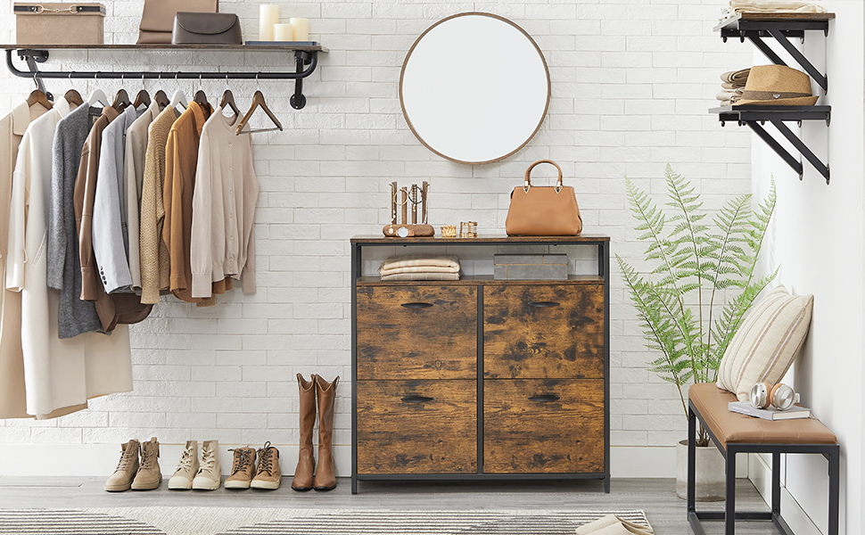 Specificatii: Culoare: maro rustic, negru Material: MDF, otel Dimensiune produs: 98,3 x 30 x 95 cm (L x l x H) Greutate produs: 26,6 kg Max. Capacitatea de incarcare statica a suprafetei superioare: 20 kg Max. Capacitate de incarcare statica per compartiment: 5 kg Despre acest articol Pastrati-va pantofii in acest dulap elegant de pantofi, in loc sa le lasati sa patrunda in usa. Cand ajungi acasa, deschide doar usa pentru a-ti pune pantofii. Ofera un nou aspect holului tau!Acest dulap de pantofi are 4 compartimente (2 randuri unul langa altul) cu separatoare pentru a gazdui pana la 12-20 de perechi de pantofi, in timp ce dimensiunea de 98,5 x 30 x 95 cm ofera inaltimea perfecta pentru a-ti accesa pantofii.Portofele, ochelari de soare, manusi... oricine isi poate gasi un loc pe raftul deschis; ce zici de chei? Suprafata superioara este basul perfect unde le puteti gasi intotdeauna.stilul nu trebuie pierdut cand vine vorba de depozitarea pantofilor. Amestecul de PAL maro rustic si otel negru emana o senzatie industriala sic pentru a va impresiona oaspetii.un suport pentru pantofi cu 4 compartimente pliabile, un kit de montare si instructiuni clare pentru asamblare usoara si picioare reglabile pentru a-l mentine stabil.