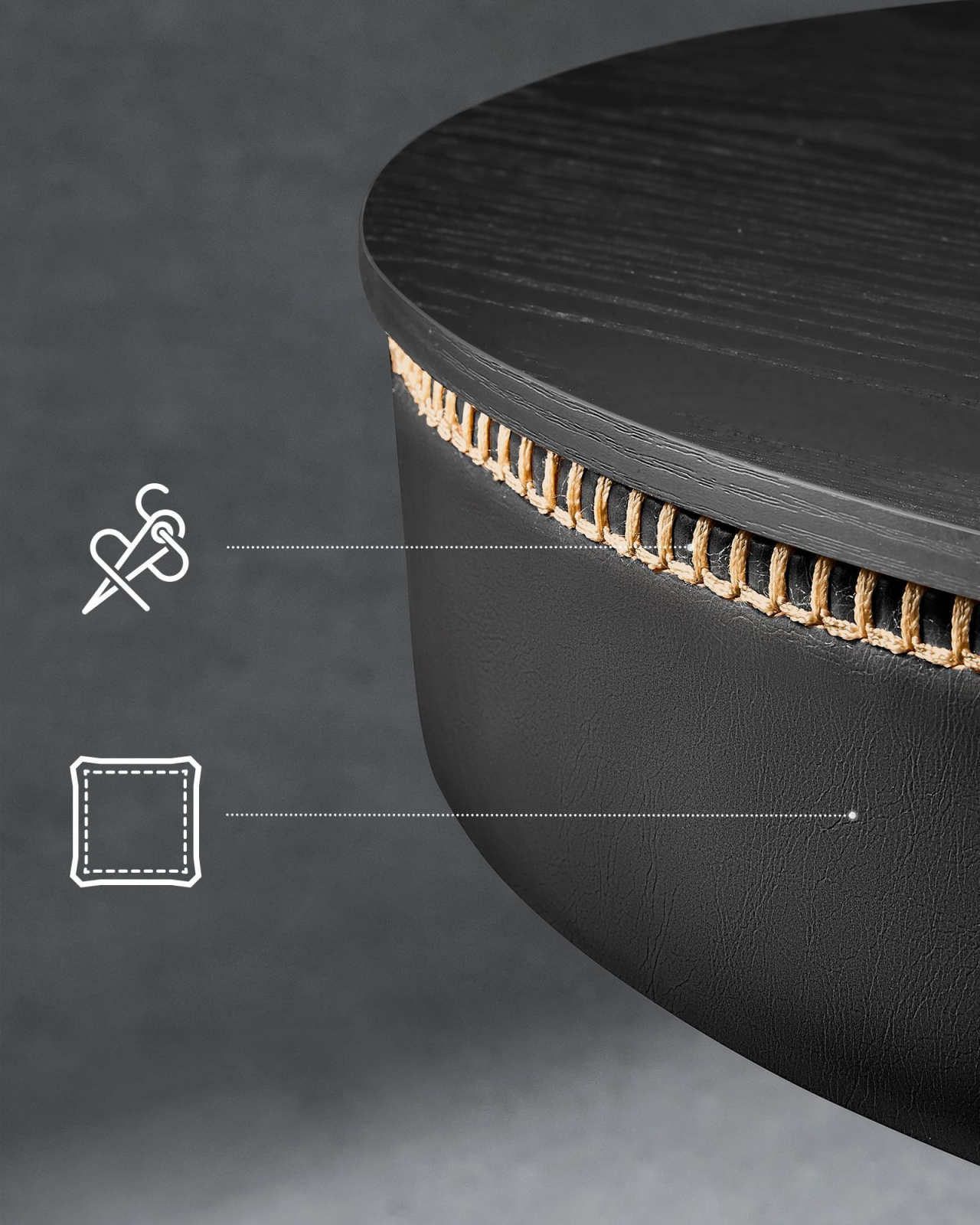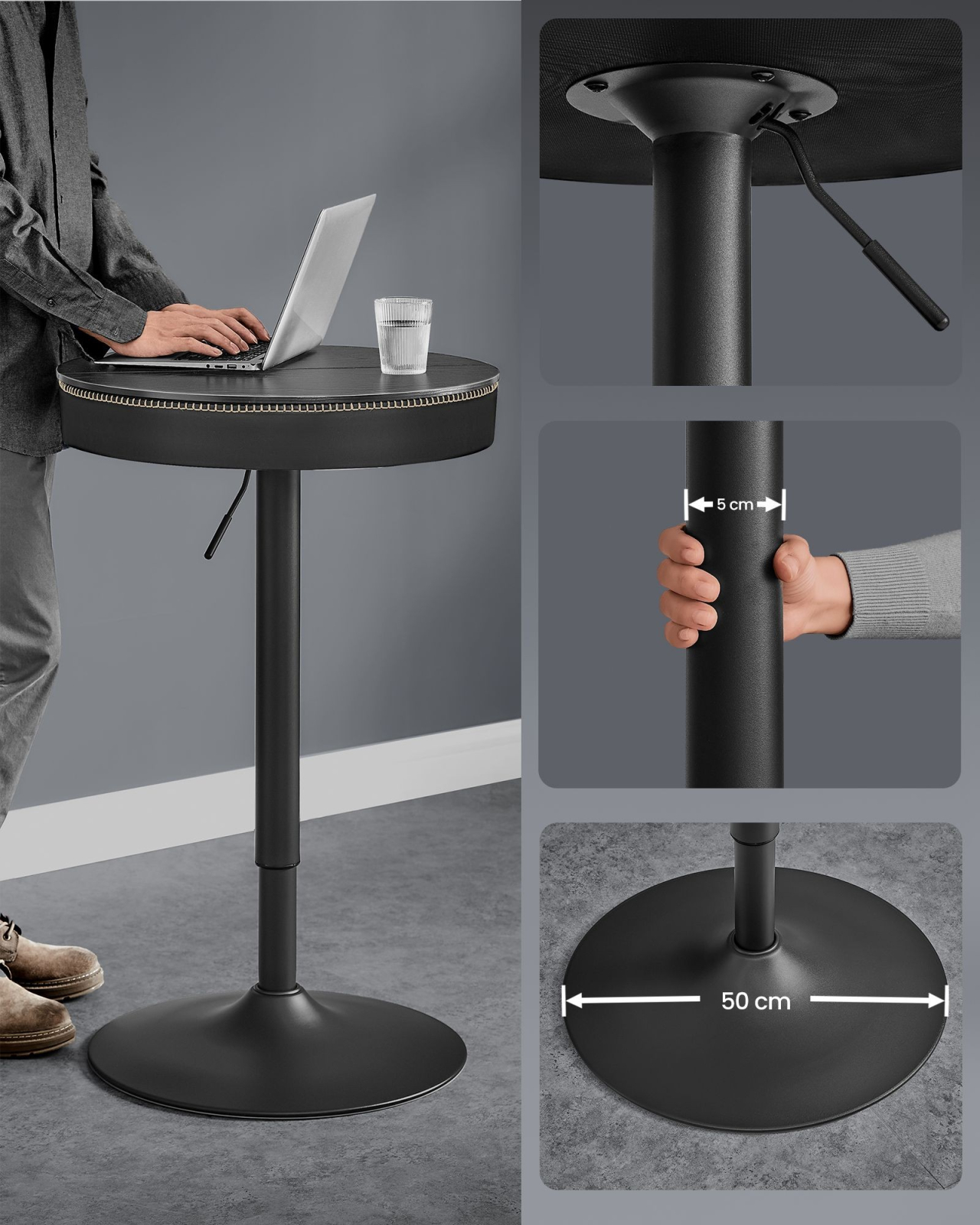 Detalii produs:   	 Culoare: Negru  	 Material: Otel, piele artificiala PU (poliuretan), placi aglomerate  	 Dimensiuni: 58,7 x 58,7 x (83-105) cm (inaltime x latime x inaltime)  	 Max. Capacitate totala de incarcare statica: 25 kg      Despre acest articol  Infrumusetati-va spatiul:  Aceasta masa de bar din colectia VASAGLE este realizata din piele artificiala cu textura bogata, iar cusaturile fine atesta maiestria si creeaza astfel o locuinta care spune multe despre stilul dumneavoastra. Compartiment sub blatul mesei:  Aceasta masa are un compartiment adanc de 4,8 cm in care pot fi depozitate tacamuri si pixuri. Pastrati cele mai importante ustensile la indemana si invizibile, asigurand o casa ordonata. Inaltime reglabila si versatila:  Aceasta masa rotunda cu spatiu de depozitare poate fi usor reglata de la 83 la 105 cm si este ideala pentru sufragerie, bucatarie sau camera de zi. Este ideala pentru mese ocazionale si intalniri. Stabilitate rezistenta:  Bazati-va pe designul solid al mesei noastre de bar negre, cu o baza solida de 50 cm care asigura o stabilitate exceptionala. O baza durabila, fara sovaieli, pentru utilizarea zilnica. Usor de asamblat:  Experimentati cat de usor este sa va instalati masuta de cafea. Datorita structurii simple, uneltei incluse si instructiunilor precise. Mobilierul dvs. de bar cu inaltime reglabila este gata de utilizare cu un efort minim.