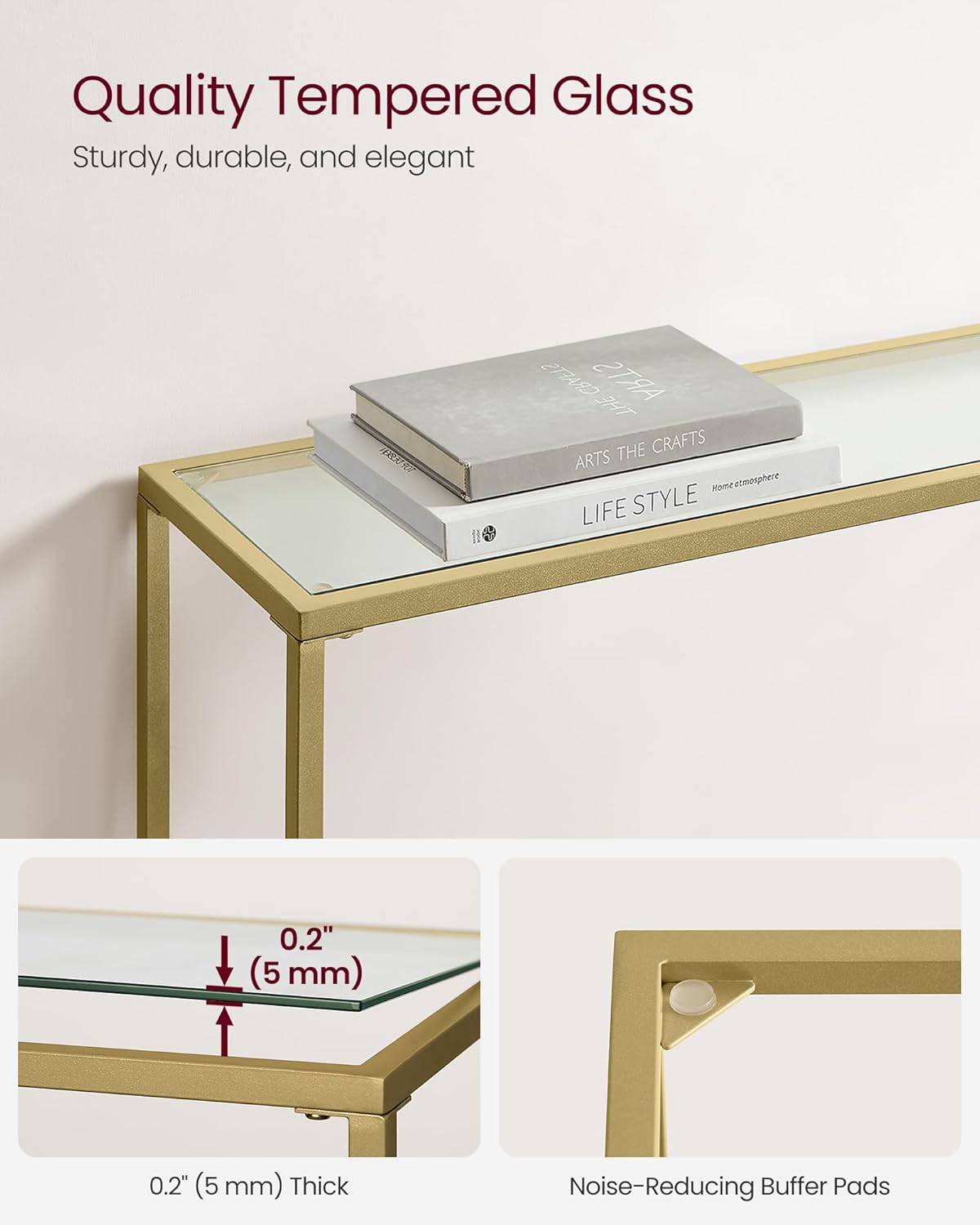 Specificatii: Culoare: Auriu pal, transparentMaterial: Otel, sticlaDimensiunea produsului: 20 x 100 x 80 cmGreutatea produsului: 5.3 kgMax. Sarcina statica maxima a mesei: 30 kg Note VASAGLE: Va rugam sa fixati aceasta masa la perete cu kitul anti-rasturnare furnizat pentru o utilizare sigura. Minimalism uimitor Duceti-va casa la nivelul urmator cu o masa consola moderna care combina metalul auriu deschis si blatul de masa din sticla temperata intr-o singura piesa minimalista si functionala Stabilitate buna Un blat de masa din sticla calita cu grosimea de 5 mm este asezat pe rama metalica a acestei mese consola in 20 x 100 x 80 cm, oferind un suport puternic pentru pana la 30 kg de plante, decoratiuni, carti sau rame foto Utilizati dupa cum doriti Unde puneti aceasta masa? In camera de zi ca o piesa de canapea? Langa usa ca o masa de intrare? Sau in hol ca o masa consola? Alegerea este a ta Simplu ca un joc Nu este nevoie sa va luati o dupa-amiaza libera pentru a asambla aceasta masa solida pentru canapea. Cu instructiuni ilustrate si piese numerotate, o puteti instala in cel mai scurt timp Nu se clatina Podeaua din casa dvs. este usor neregulata? Nicio problema. Picioarele reglabile ale acestei mese consola din sticla temperata sunt aici pentru a va salva. Totul va fi bine echilibrat!
