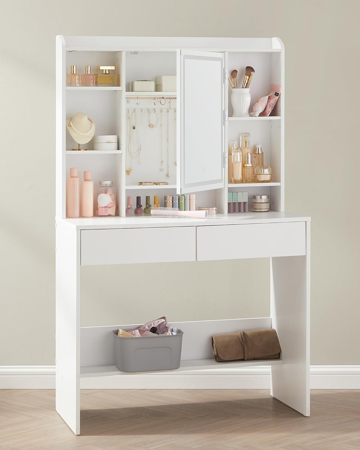 Necesita asamblare DaAdancimea articolului 40.0 cmProducator VASAGLEDimensiunile produsului 40 x 90 x 144,7 cm;Greutatea produsului 31.6 KilogrameIluminare LED - cu intensitate reglabila 3 culori de lumina - cald, rece, neutruMaterial PAL Mare si incapatoare: 1 raft in partea de sus pentru parfumurile dvs., 7 compartimente deschise pentru cosmeticele dvs., 2 compartimente si carlige in spatele oglinzii, 1 blat de masa, 2 sertare si 1 raft in partea de jos, aceasta masuta de toaleta va ofera un spatiu considerabil Iluminare led reglabila: Apasati butonul tactil pentru a schimba culorile luminii, apasati butonul pentru cateva secunde pentru a regla luminozitatea, totul este pus impreuna pentru a va machia rapid Raft reglabil pentru diferite produse: cele 2 placi din stanga si placa din mijloc din dreapta sunt reglabile la 3 inaltimi, pentru a va gazdui produsele de diferite dimensiuni, cum ar fi creme de fata, seruri, fundatii, demachiante si multe altele Stabil si durabil Realizata din PAL de calitate, aceasta masa de machiaj este stabila si durabila in timp. Suprafata sa este rezistenta la uzura si usor de curatat, va va insoti pentru multi ani de acum inainte Stil simplu si modern Designul simplu, liniile curate si albul pur dau viata acestei mese de machiaj moderne care va aduce o nota de eleganta dormitorului dvs.
