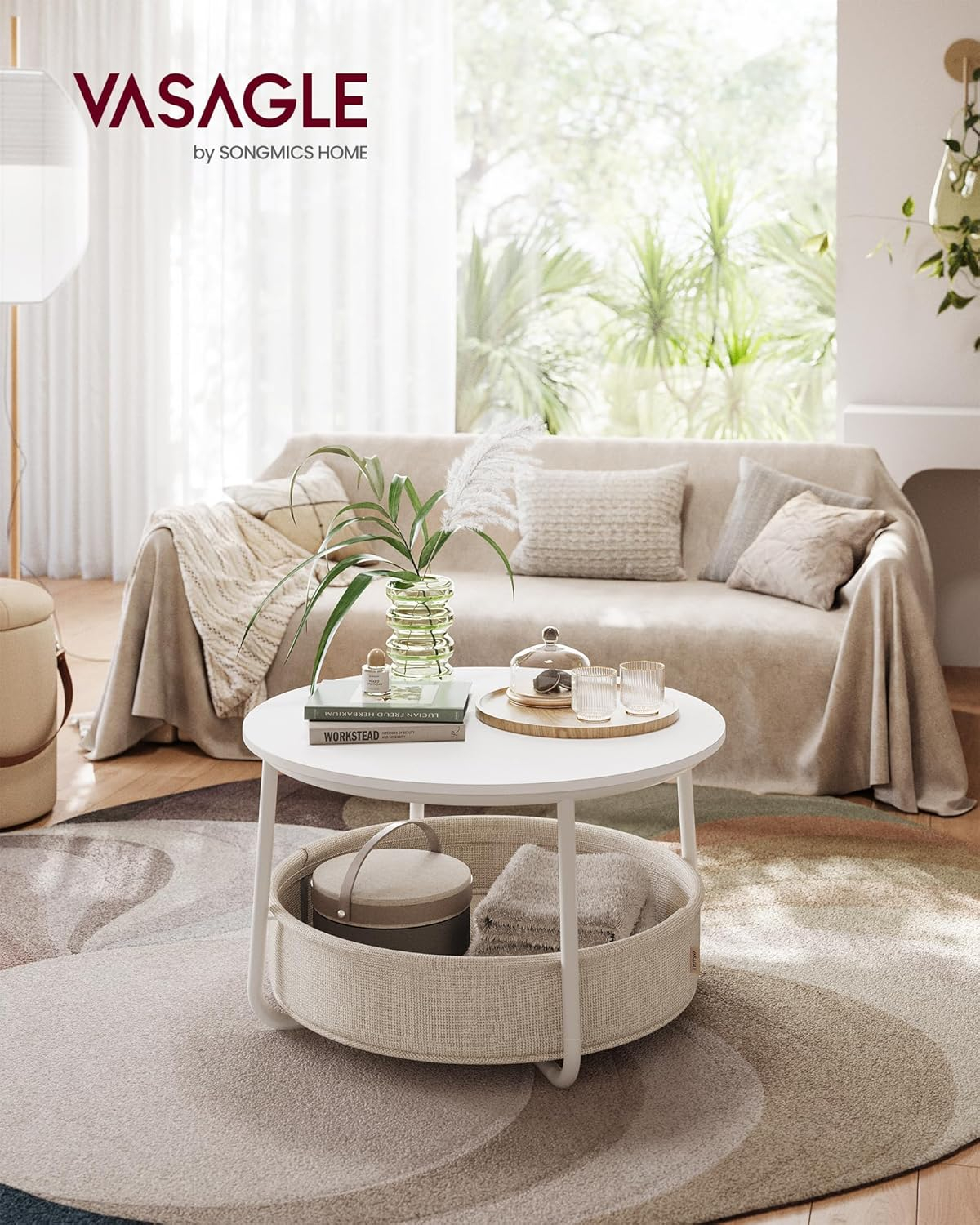 Aceasta masa de cafea rotunda se potriveste perfect in camera dvs. de zi, oferind un loc convenabil pentru divertisment sau munca. Specificatii: Culoare: alb mat, maro camel Material: MDF, otel, tesatura din poliester Dimensiunea produsului: 75 x 45 cm Dimensiune cos: 71.1 x 15 cm Max. Capacitatea de incarcare statica a blatului mesei: 40 kg Cos de depozitare practic: Echipata cu un cos din tesatura antirid cu strat dublu, aceasta masuta de cafea ofera o capacitate generoasa pentru a stoca cu usurinta paturi, perne si carti, pastrand obiectele dvs. zilnice organizate. Solid si durabil: Construita cu un panou din MDF fixat pe un cadru solid, dintr-o singura bucata, din otel in forma de U, aceasta masa de cafea se mandreste cu o constructie stabila si solida, asigurand o utilizare de lunga durata in spatiul dvs. de locuit. Modern: Blatul rotund al mesei si cosul din tesatura au o estetica minimalista, moderna, permitand acestei mese de dining sa adauge fara efort o nota de eleganta decorului dvs. Usor de asamblat: Cu structura sa simpla si instructiuni clare, aceasta masa centrala rotunda pentru camere de zi este proiectata pentru o asamblare usoara, permitandu-va sa va bucurati de confortul si stilul sau fara probleme.