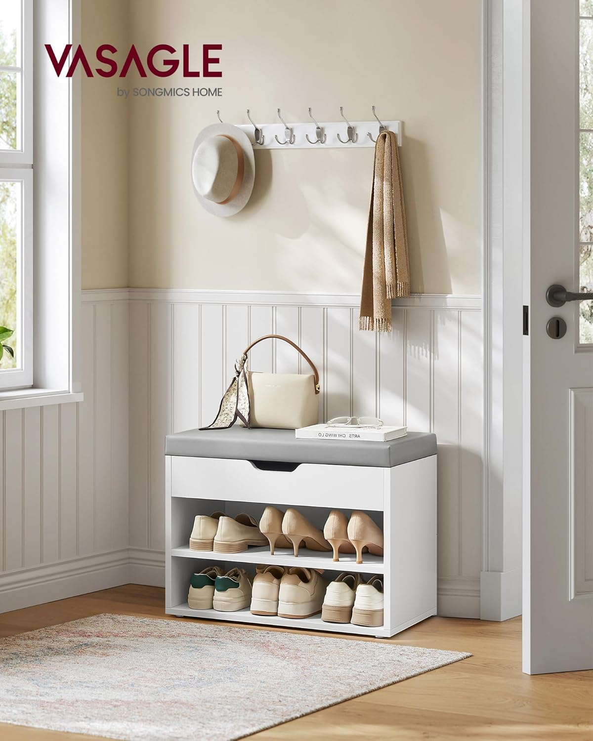 Specificatii tehnice: Brand: VASAGLE Tip produs: Etajera pantofi cu bancheta Material structura: PAL (placi aglomerate) Material sezut: Spuma poliuretanica acoperita cu PU Culoare: Alb Dimensiuni: 60x30x44 cm (L x A x H) Inaltime sezut: 44 cm Greutate maxima suportata: 136 kg Scurta descriere: Aceasta bancheta pantofar VASAGLE este alegerea ideala pentru hol sau dormitor, oferind o solutie compacta si eleganta de organizare. Cu 3 compartimente practice si un sezut confortabil, combina functionalitatea cu un design modern, in nuanta alb cloud. Caracteristici principale: Design 3 in 1 cu compartiment sub sezut si 2 rafturi deschise Sezut tapitat cu spuma de 4 cm si acoperire PU usor de curatat Constructie robusta din PAL ce suporta pana la 136 kg Balama dubla pentru siguranta si deschidere stabila Dimensiuni compacte, ideale pentru spatii mici