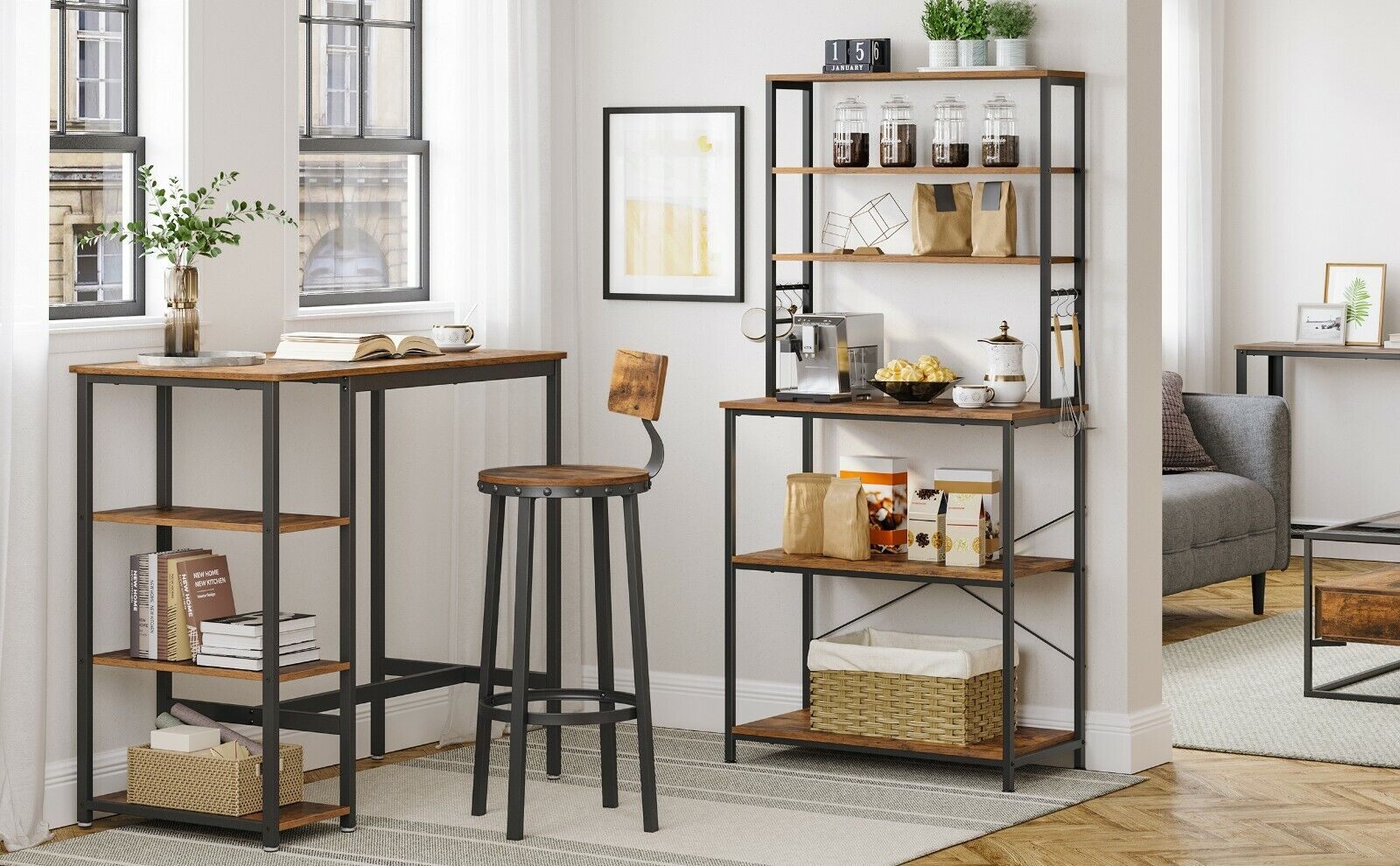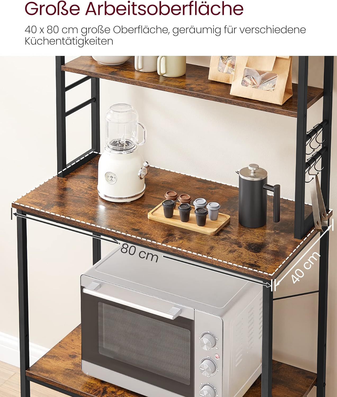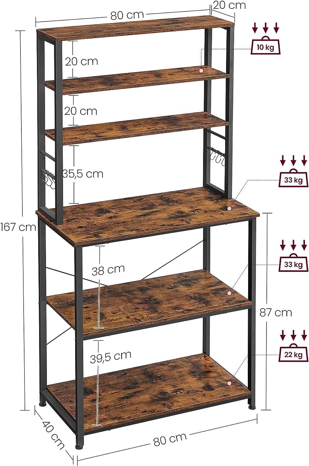 Tipul camerei: Bucatarie Material:Lemn prelucrat din aliaj de oțel Numar de rafturi: 4 Caracteristica speciala: Durabil Dimensiunile produsului: 40D x 80L x 167H cm Stil: industrial Despre acest articol Spatios: Economisiti spatiu pe blatul dvs. cu acest raft de bucatarie spatios - 3 rafturi superioare pentru borcane de condimente, 3 rafturi inferioare mari pentru aparatele de bucatarie si 6 carlige S pentru unelte. Acest raft all-in-one aduce ordine in bucataria dvs. Raftul din mijloc in partea de jos - reglabil in inaltime: Acest raft poate fi ajustat la 2 inaltimi, permitandu-va sa gazduiti ustensile de diferite dimensiuni, de la blender la friteuza cu aer comprimat si pana la oale si tigai Constructie solida : Datorita combinatiei dintre cadrul robust din otel si panoul aglomerat durabil, acest raft in picioare este puternic, solid si poate rezista cu usurinta la cuptorul cu microunde, masina de cafea si alte ustensile Potrivit pentru spatii mici: Avand dimensiunile de 40 x 80 x 167 cm, acest suport pentru cuptorul cu microunde cu 6 nivele este perfect pentru bucatariile mici sau ca mini-bar de cafea. Cu acest raft de depozitare, puteti profita la maximum de spatiu Stabil si sigur: Datorita picioarelor reglabile, raftul sta intotdeauna stabil pe podea si nu lasa zgarieturi. Cu protectia la inclinare inclusa, puteti fixa raftul pe perete, facand mediul sigur pentru dvs. si familia dvs. Fara griji cu privire la asamblare: Cu ajutorul instructiunilor clare, a pieselor marcate si a instrumentului de montare inclus, acest raft de bucatarie in picioare poate fi montat in cel mai scurt timp