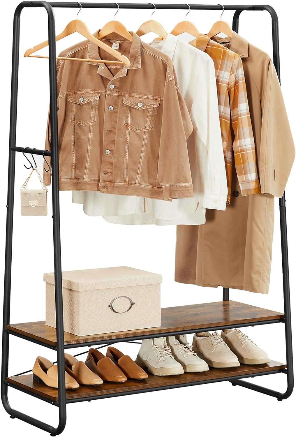 Detalii produs:   	 Culoare: Vintage maro/negru.  	 Material: PAL din lemn, otel.  	 Dimensiune: 100 x 45 x 160 cm (L x l x H).  	 Greutate: 13,7 kg.  	 Max. Capacitatea de incarcare statica a sina de haine: 114 kg.  	 Max. Capacitate de incarcare statica pe raft: 15 kg    Despre acest articol Cu o nota rustica si linii curbe, acest cuier evidentiaza frumusetea hainelor dvs. si le tine la indemana.Atarnati-va jachetele, camasile si pantalonii pe sina de sus, in lungime maxima, asezati-va gentile, pantofii sau sertarele pe cele doua rafturi de depozitare, iar ce ziceti de palarii, esarfe si umbrele? Acestea pot fi agatate pe partile laterale.Fabricat din otel durabil si din placi aglomerate durabile, acest cuier este puternic pentru a rezista pana la 114kg in total.Acest cuier de haine vine cu instructiuni usor de urmat si piese numerotate care va ajuta sa il construiti pas cu pas.