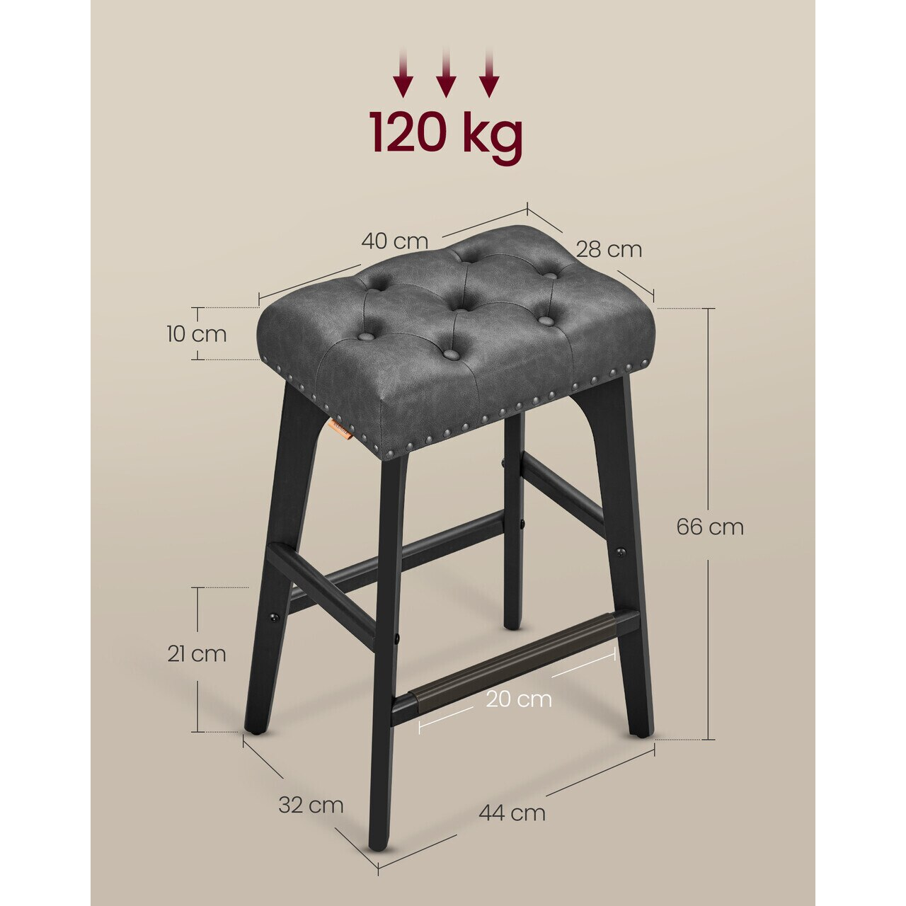 Specificatii tehnice:    Brand:  VASAGLE  Tip produs:  Set 2 scaune bar  Material sezut:  Piele ecologica (PU)  Material cadru:  Lemn masiv  Inaltime totala:  66 cm  Dimensiuni sezut:  44 x 32 cm  Dimensiuni totale:  44 x 32 x 66 cm  Culoare:  Negru  Capacitate maxima suportata:  120 kg per scaun  Stil:  Clasic-modern  Forma:  Dreptunghiulara  Numar bucati/set:  2   Scurta descriere:   Acest set de 2 scaune VASAGLE aduce o nota de eleganta in zona de bar sau dining. Tapiteria din piele ecologica neagra, detaliile cu nasturi si capse decorative, alaturi de picioarele din lemn cu suport metalic pentru picioare, creeaza un aspect sofisticat si confortabil.   Caracteristici principale:    	 Design clasic cu nasturi si capse decorative  	 Sezut moale, cu spuma de inalta densitate  	 Suport pentru picioare cu protectie metalica  	 Picioare solide din lemn cu picioruse reglabile  	 Piele ecologica rezistenta si usor de curatat  	 Montaj rapid si simplu