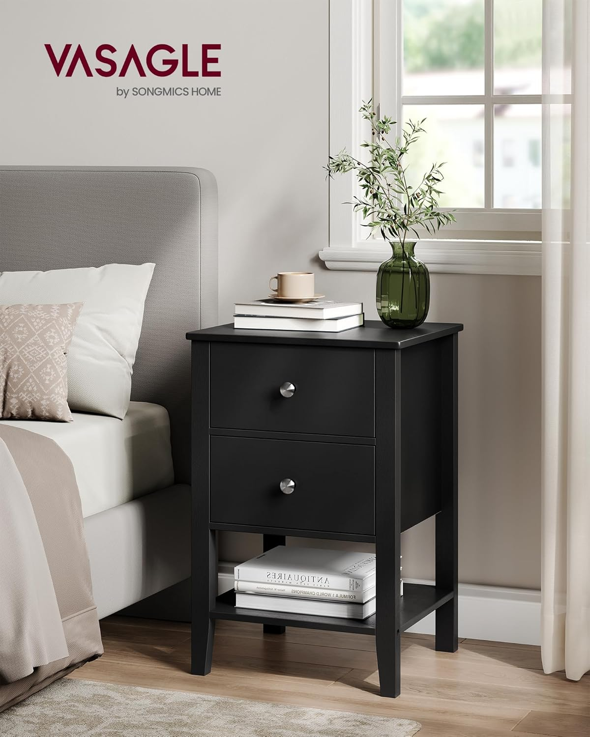 Specificatii: Culoare: NegruMaterial: Bambus, MDF, (placa de fibre de densitate medie)Dimensiunea fiecarei mese: 35 x 40 x 60 cmGreutatea fiecarei mese: 8,6 kgMax. Capacitatea de incarcare statica a blatului mesei: 45 kgMax. Capacitatea de incarcare statica a fiecarui sertar: 4,5 kgMax. Capacitatea de incarcare statica a raftului deschis: 4,5 kg Continutul pachetului: 2 x Noptiere2 x Kit de asamblare1 x Instructiuni Rezistenta bambusului Picioarele si blatul mesei din bambus natural creeaza acest set de 2 noptiere robuste care pot rezista testului timpului. Fiecare suporta confortabil pana la 45 kg pe blatul mesei si inca 4,5 kg pentru fiecare sertar si raft Eleganta minimalista Fiecare masuta, cu liniile sale curate si culoarea negru cerneala, intruchipeaza principiul less is more. Exudand un farmec atemporal, se integreaza fara efort in orice spatiu, fie ca este vorba de dormitor, camera de zi sau un spatiu mic Spatiu amplu de depozitare Mentineti un spatiu ordonat si organizat cu acest set de 2 noptiere. Fiecare se mandreste cu o suprafata superioara spatioasa pentru lampa dvs. sau obiecte decorative, 2 sertare pentru a va ascunde obiectele personale si un raft deschis pentru a va pastra cartile la indemana Intretinere usoara Aceste masute de noptiera promit o intretinere usoara datorita suprafetelor vopsite rezistente la apa. O simpla stergere cu o carpa umeda este tot ce este necesar pentru a le pastra aspectul proaspat si nou, economisindu-va timp si efort Asamblare usoara Uitati de asamblarea complexa. Cu piese care sunt clar etichetate si instructiuni usor de urmat, asamblarea acestor noptiere este o plimbare in parc
