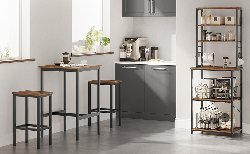 Specificatii: Culoare: Maro rustic, Negru Material: Placi aglomerate MDF, Otel Dimensiunea mesei de luat masa: 60 x 60 x 90 cm (D x L x H) Dimensiunea unui scaun de sufragerie: 30 x 40 x 65 cm (D x W x H) Greutate totala: 19,1 kg Max. Capacitatea de incarcare statica a mesei: 100 kg Max. Capacitate de incarcare statica pe scaun: 120 kg Despre acest articol Fie ca doriti sa creati o mica zona de luat masa in bucatarie, un bar de cafea pentru a savura bauturi casual sau chiar un mic atelier in casa dvs. acest set de mese de bar este alegerea perfecta pentru toate optiunile. Cu o masa de 60 x 60 x 90 cm si scaune de cate 30 x 40 x 65 cm, acest set de mese ocupa putin spatiu si este perfect pentru casele mici. Introduceti scaunele si ascundeti-le sub masa pentru a economisi spatiu.Placa de particule de inalta calitate si un cadru solid din otel, intarit de traversele inferioare, creeaza o structura solida. Picioarele reglabile ale mesei de bar si tampoanele anti-inclinare ale scaunului de bar sporesc si mai mult stabilitatea setului.Atat masa de bar, cat si scaunele vin cu suporturi pentru picioare, permitandu-va sa va relaxati picioarele atunci cand stati jos. Combinatia perfecta de practicitate si confort intr-un singur set de masa.