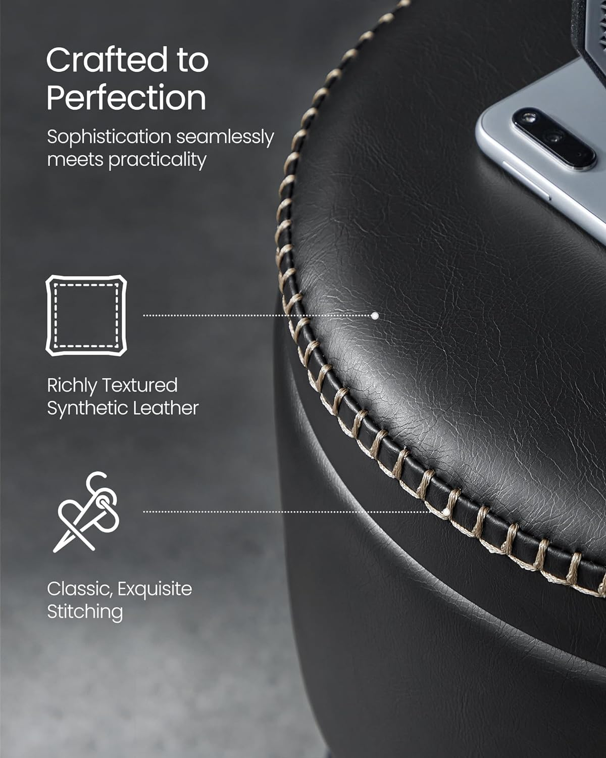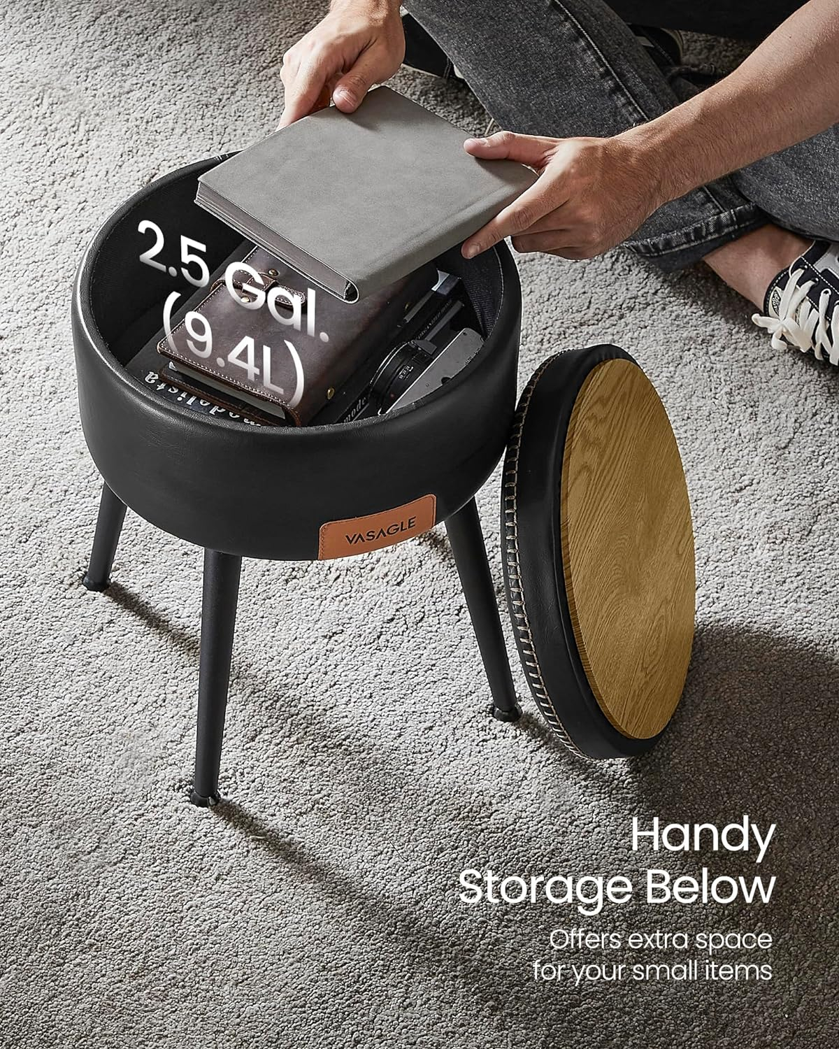 Specificatii: Culoare: negruMateriale:Otel, spuma de inalta rezilienta 25D, PU (poliuretan), placajDimensiuni: 38,2 x 44,4 cm (⌀ x H)Diametrul scaunului: 32 cmGreutate: 3,3 kgCapacitate maxima de incarcare statica: 150 kg Continutul pachetului: 1 x taburet de depozitare1 x Kit de montare1 x Instructiuni de utilizare Farmec si versatilitate Aceasta piesa de mobilier poate fi folosita ca taburet pentru masuta de toaleta, ca suport de picioare pentru fotoliu sau pur si simplu ca masuta laterala prin intoarcerea partii superioare. Cu un volum de 9,4L, este perfecta pentru depozitarea obiectelor dvs. mici. Imbogateste-ti spatiul Bucura-te de aceasta combinatie de PU, cusaturi rafinate si picioare conice ale acestui otoman de depozitare din colectia VASAGLE EKHO, un omagiu concret adus spiritului artizanal, care iti inalta locuinta pe noi culmi de eleganta. Facut pentru a rezista Acest taburet de toaleta are 4 picioare din otel robust si este ranforsat cu un strat de perete gros de 1,2 mm. Acest taburet de depozitare ofera un sezut comfortabil care rezista in timp, fara a-si pierde forma. Usor de asamblat si de curatat Instalarea este o joaca de copii: pur si simplu fixati picioarele si fiti gata sa faceti senzatie cu noul dvs. taburet. In plus, suprafata sa din piele ecologica de calitate il face usor de curatat si ramane impecabila cu un efort minim.
