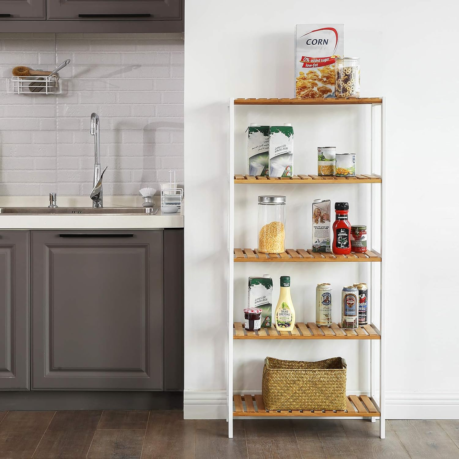 Etajera cu 5 niveluri realizata din bambus natural, conceputa pentru organizare eficienta in diverse spatii ale locuintei. Designul multifunctional permite utilizarea in baie, hol, bucatarie, living sau balcon. Rafturile ofera stabilitate ridicata si permit scurgerea apei, prevenind deformarea materialului si prelungind durata de utilizare. Structura aerisita adauga un aspect natural si ordonat incaperii.