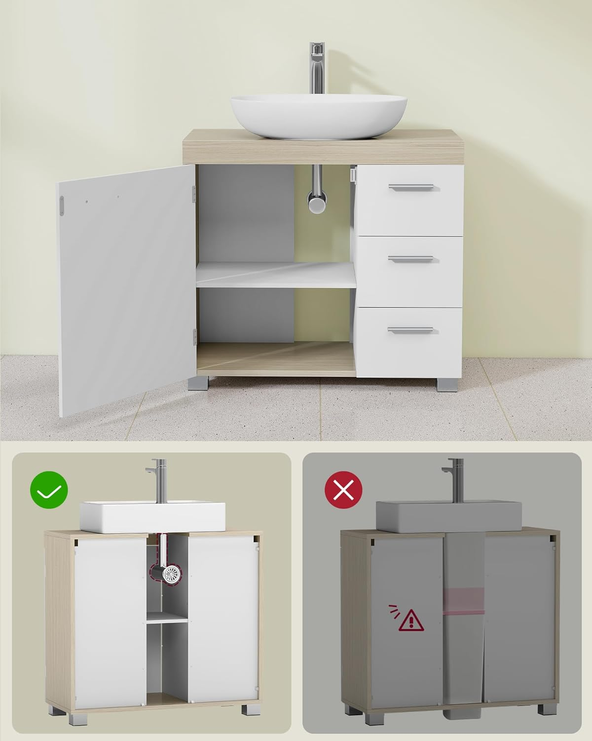 Dulapul de baie VASAGLE este conceput pentru a valorifica eficient spatiul de sub lavoar. Ofera 3 sertare mari pentru organizare detaliata si un dulap cu raft reglabil pentru produse voluminoase. Designul in nuante alb cloud si bej natural adauga luminozitate si echilibru baii.