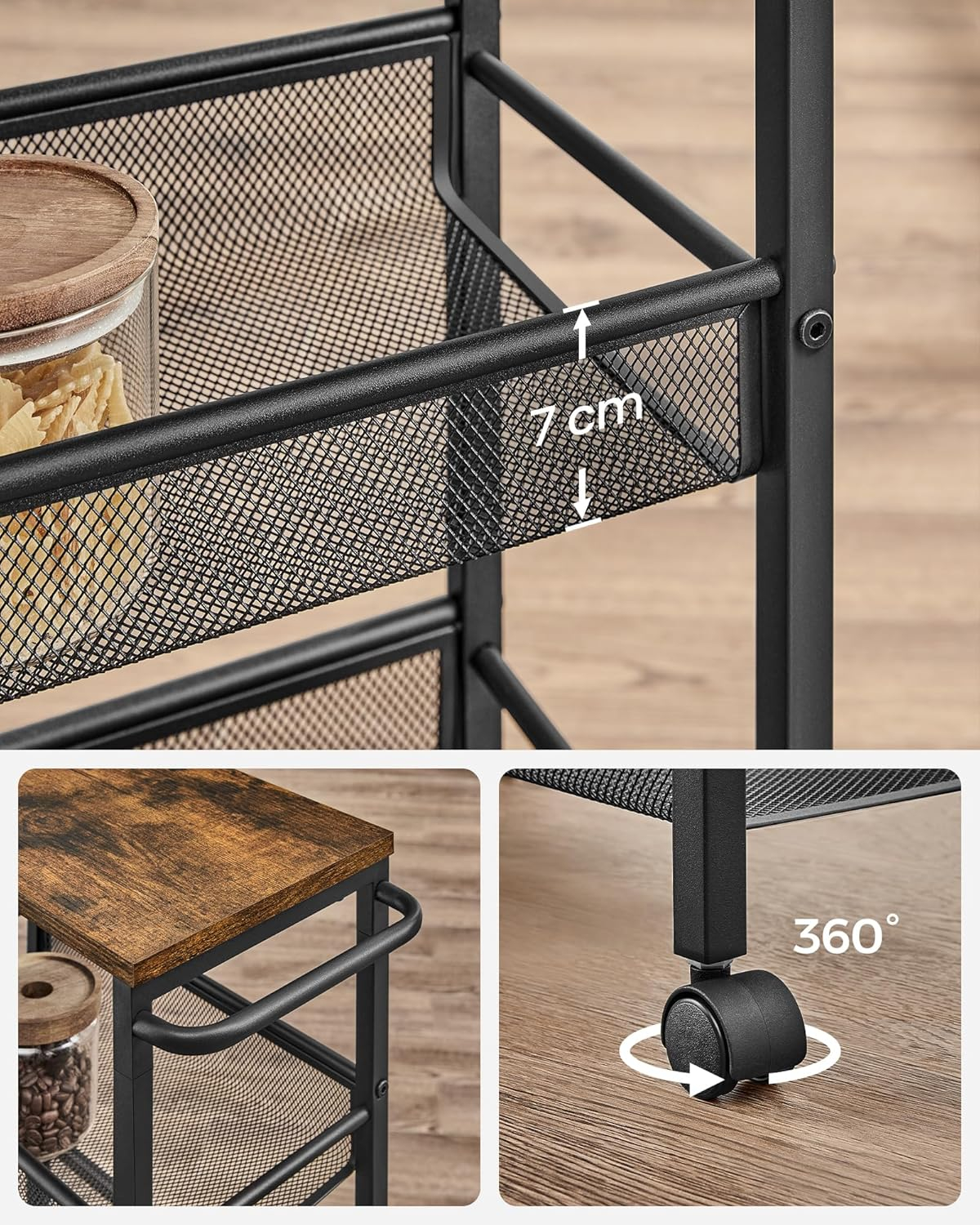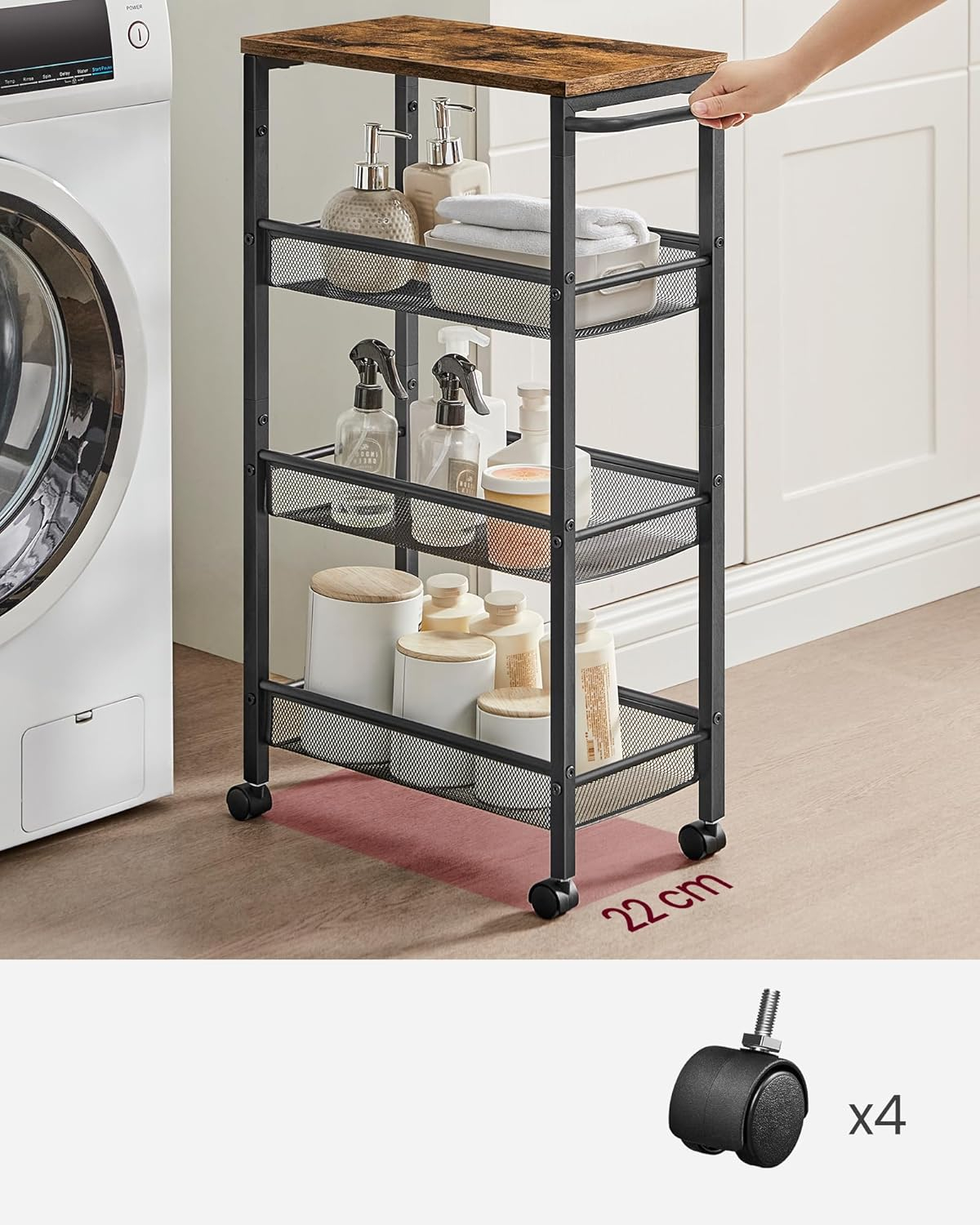 Caruciorul de bucatarie ingust este ideal pentru utilizarea eficienta a spatiilor mici. Cu 4 niveluri si roti, permite organizarea practica si acces rapid la obiecte, fiind usor de mutat in orice incapere.