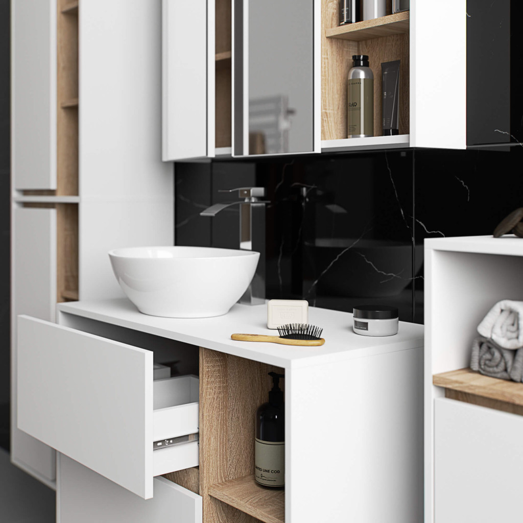 Dulapul suspendat pentru baie Vami W90 ofera un design elegant si functional, perfect pentru organizarea zilnica. Cele doua usi cu oglinda sunt ideale pentru machiaj sau ingrijire, iar cele trei rafturi interioare si cele trei rafturi deschise asigura spatiu suficient pentru cosmetice si accesorii. Combinatia de alb si stejar sonoma aduce un aspect luminos si modern in baie.