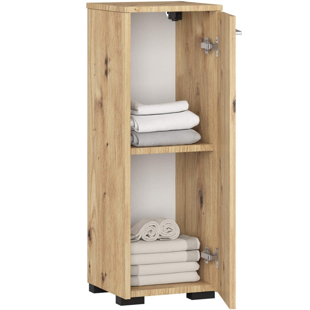 Acest dulap de baie FIN imbina naturaletea nuantei stejar artisan cu un design simplu si functional, perfect pentru spatii mici. Constructia din PAL laminat rezistent la uzura si umezeala asigura durabilitate, iar usa reversibila permite montajul in functie de configuratia baii. Cu doua compartimente interioare practice, dulapul ofera spatiu suficient pentru depozitarea prosoapelor, cosmeticelor sau accesoriilor zilnice.