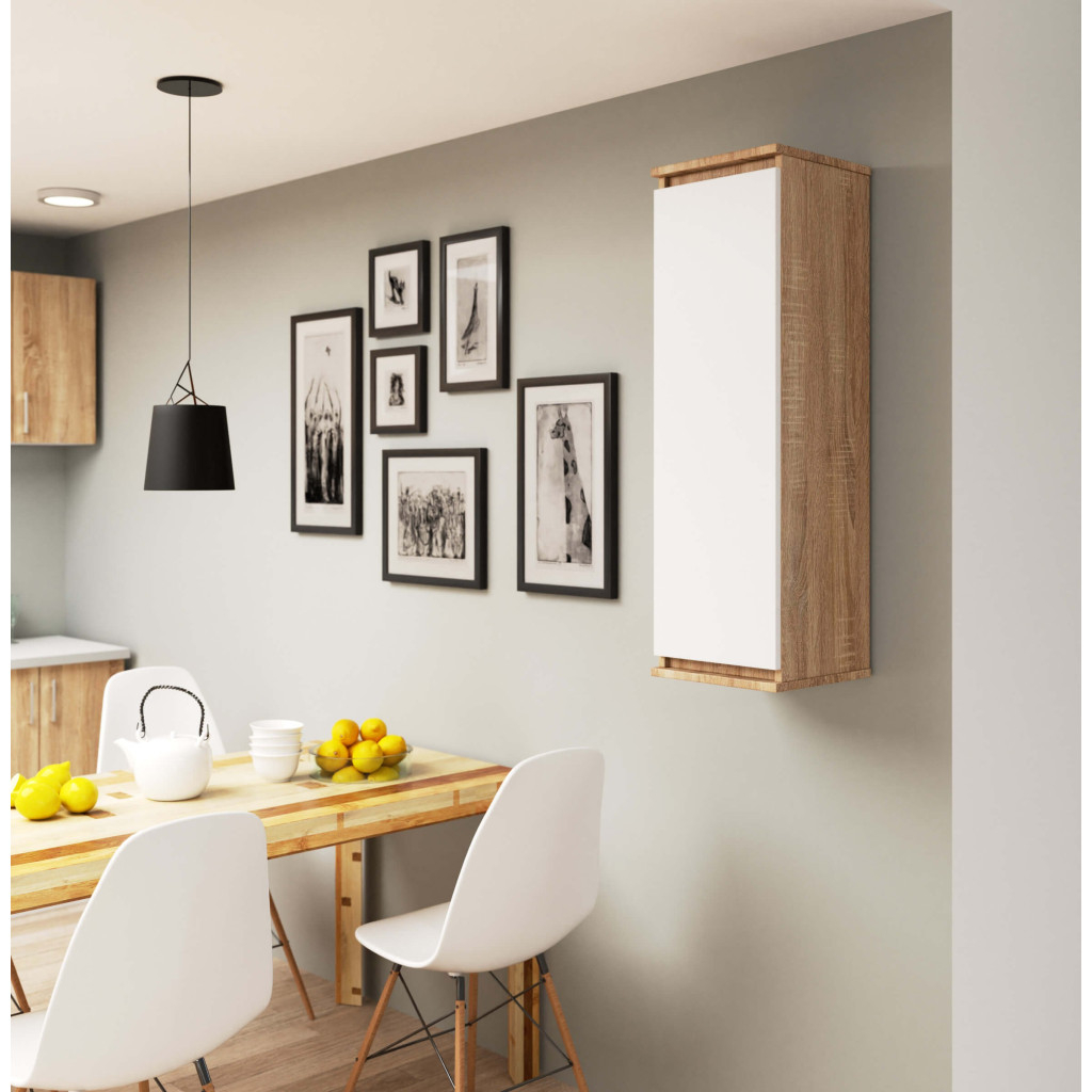 Dulapul suspendat CLP sonoma/alb este o alegere moderna si eleganta pentru spatii contemporane. Combinatia dintre textura naturala stejar sonoma si fronturile albe mate creeaza un contrast rafinat, potrivit pentru living, birou sau dormitor. Cu trei rafturi interioare spatioase, dulapul ofera un spatiu de depozitare practic si bine organizat, pastrand in acelasi timp un aspect minimalist.
