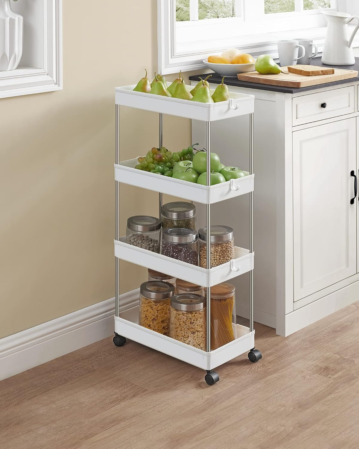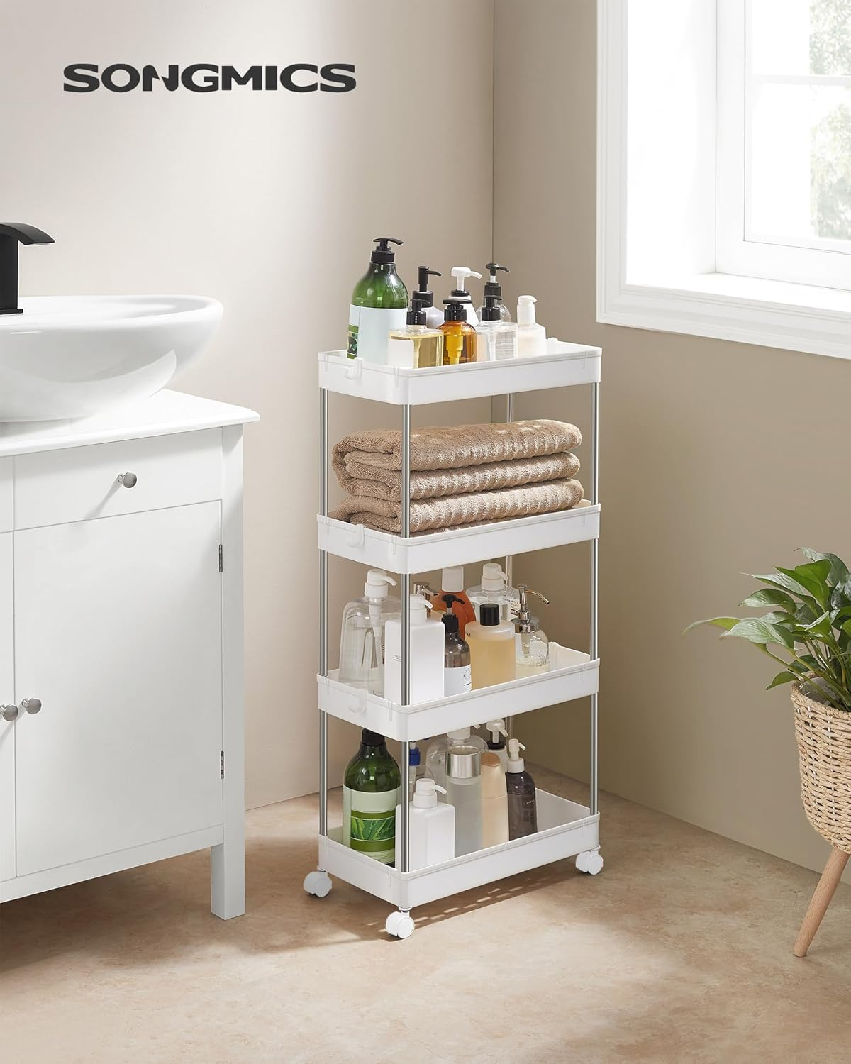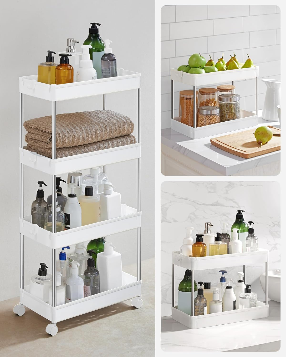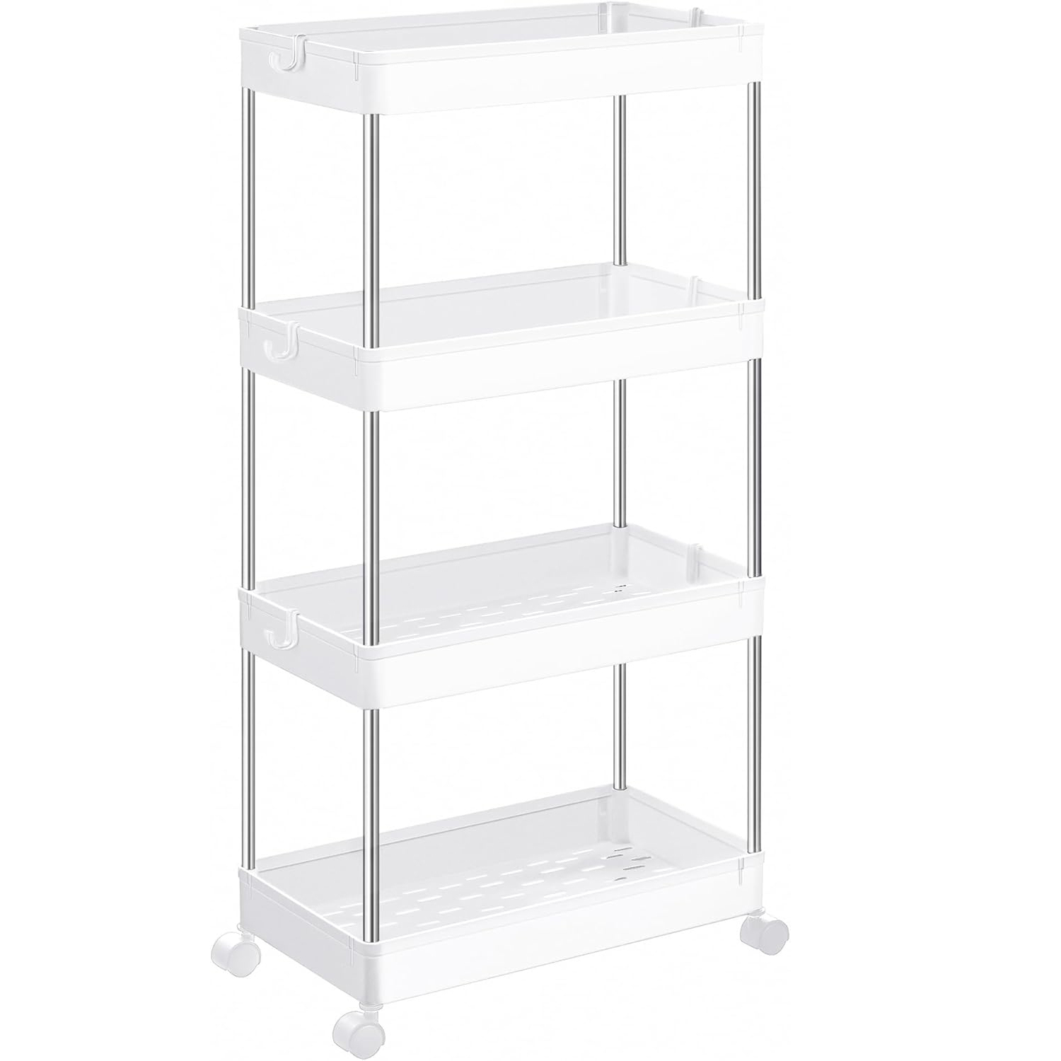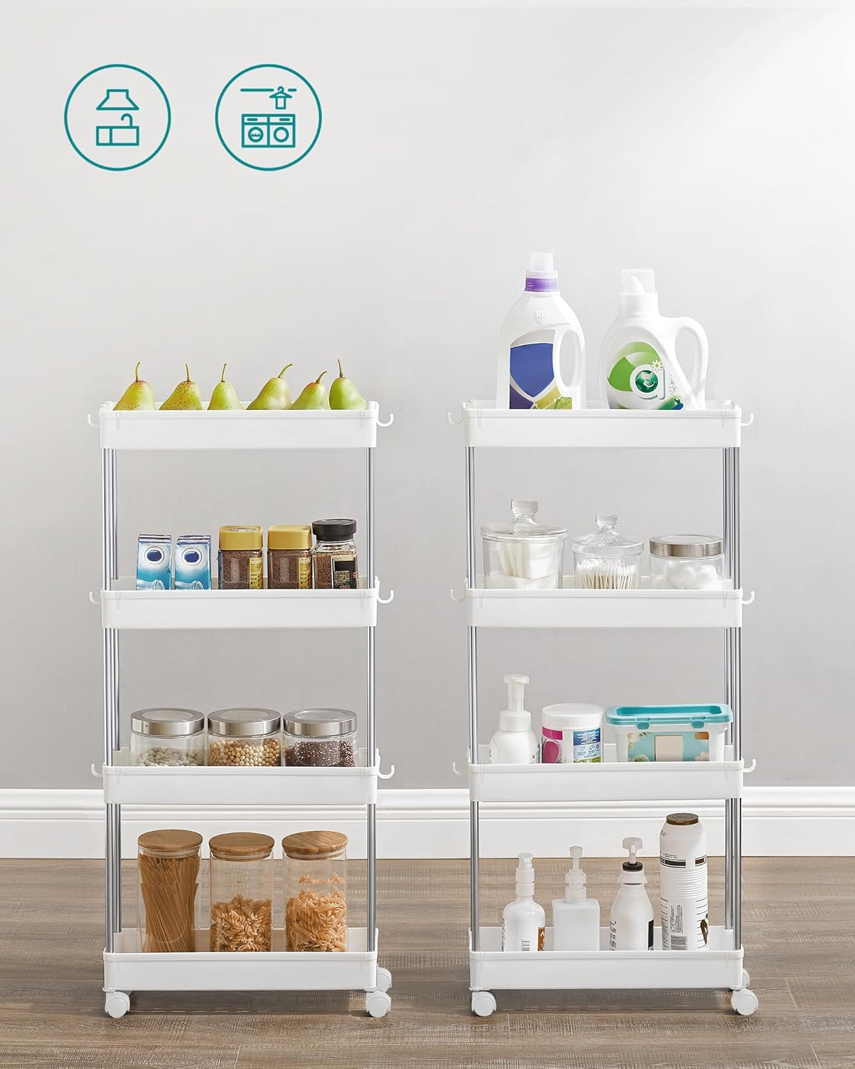 Acest carucior de depozitare cu dimensiuni de 40 x 22 x 87 cm se poate potrivi in spatiile inguste din bucatarie, baie, dormitor sau spalatorie, pentru a va ajuta sa profitati la maximum de spatiul dvs. Datorita celor 4 roti pivotante netede, puteti muta caruciorul oriunde aveti nevoie de el, folosind spatiul din colt pentru a organiza sticlele de condimente sau consumabilele de baie. Acest carucior este prevazut cu 6 carlige detasabile pentru a agata manusi sau spatule pentru acces usor si depozitare flexibila. Caruciorul cu 4 niveluri poate fi impartit in doua rafturi cu 2 niveluri, sau o tava si un carucior cu 3 niveluri, astfel incat sa puteti decide daca sa le utilizati – pe chiuveta pentru consumabilele de baie sau pe blatul de bucatarie pentru a tine sticle, oale si tigai. Cu instructiuni ilustrate si piese usor de distins, acest raft de depozitare din plastic cu 4 niveluri este usor de asamblat fara unelte.