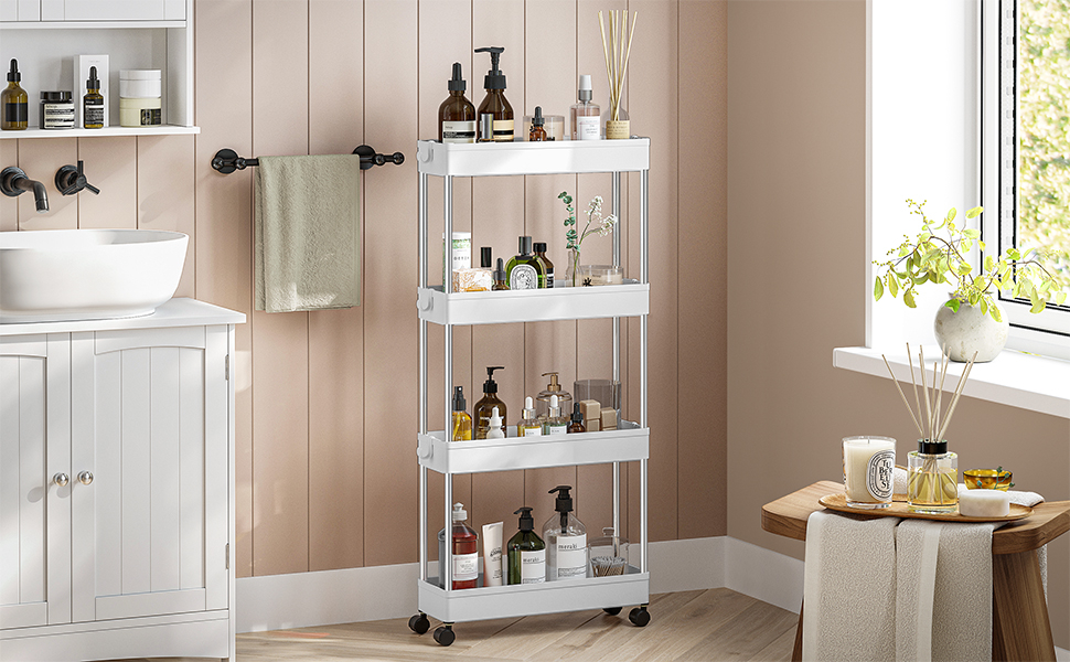 Datorita celor 4 roti pivotante netede, puteti muta caruciorul oriunde aveti nevoie de el, utilizand spatiul din colt pentru a organiza sticlele de condimente sau consumabilele pentru baie.