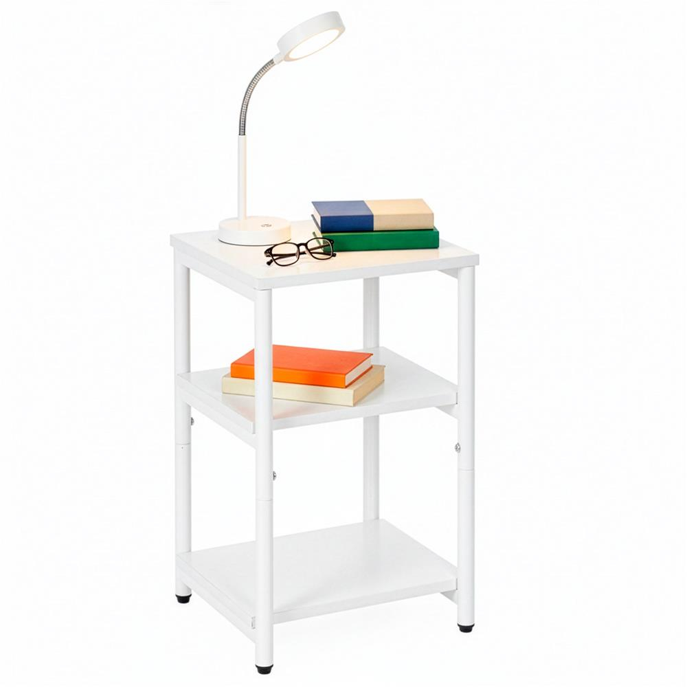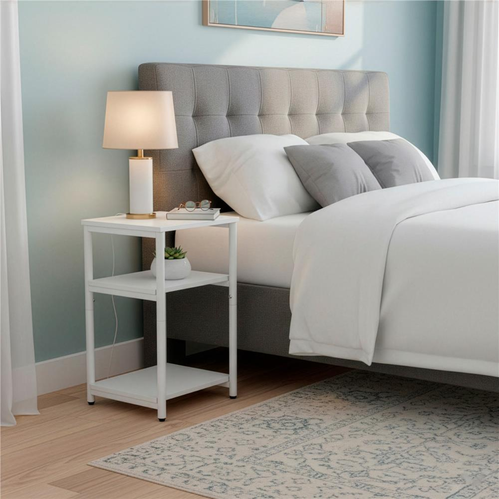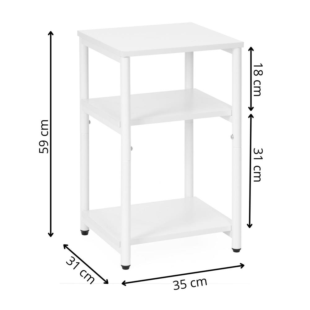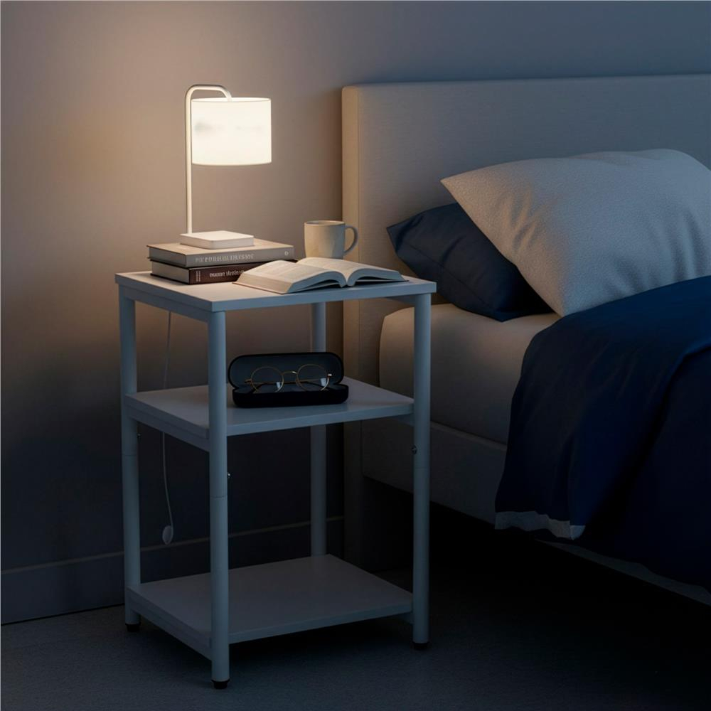 Noptiera compacta cu 3 rafturi, ideala pentru organizarea obiectelor esentiale langa pat. Constructia metalica ofera stabilitate, iar rafturile din PAL sunt potrivite pentru carti, lampa de veghe sau accesorii personale.