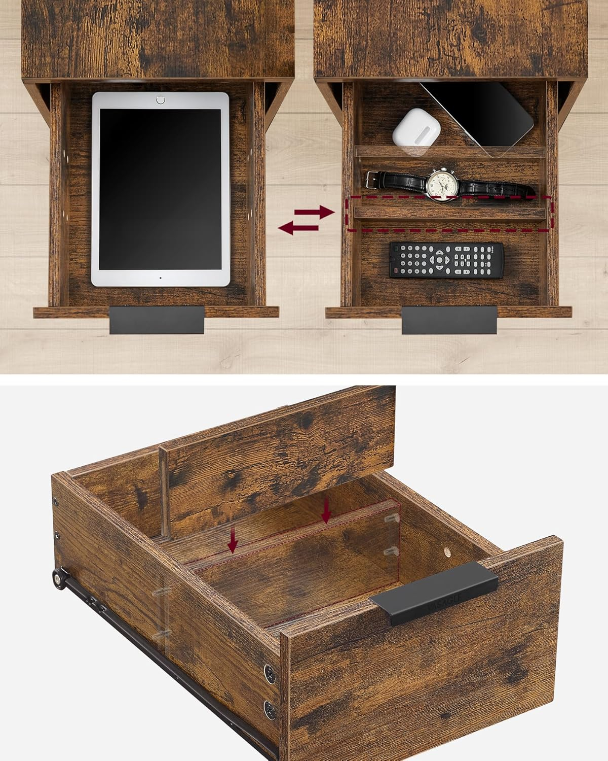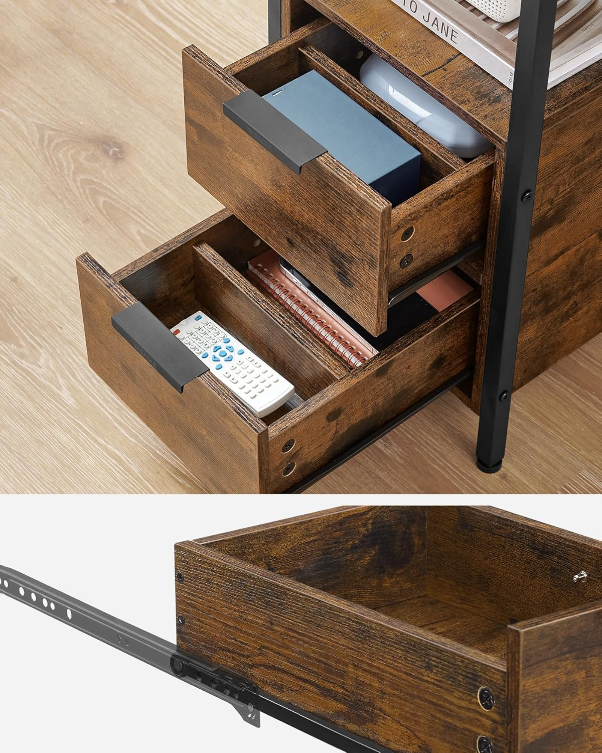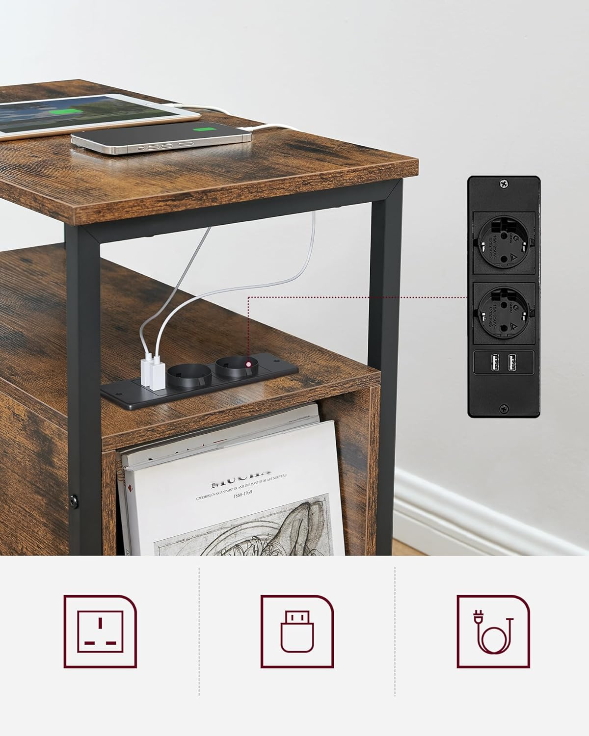 Noptiera VASAGLE combina designul modern cu functionalitatea inteligenta. Dotata cu priza integrata si porturi USB, iti permite sa iti incarci dispozitivele direct langa pat sau canapea. Spatiile de depozitare includ sertare, rafturi si un suport pentru reviste, oferind organizare eficienta intr-un format compact.