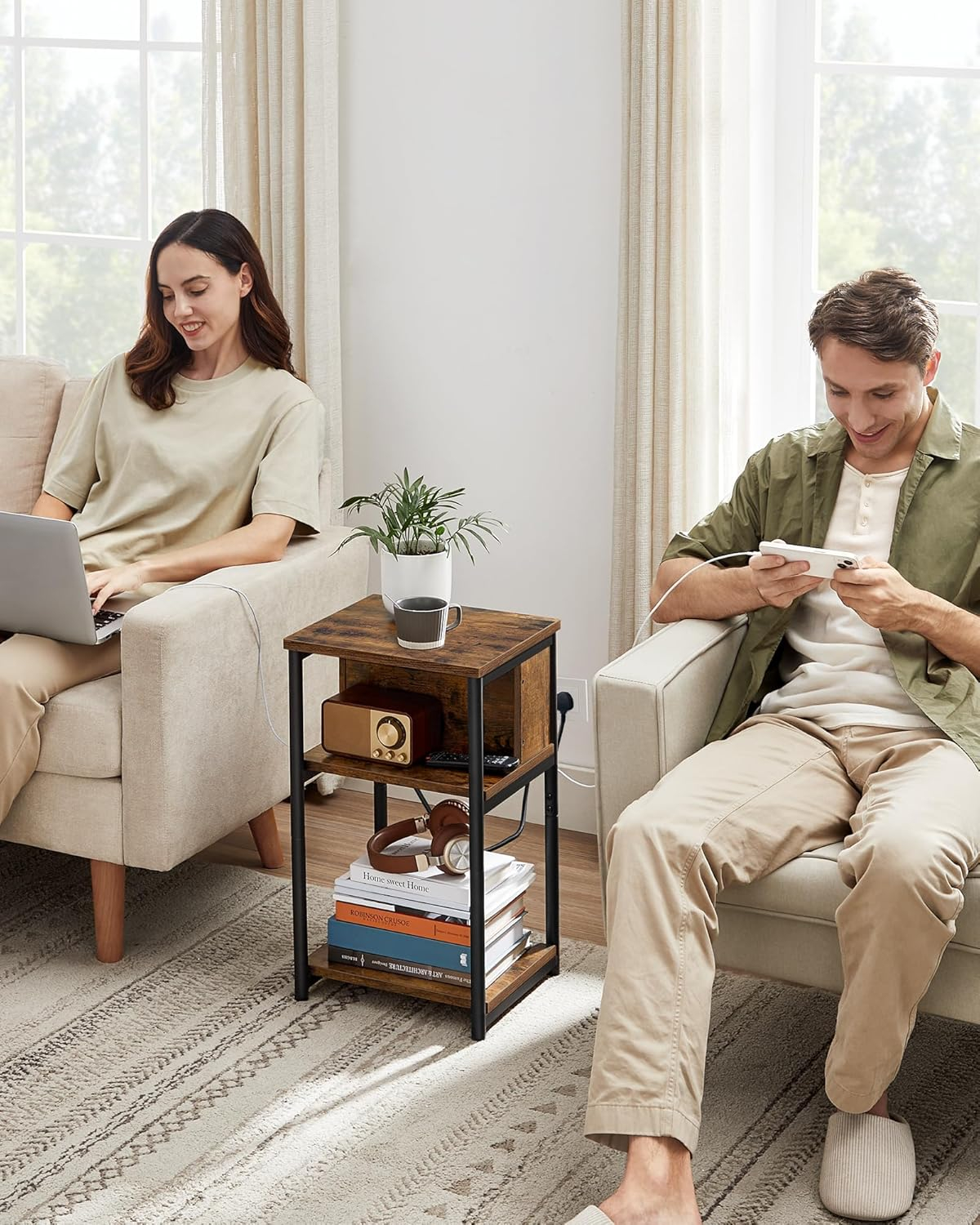 Noptiera VASAGLE cu priza integrata este solutia practica pentru dormitor sau living. Ofera 2 prize AC si 2 porturi USB, astfel incat iti poti incarca telefonul, tableta sau alte dispozitive direct langa pat. Designul slim economiseste spatiu, iar cele 3 rafturi permit organizarea eficienta a obiectelor esentiale.